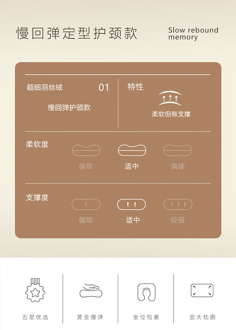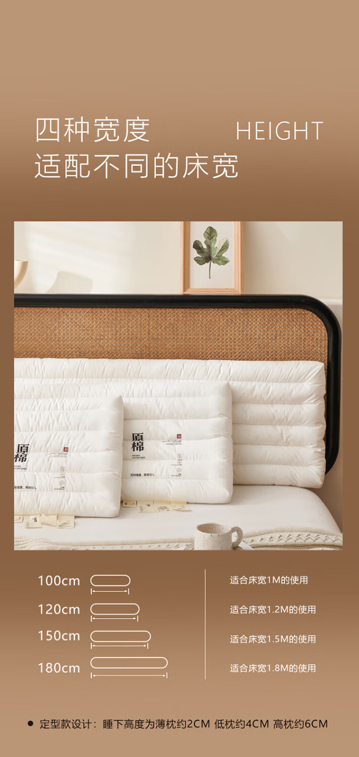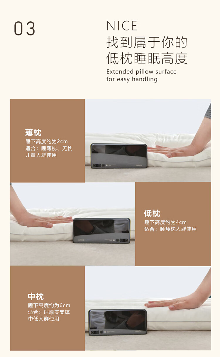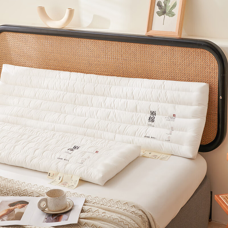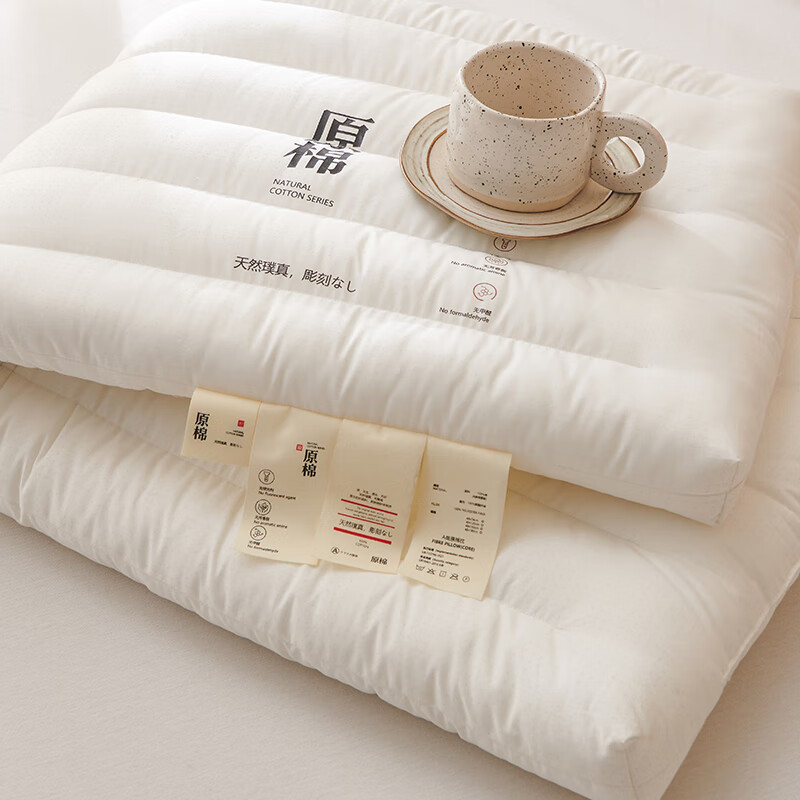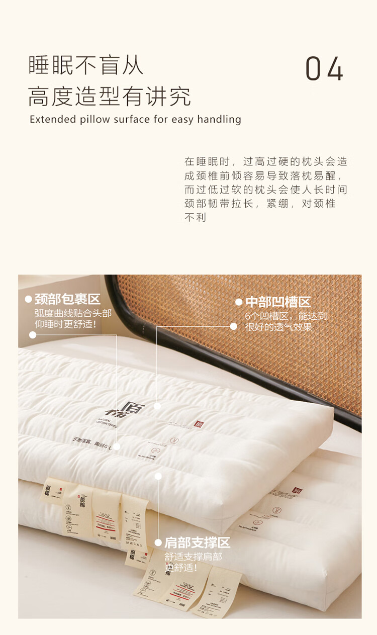 A类全棉不染面料,无甲醛,无芳香胺,无银光剂无漂染;柔软服帖的手感,脖肩颈自然无缝贴合,告别颈椎悬空;超细纤维填充,柔软高弹性,宽大枕面;五道分区隔断,解放睡姿轻松入睡;
