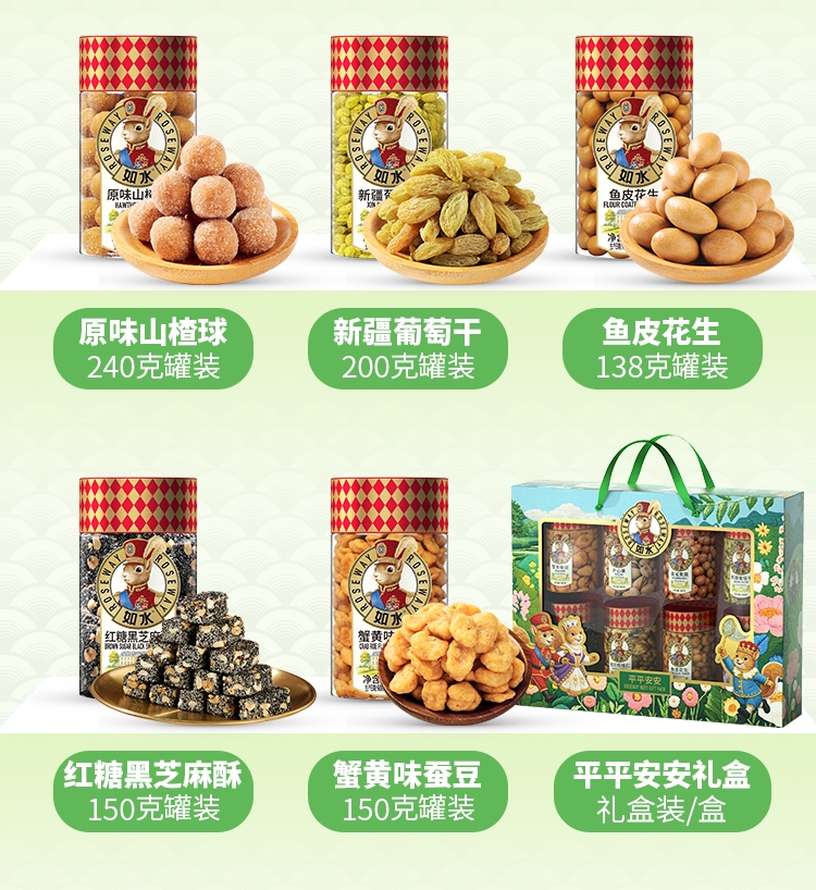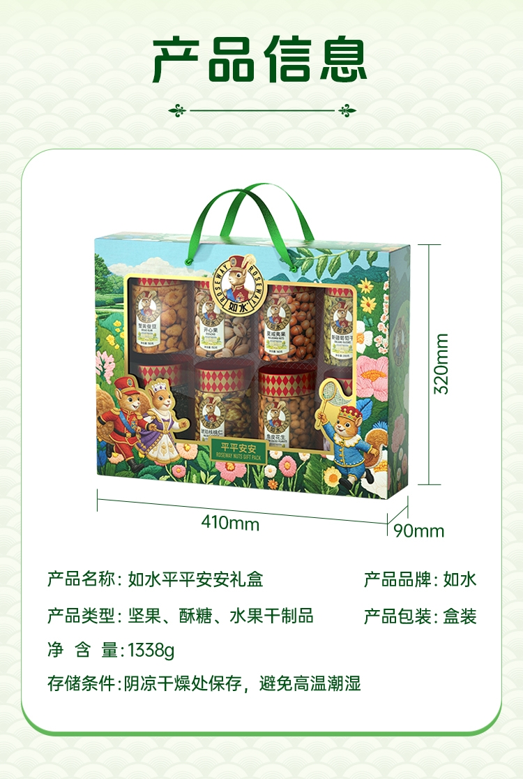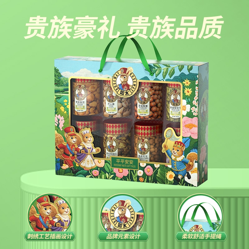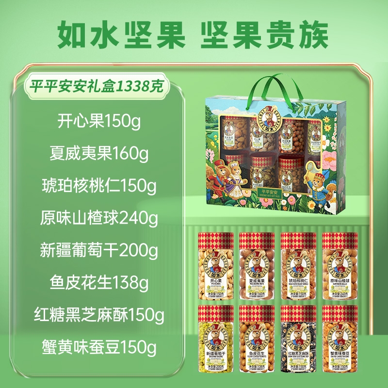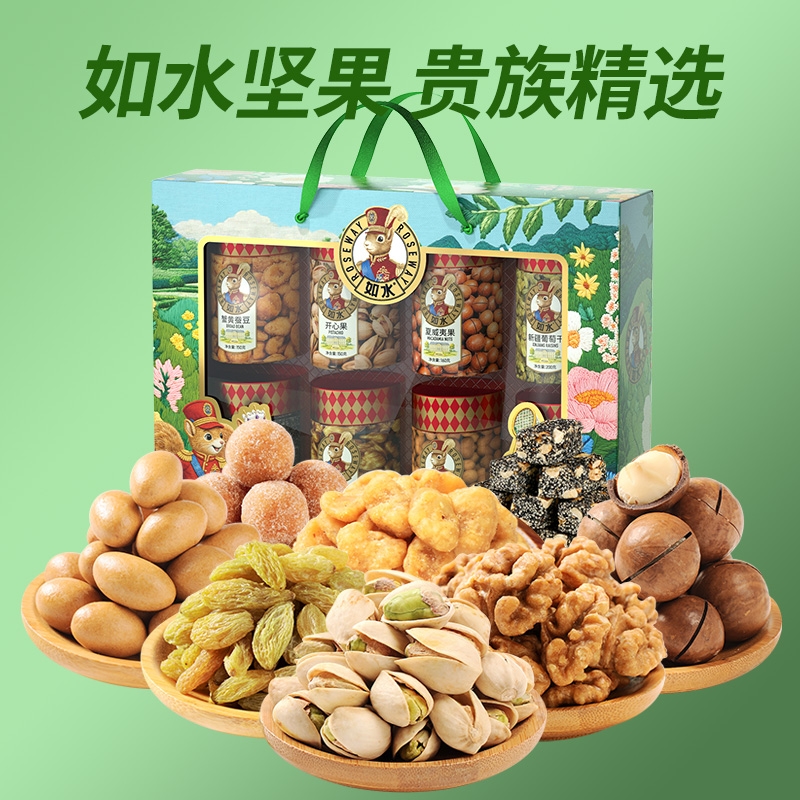 如水坚果全球原产地直采,只挑选高等级高品质原材料;5种坚果炒货+2种蜜饯果干+1种酥糖;8种美味一次享受。如水坚果零食大礼包,有甜有咸滋味;;节日送礼送领导送长辈,春节端午中秋员工礼品福利