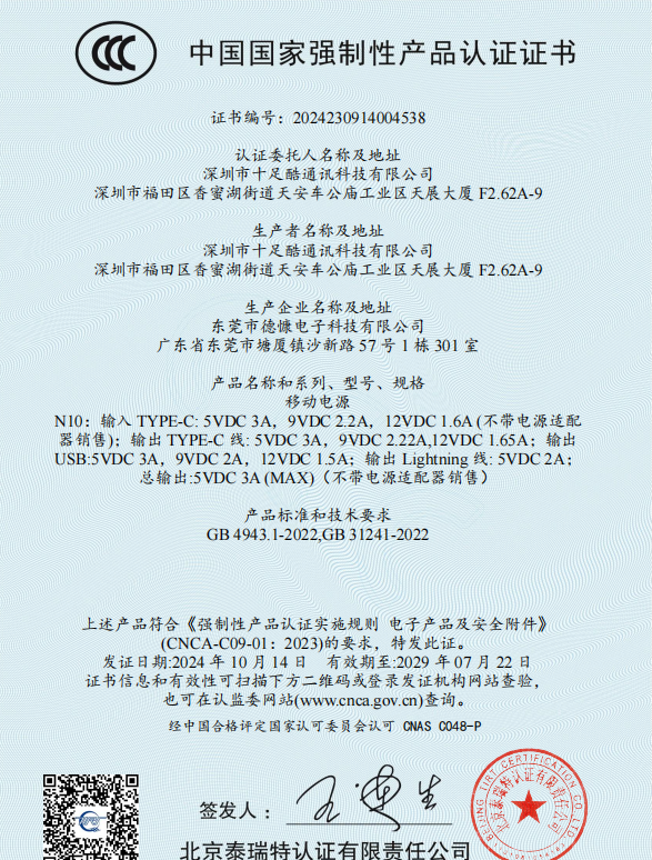 级快充22.5W,自带华为苹果快充线,苹果20W,;聚合物电芯, 超薄10000mAh;字电量显示、 Type-C双向充电
