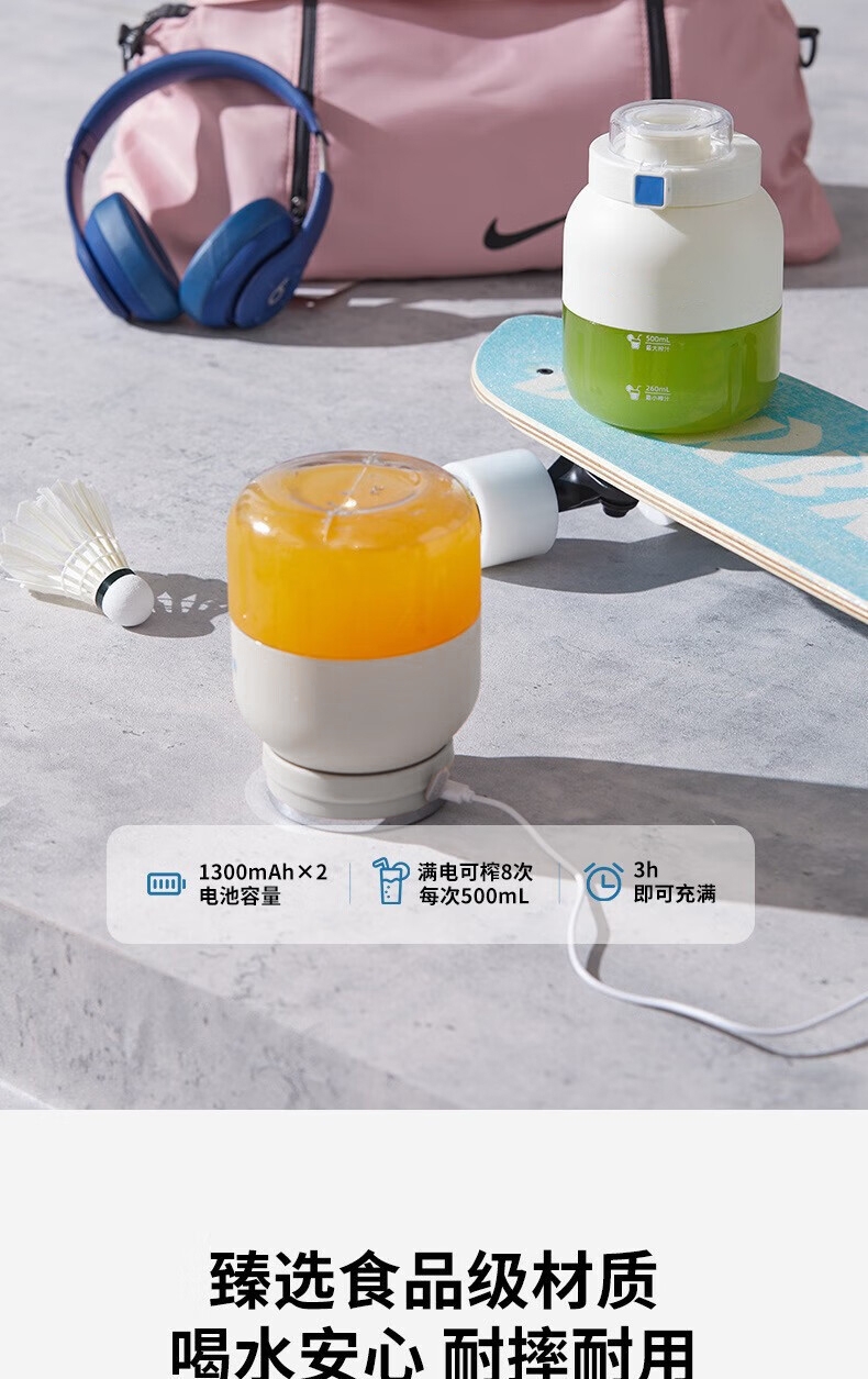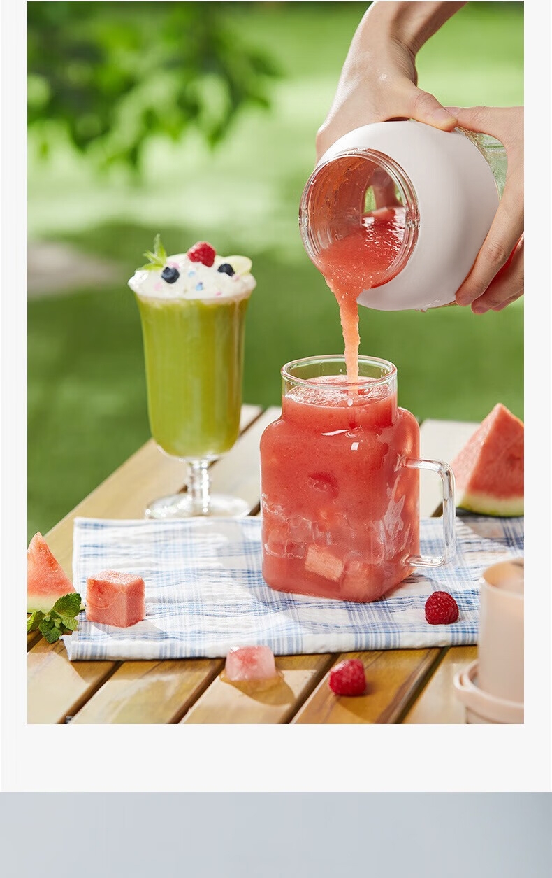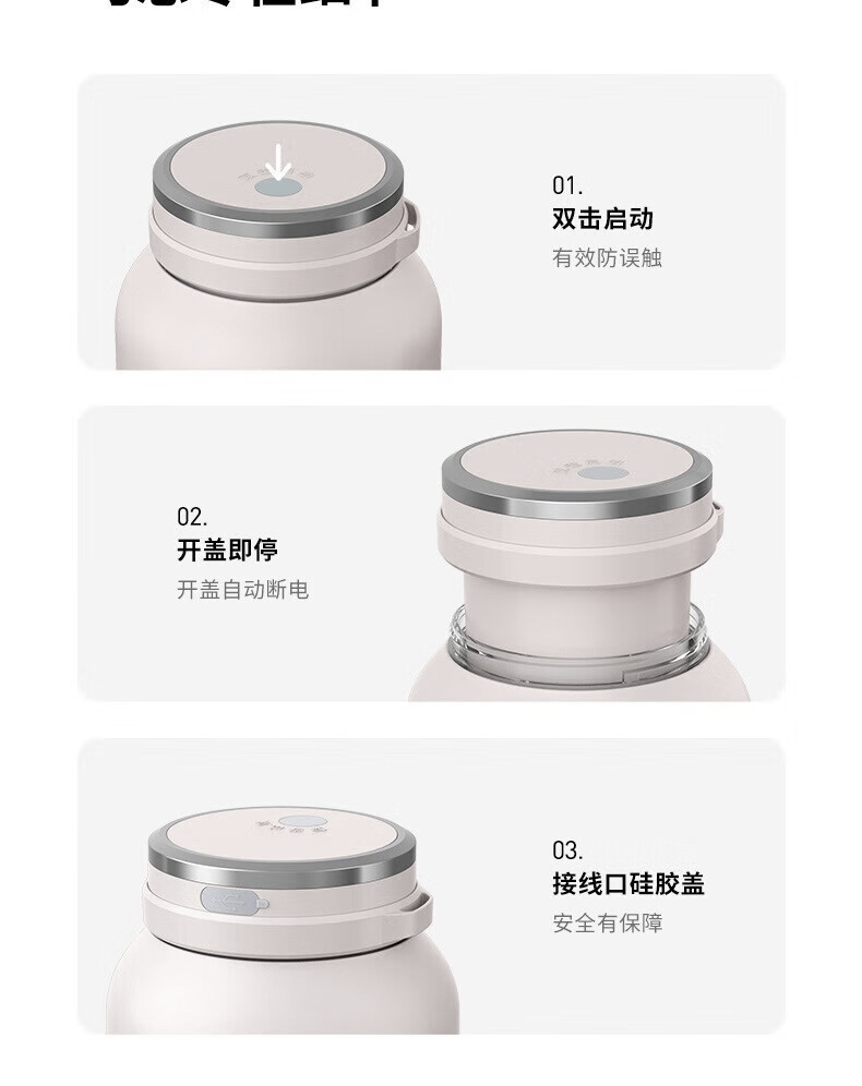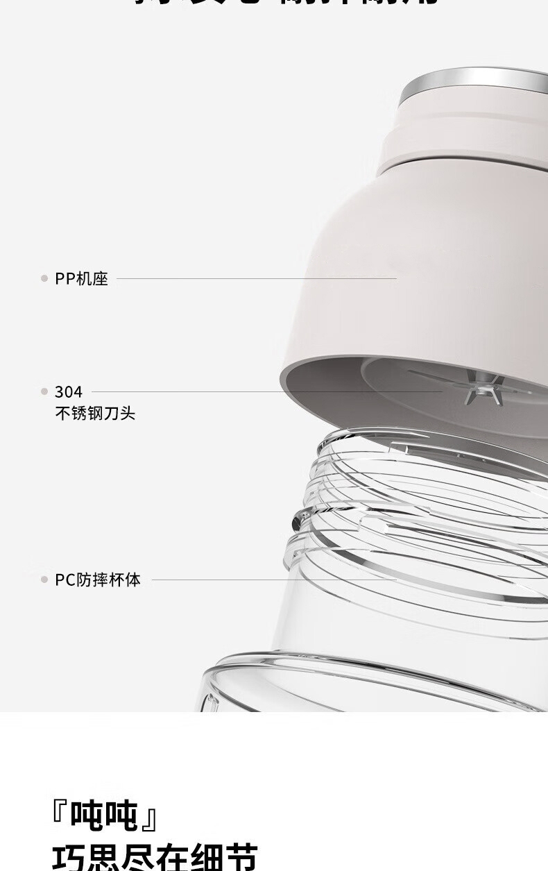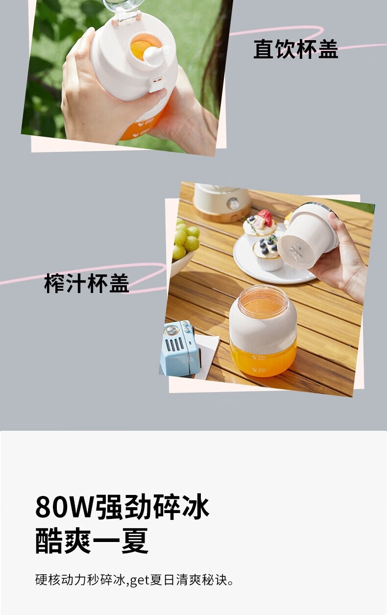 便携充电设计,搭配电动杯盖跟吸管杯盖,切换自如,双;强劲碎冰,酷爽一夏,硬核动力秒碎冰;800ml畅饮容量,移动补水仓;采用SUS304不锈钢四页锯齿刀片,刀轴采用螺旋式;开关采用双击式开关,力度轻、接触好、开关灵敏、寿命