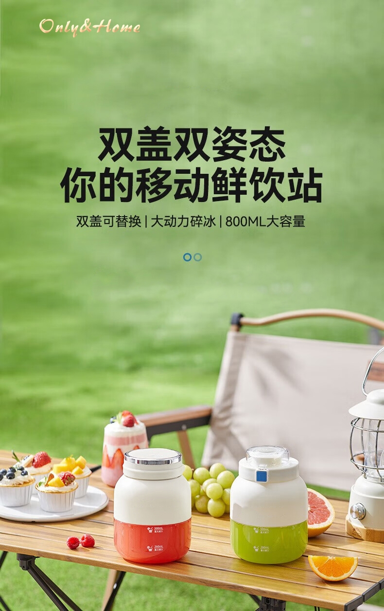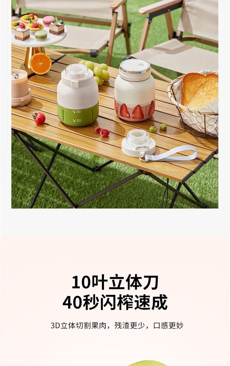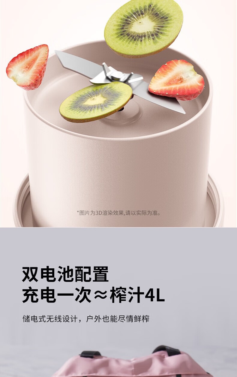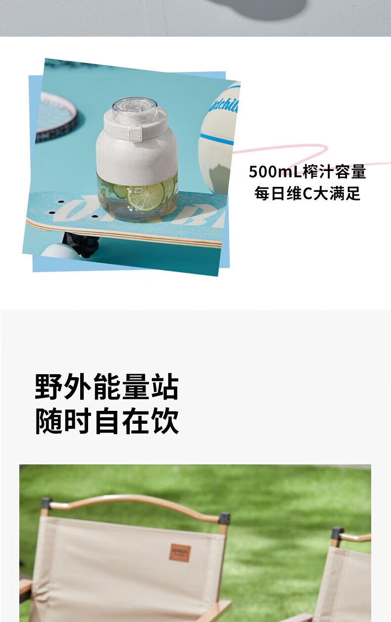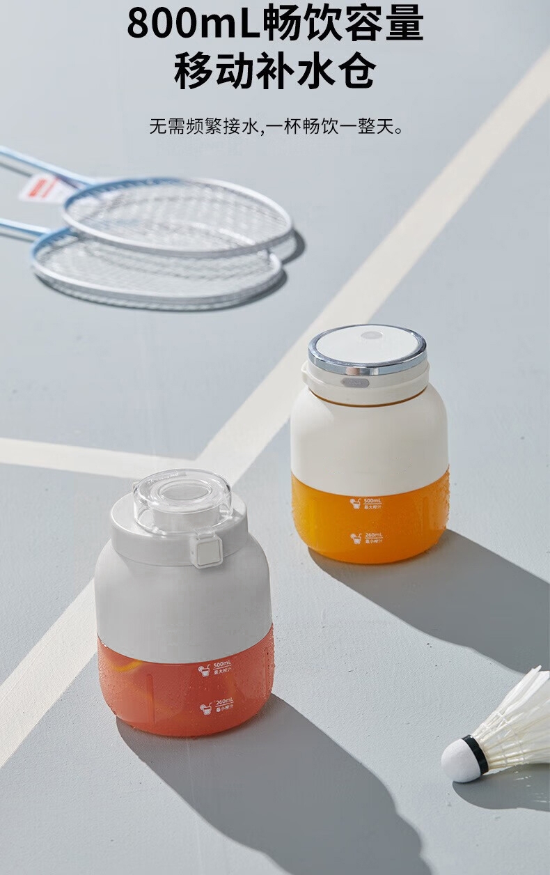 便携充电设计,搭配电动杯盖跟吸管杯盖,切换自如,双;强劲碎冰,酷爽一夏,硬核动力秒碎冰;800ml畅饮容量,移动补水仓;采用SUS304不锈钢四页锯齿刀片,刀轴采用螺旋式;开关采用双击式开关,力度轻、接触好、开关灵敏、寿命