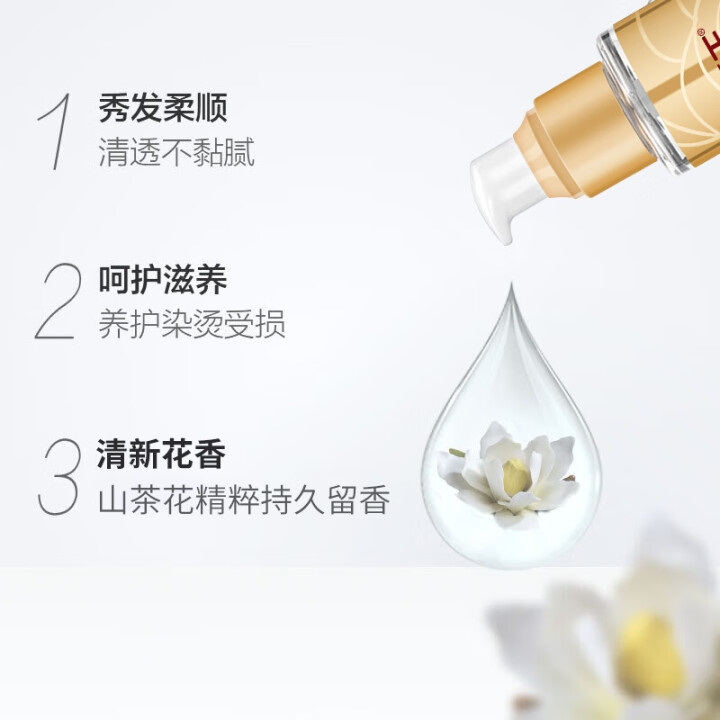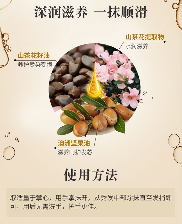 抚平毛发干枯毛躁,清透舒爽;发丝悦享滋养弹润,润而不腻;山茶花提出物,山茶籽油、澳洲坚果油酸乙酯等;适合多种发质使用