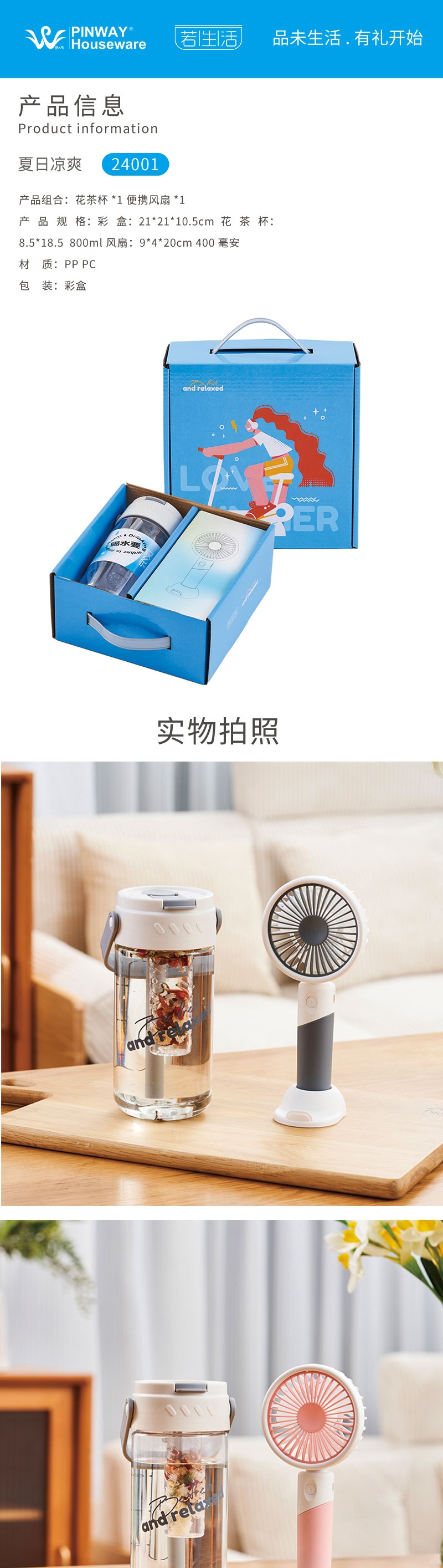 产品规格:彩盒21*21*10.5cm、花茶杯8.5*18.5 800ml、 风扇9*4*20cm