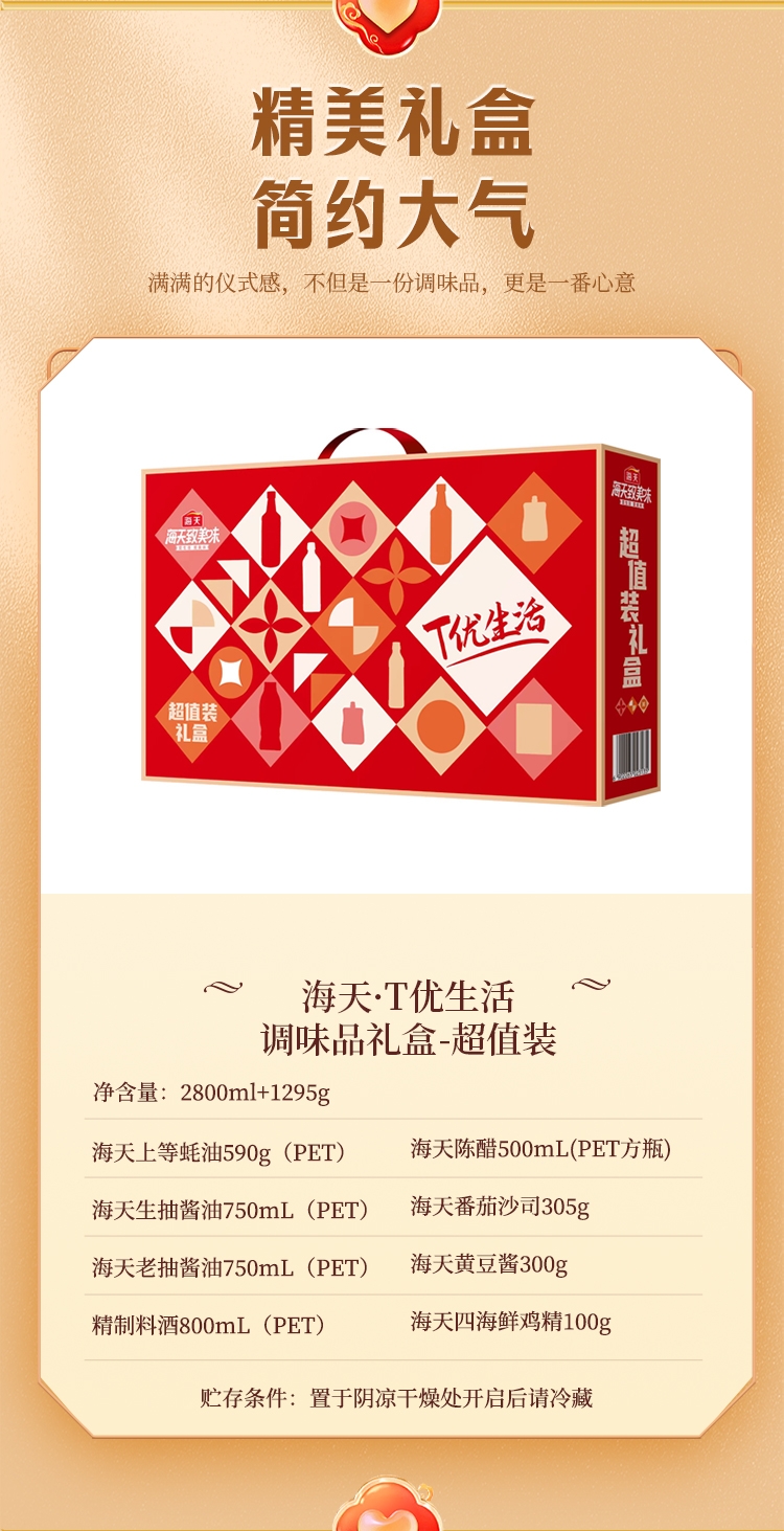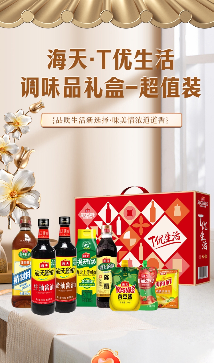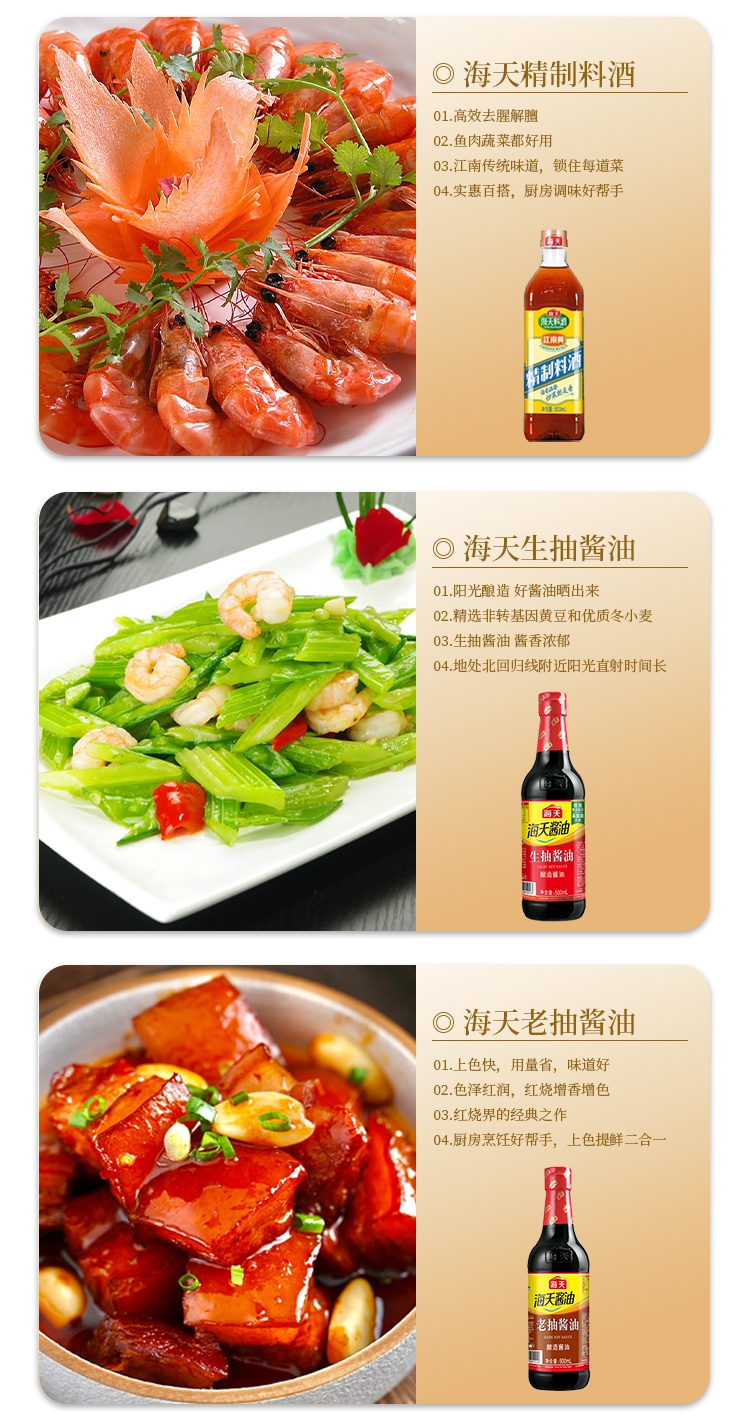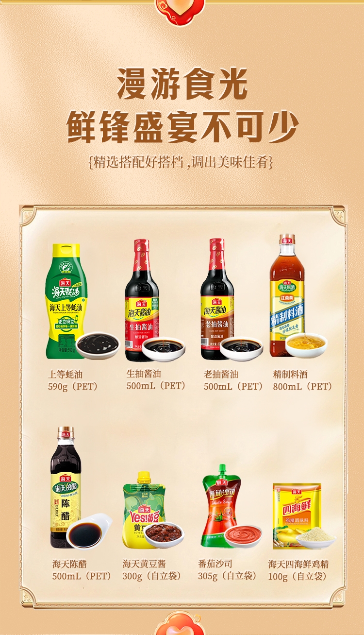 配置清单:海天上等蚝油590g(PET) 海天生抽酱油750mL(PET) 海天老抽酱油750mL(PET) 精制料酒800mL(PET) 海天陈醋500mL(PET方瓶) 海天番茄沙司305g 海天黄豆酱300g 海天四海鲜鸡精100g