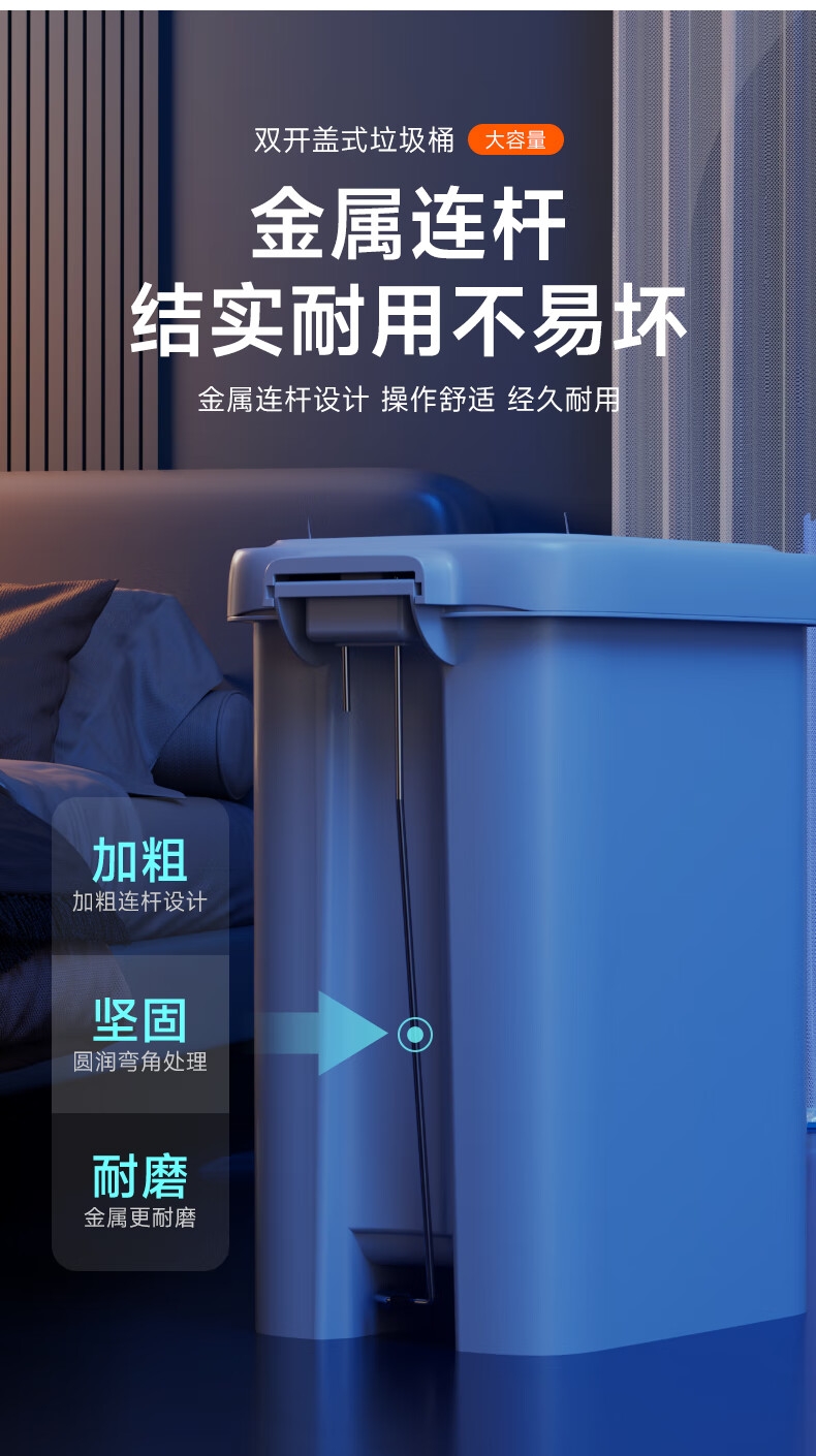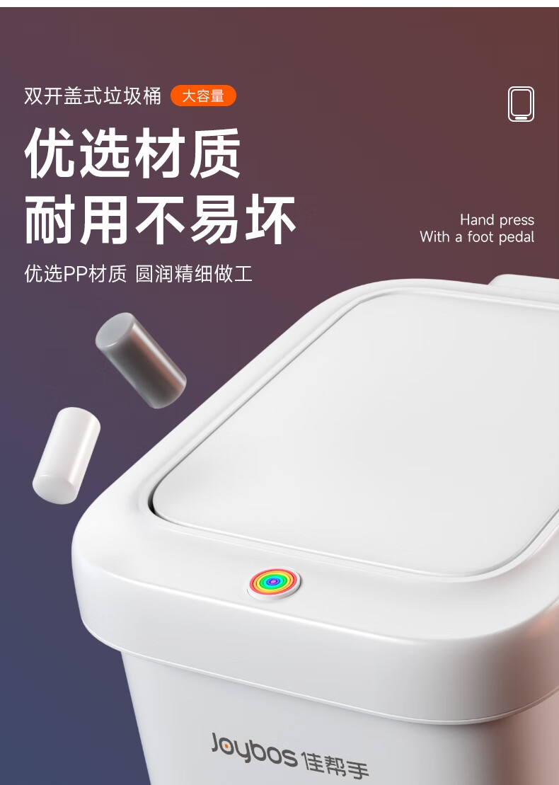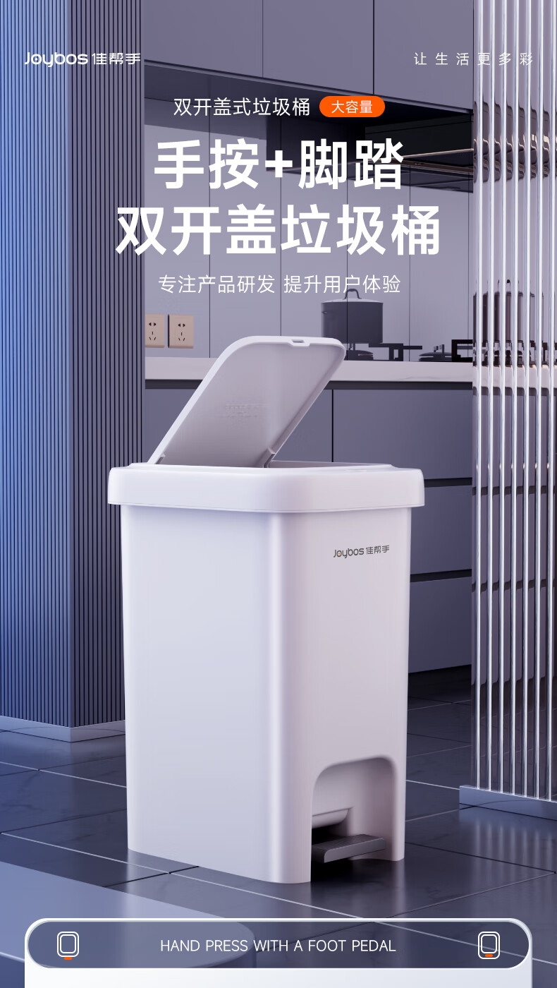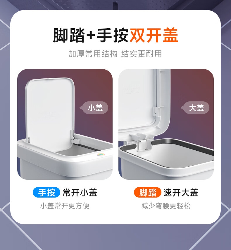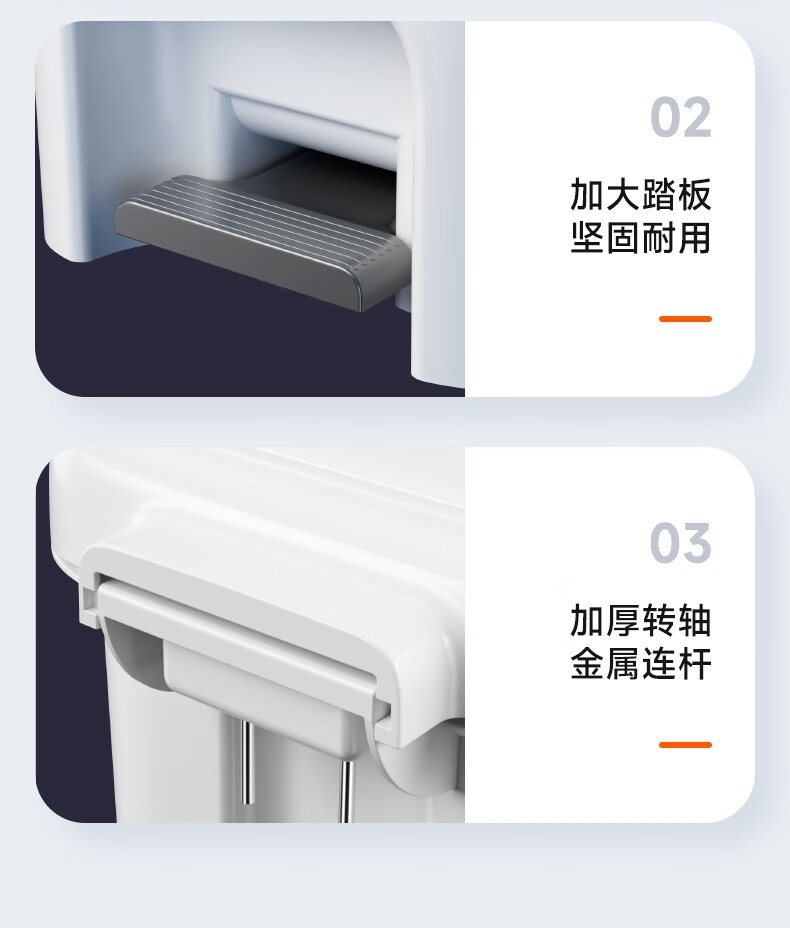 手按+脚踏双开盖垃圾桶,专注产品研发,提升用户体验;经典再现极简双开盖设计,极简灰白配色,美观大气;加厚常用结构,结实更耐用