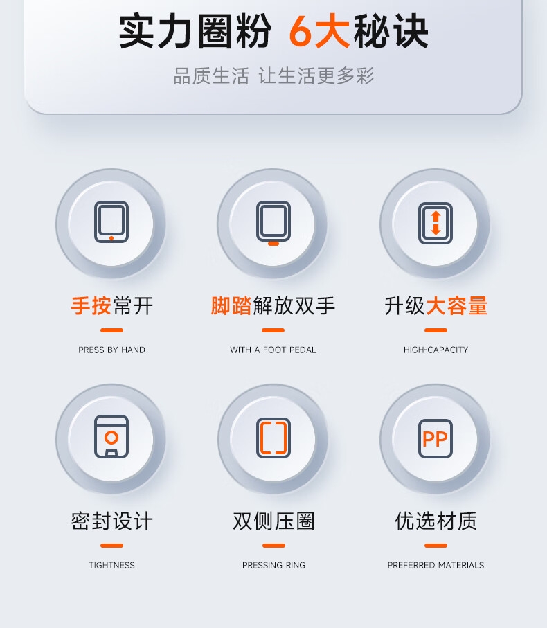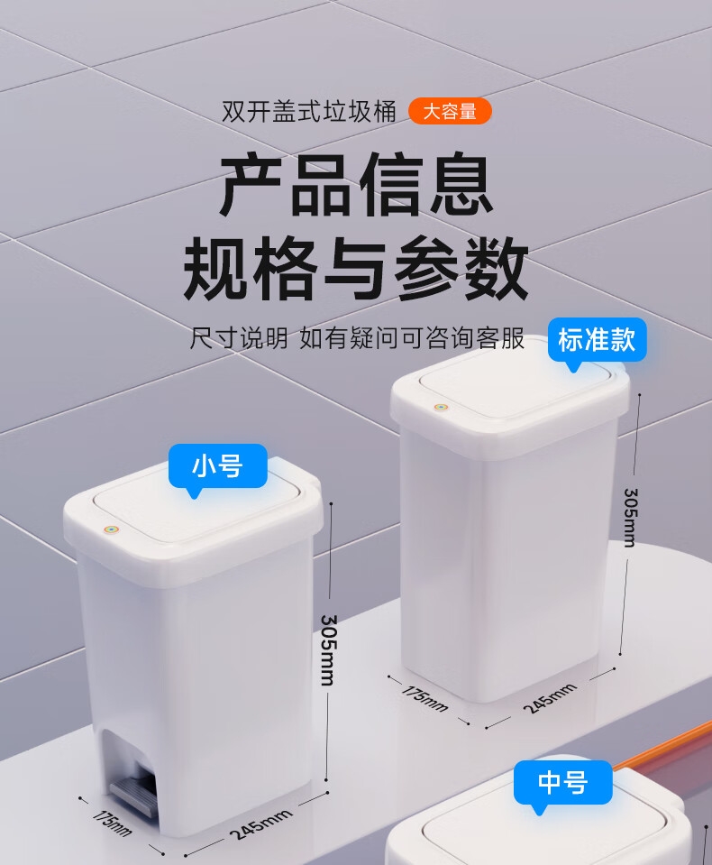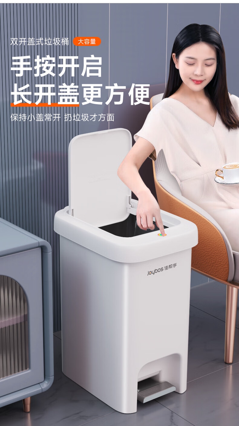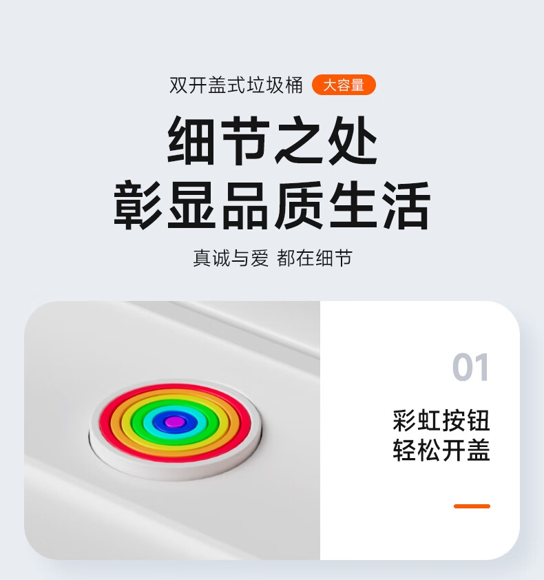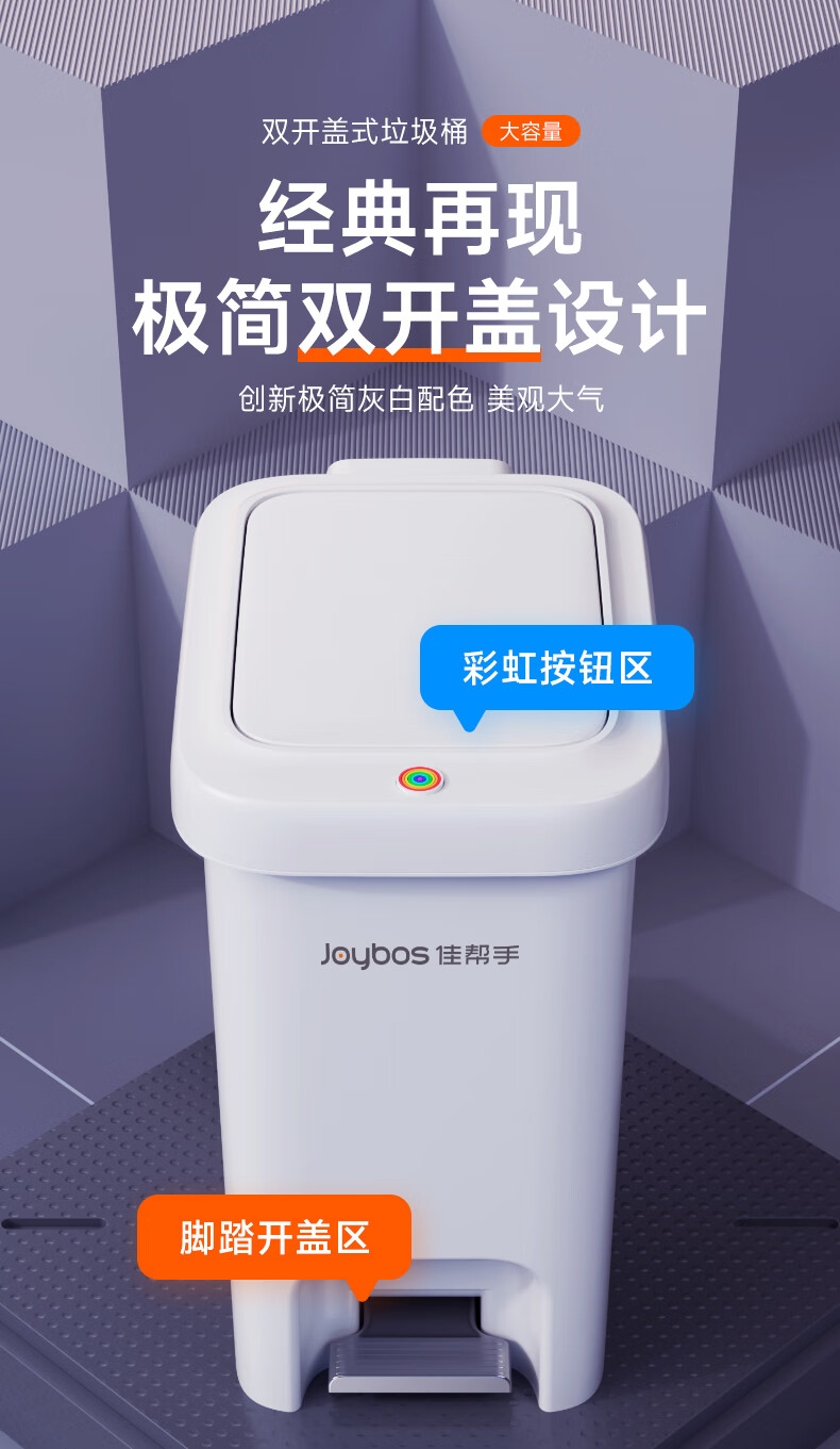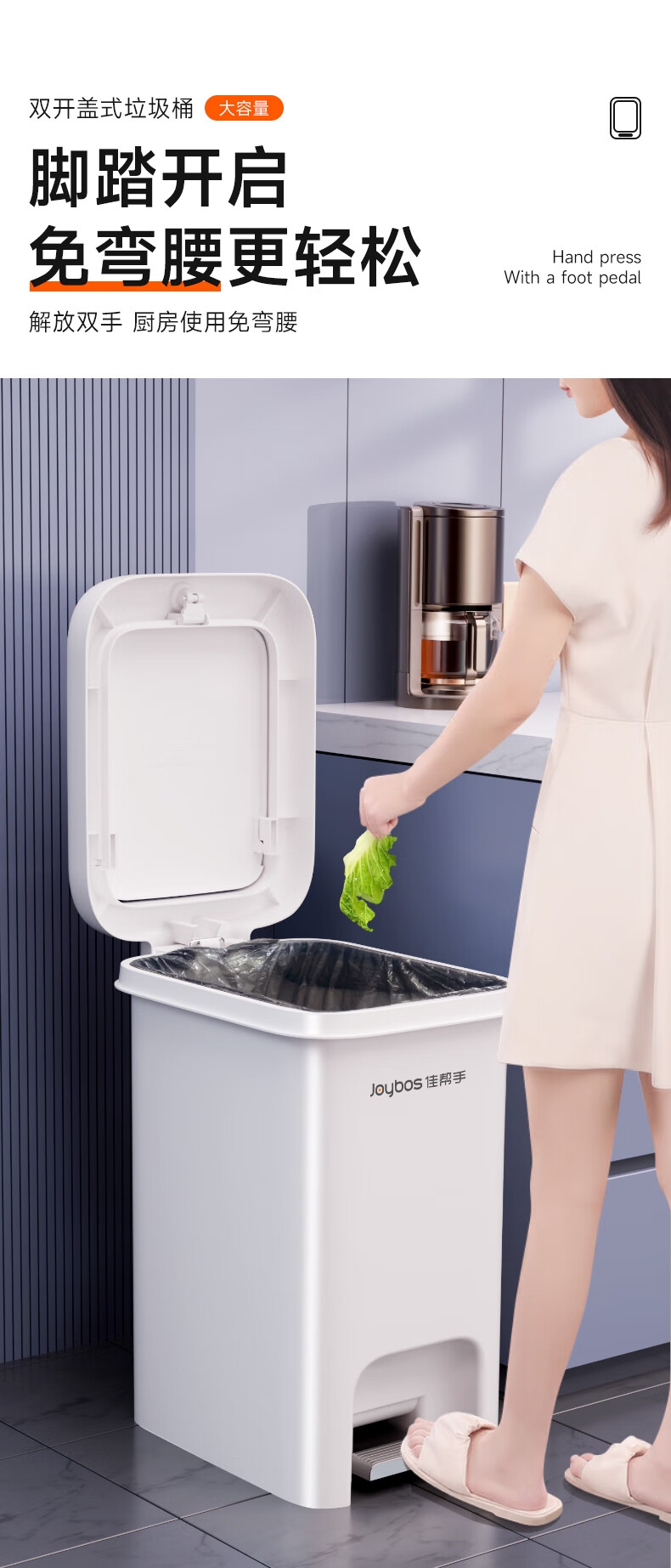手按+脚踏双开盖垃圾桶,专注产品研发,提升用户体验;经典再现极简双开盖设计,极简灰白配色,美观大气;加厚常用结构,结实更耐用