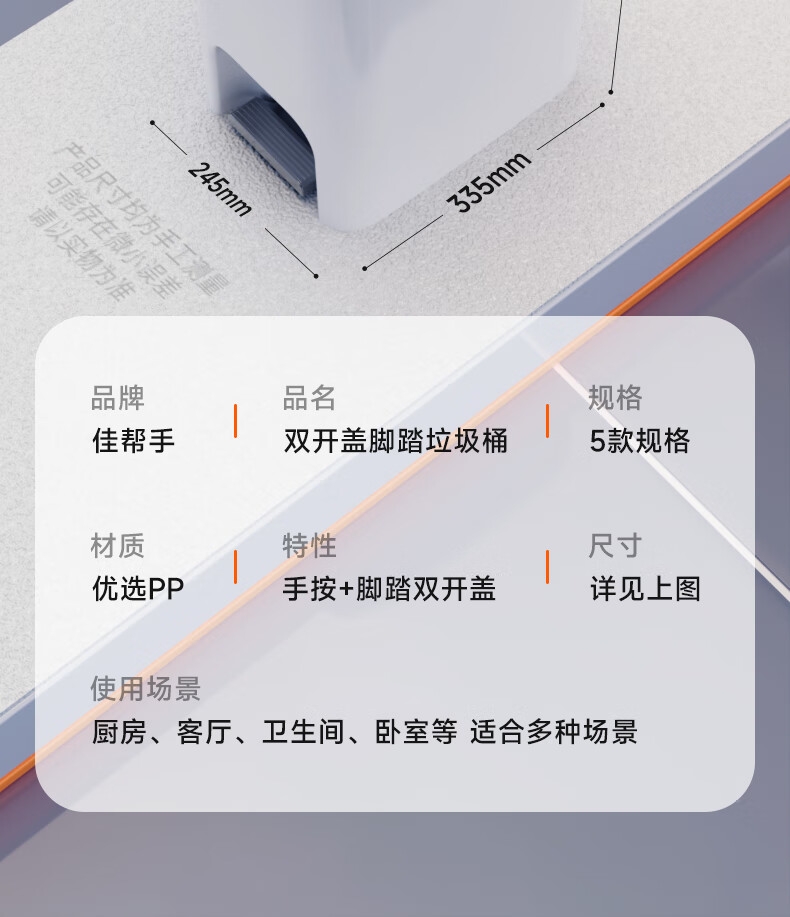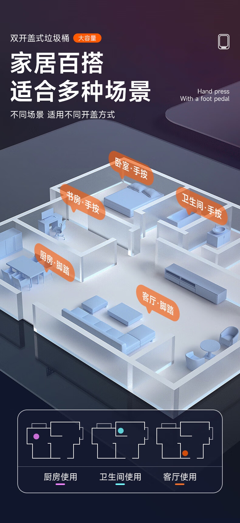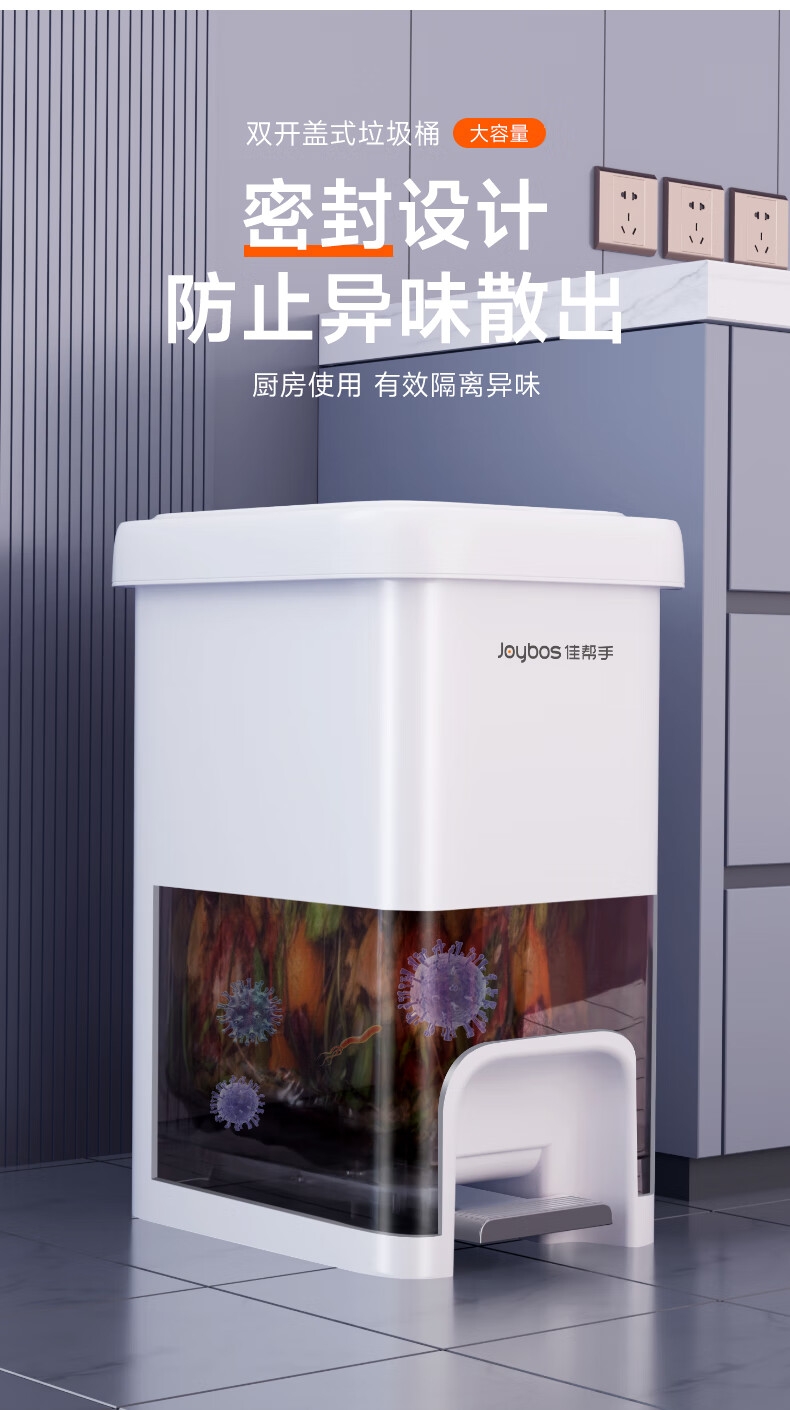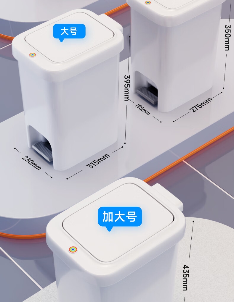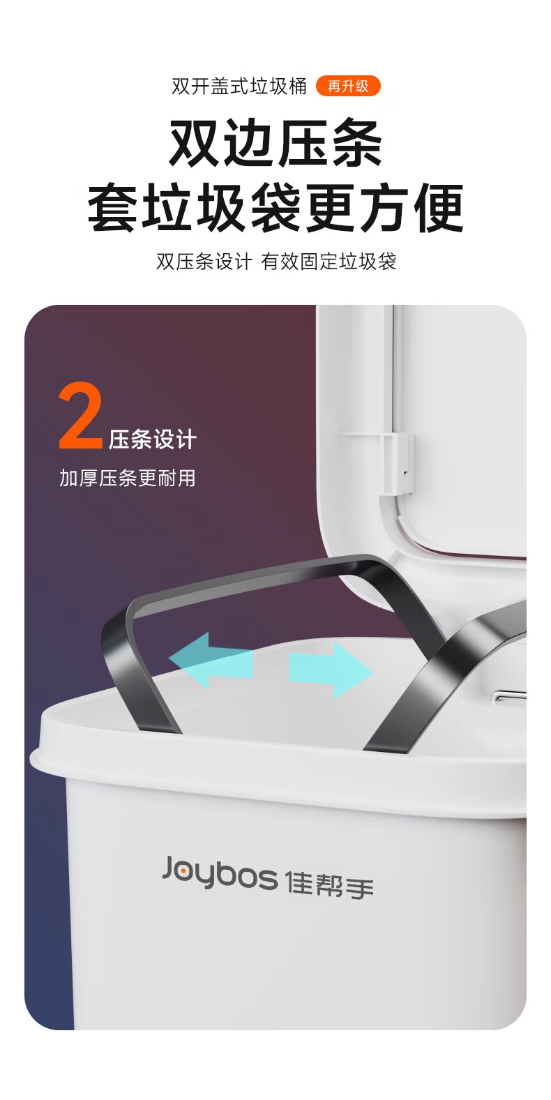手按+脚踏双开盖垃圾桶,专注产品研发,提升用户体验;经典再现极简双开盖设计,极简灰白配色,美观大气;加厚常用结构,结实更耐用