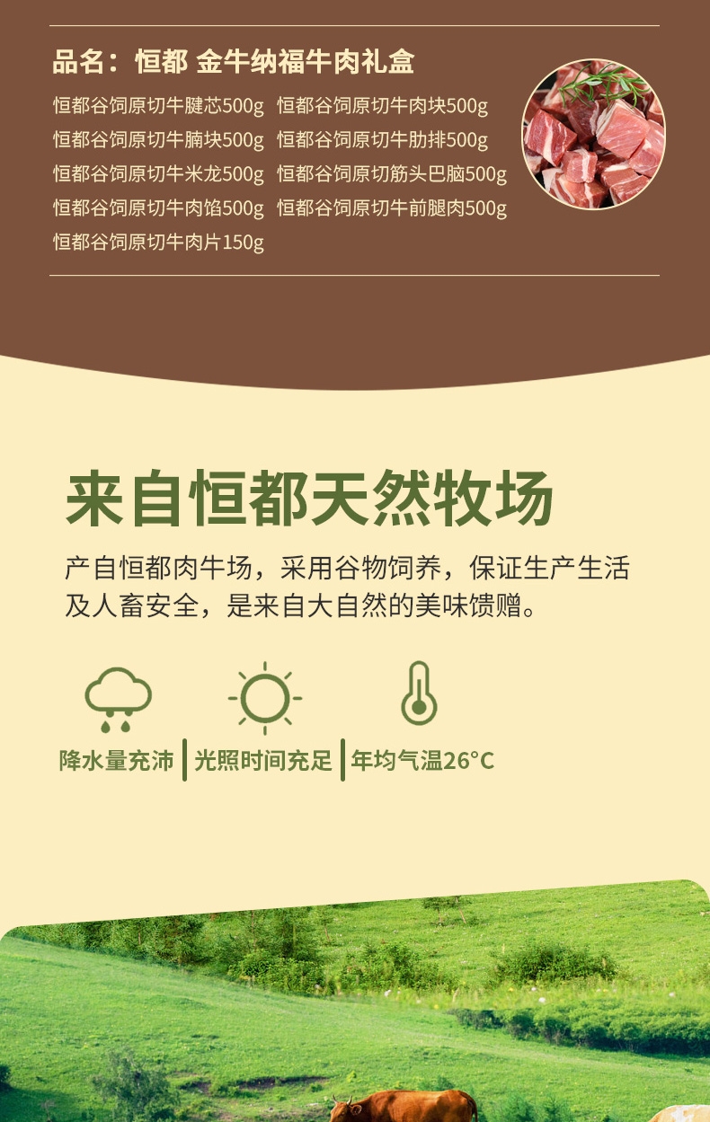 - 配置:恒都谷饲原切牛腱芯500g 恒都谷饲原切牛肋排500g 恒都谷饲原切牛肉块500g 恒都谷饲原切牛腩块500g 恒都谷饲原切筋头巴脑500g 恒都谷饲原切牛米龙500g 恒都谷饲原切牛肉馅500g 恒都谷饲原切牛前腿肉500g 恒都谷饲原切牛肉片150g