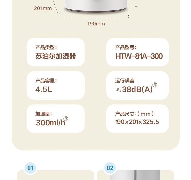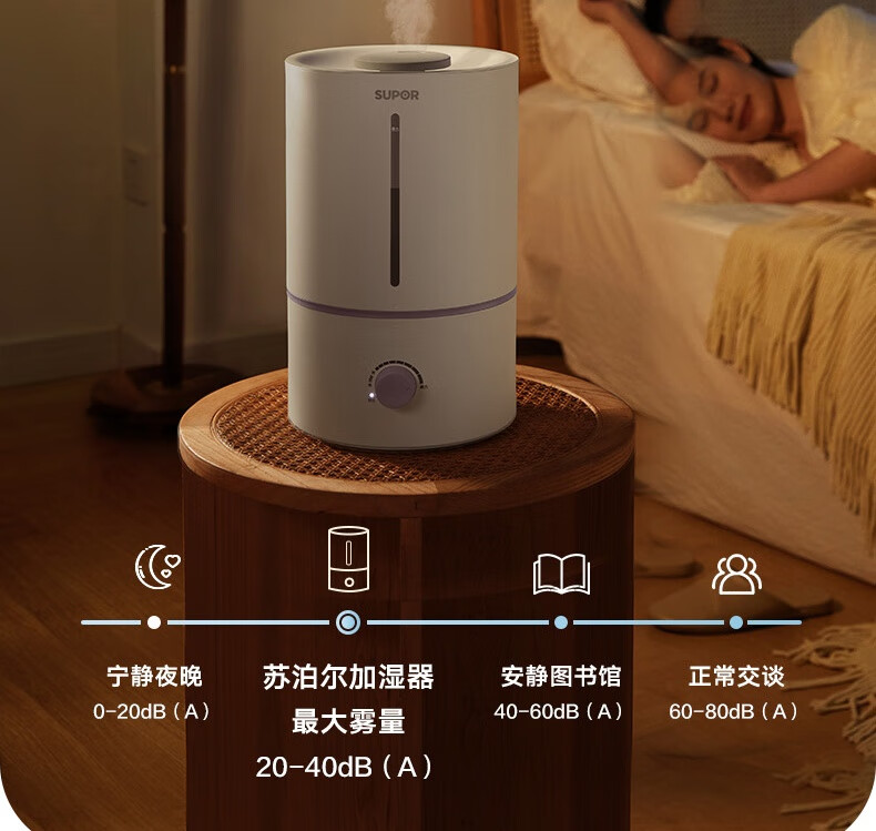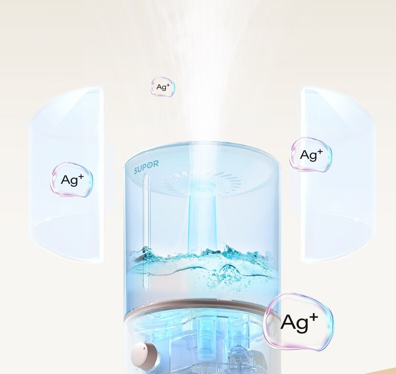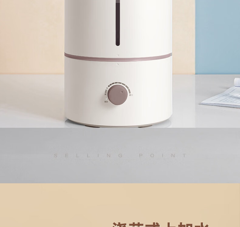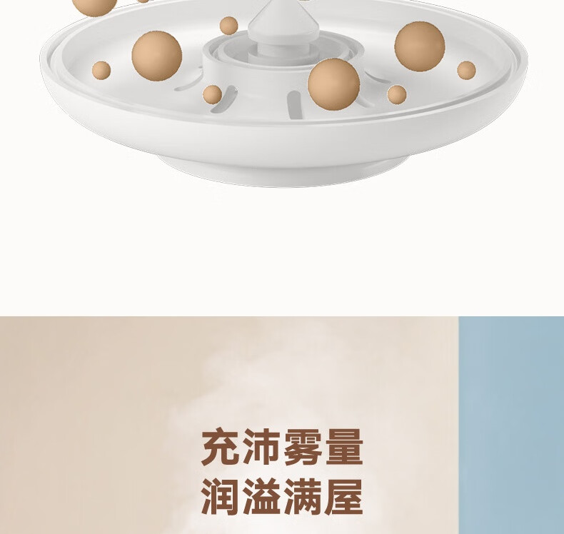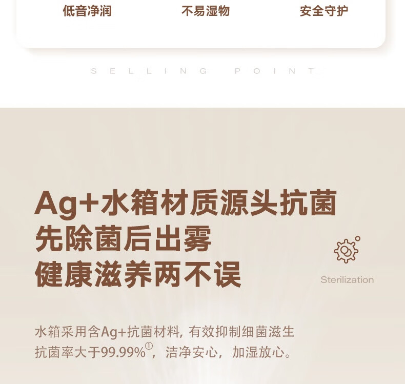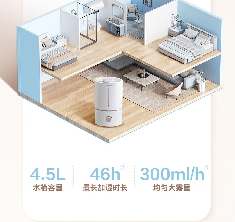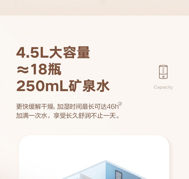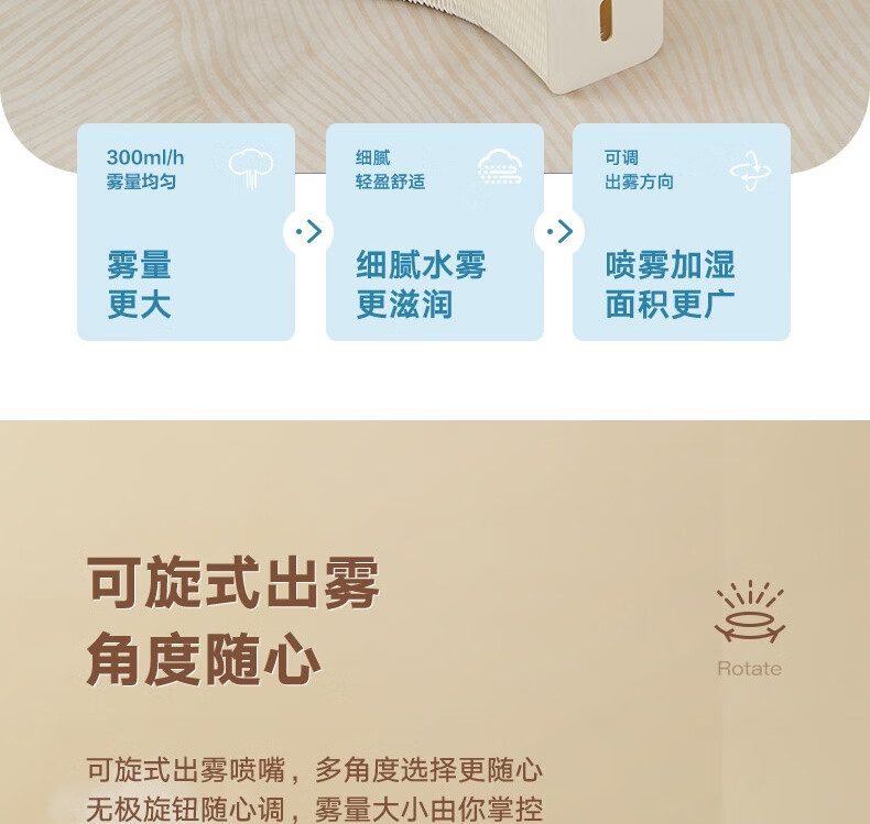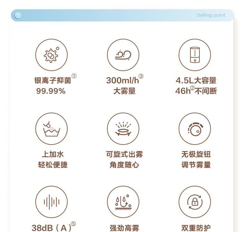 银离子抗菌材质,先除菌后出雾;4.5L大容量;可旋式出雾,角度随心;强劲高雾,不易湿物;300ml/h大雾量,38dB轻音加湿