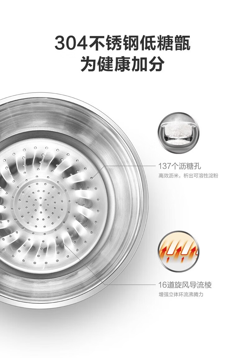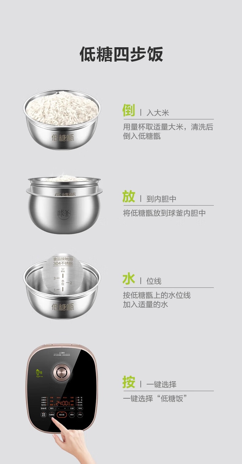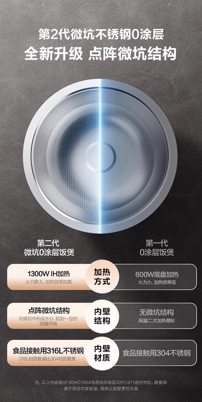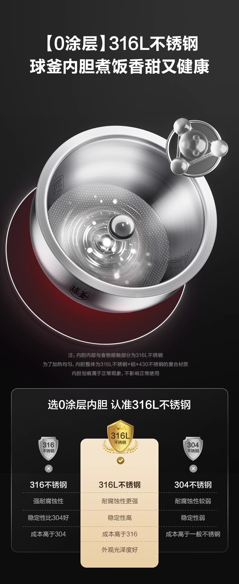 316L球釜钢胆,粒粒透芯香甜;2代点阵微坑内胆,锁水抗粘 3.304不锈钢低糖; 304食品接触用不锈钢可拆内盖 ,高档易清洁
