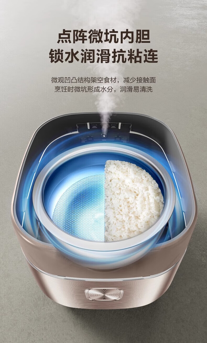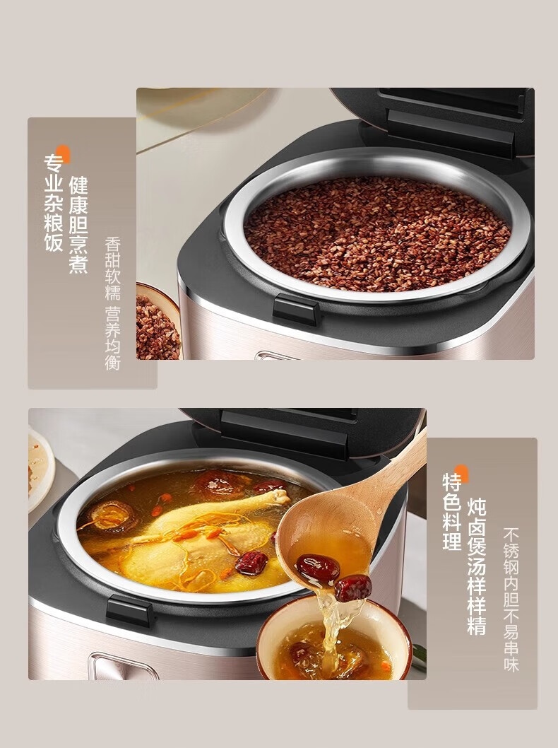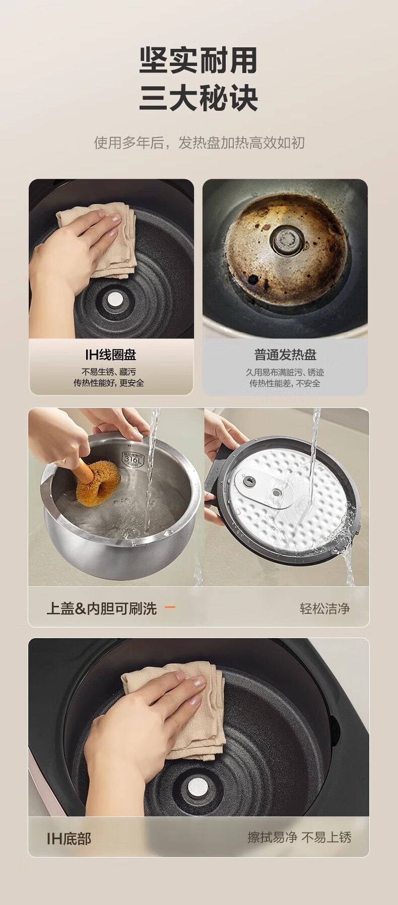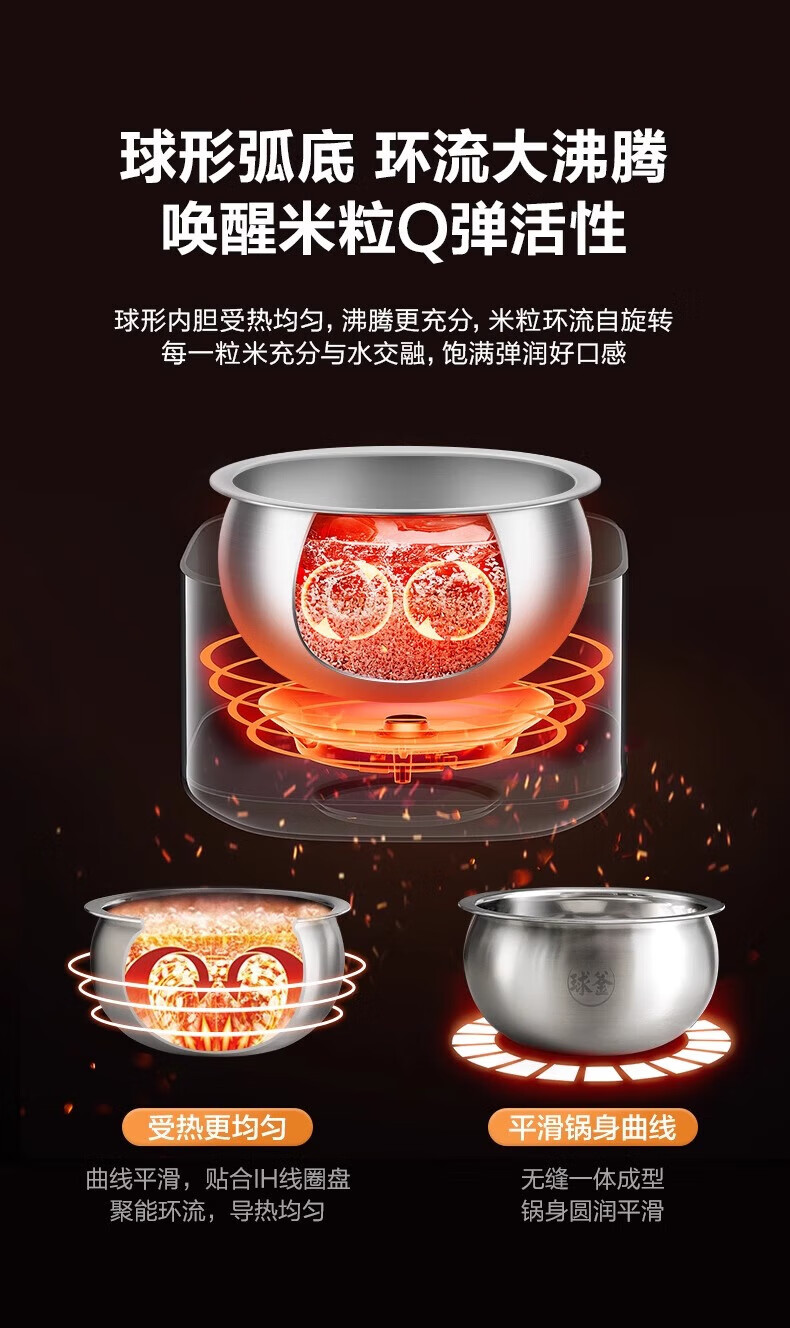 316L球釜钢胆,粒粒透芯香甜;2代点阵微坑内胆,锁水抗粘 3.304不锈钢低糖; 304食品接触用不锈钢可拆内盖 ,高档易清洁