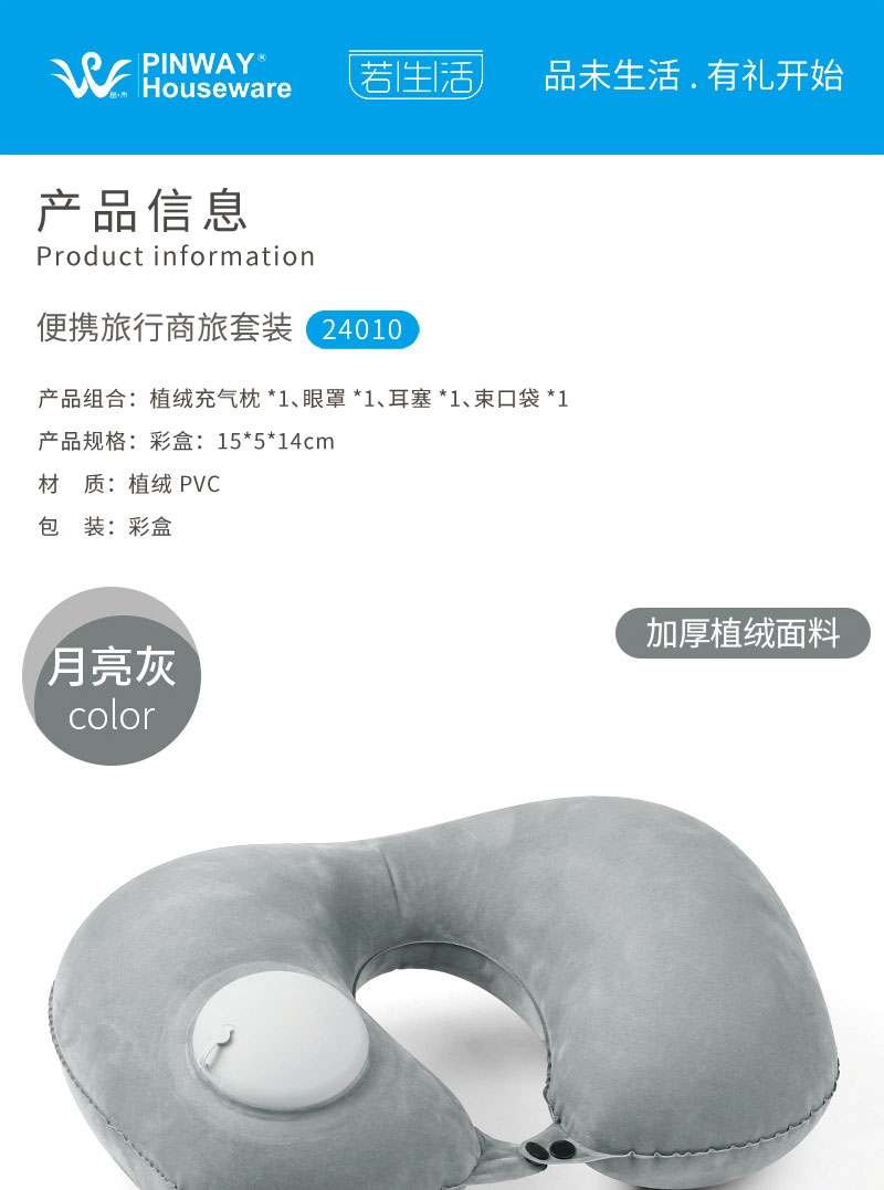 产品组合:植绒充气枕*1、眼罩*1、耳塞*1、束口袋*1