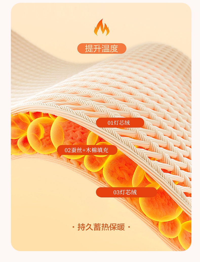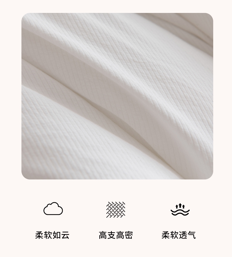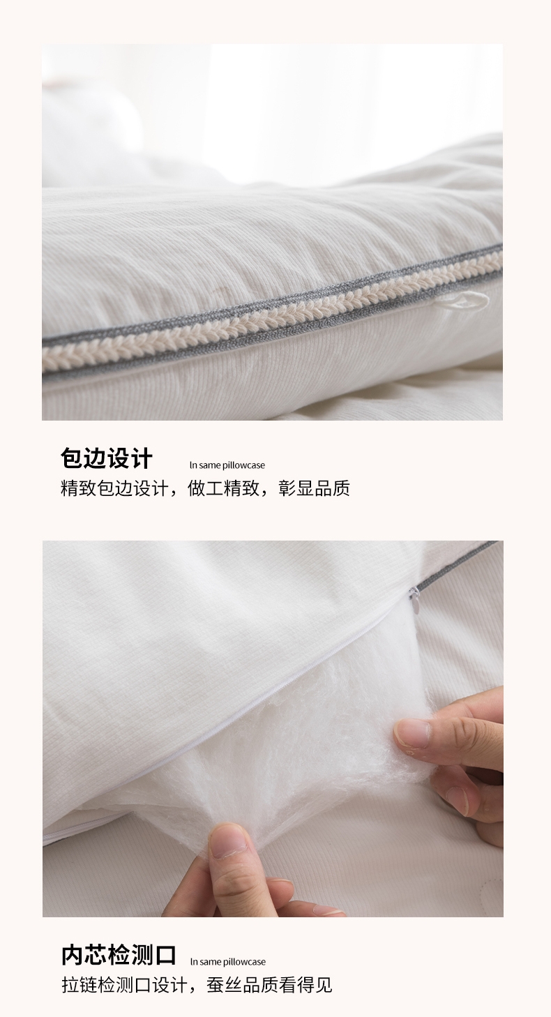 采用灯芯绒提花面料,面料密度高,绒面处理工艺;其中含有丰富的氨基酸及细密的透气孔;做工精制细密,美观大方,朴实耐用