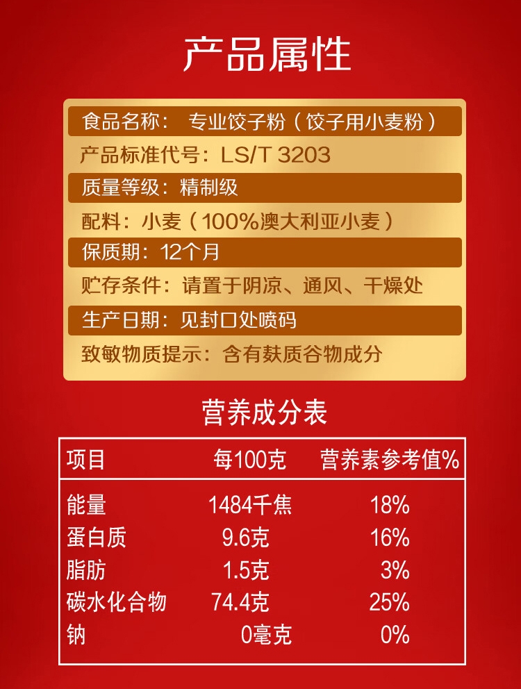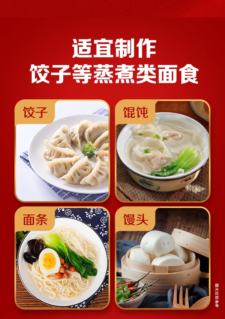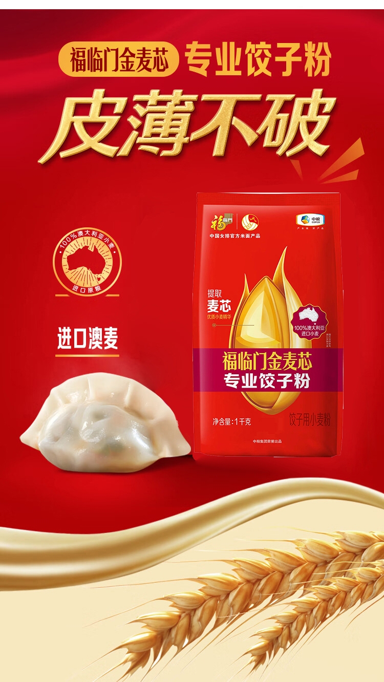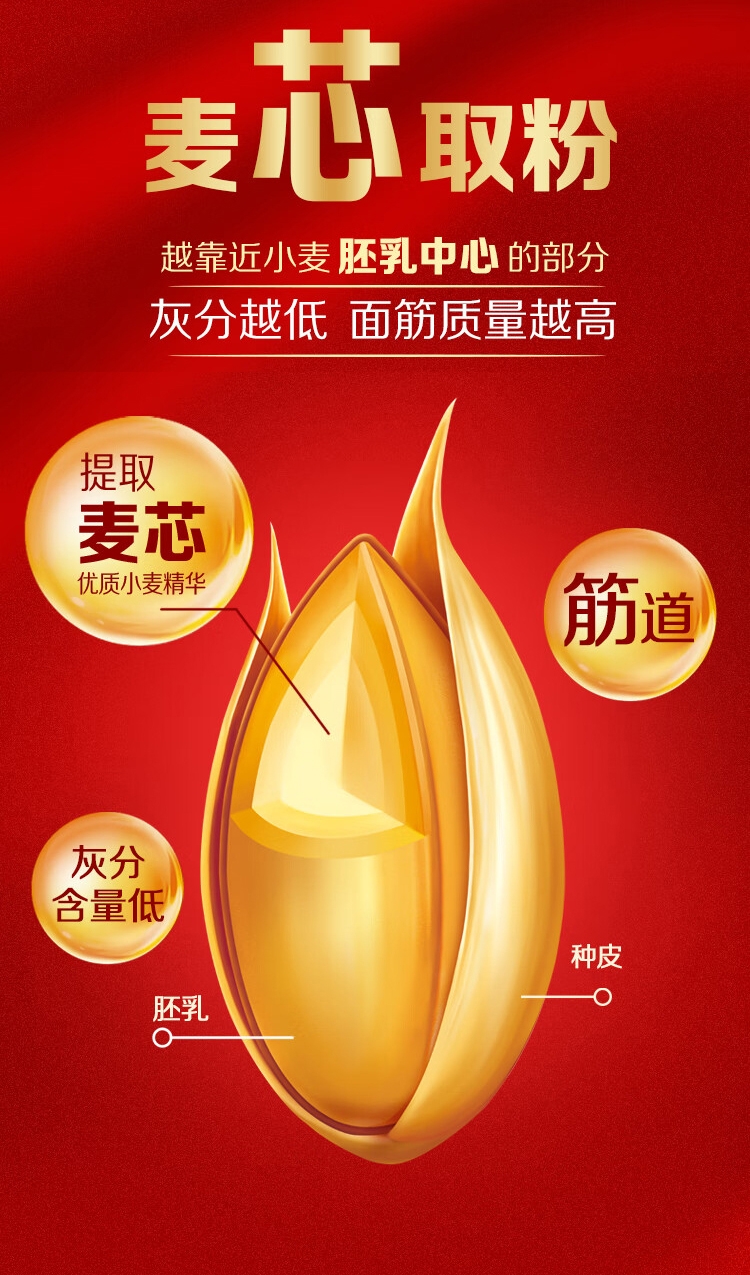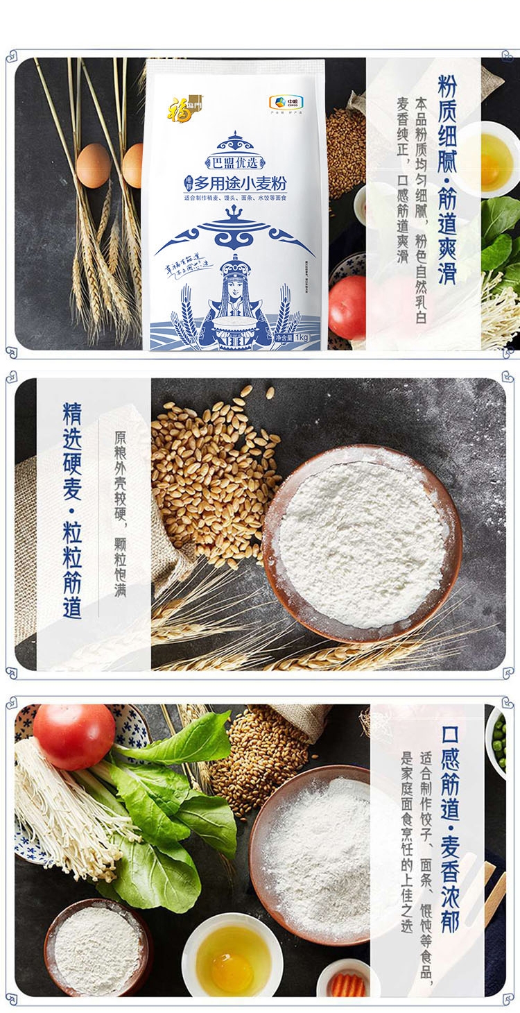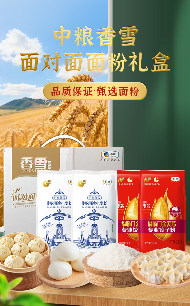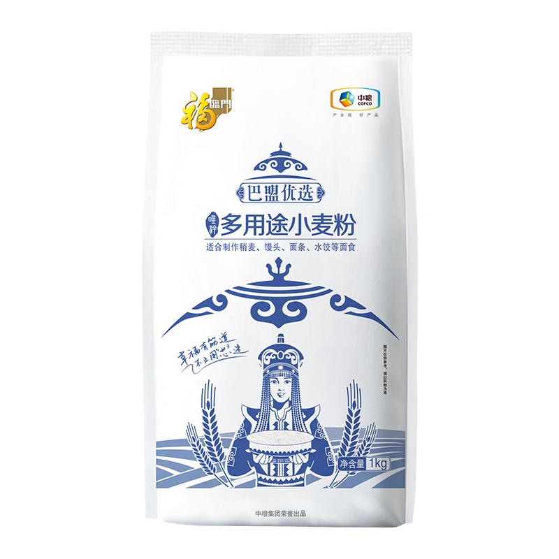 配置清单:净含量:4kg 内配: 中粮福临门金麦芯专业饺子粉1kg *2 中粮福临门巴盟优选多用途小麦粉 1kg*2