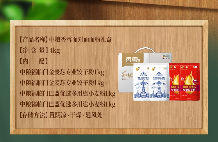 配置:净含量:4kg 内配: 中粮福临门金麦芯专业饺子粉1kg *2 中粮福临门巴盟优选多用途小麦粉 1kg*2