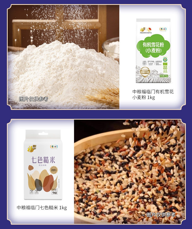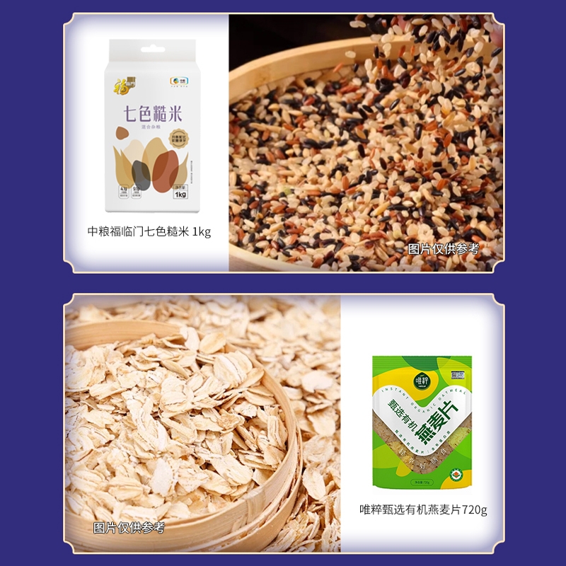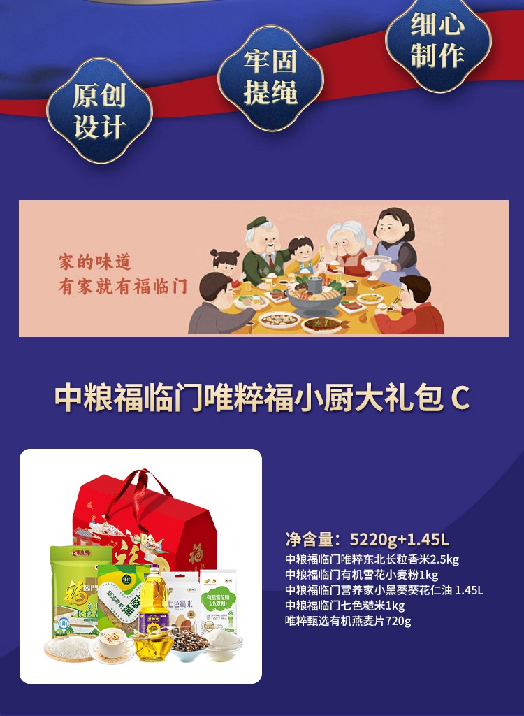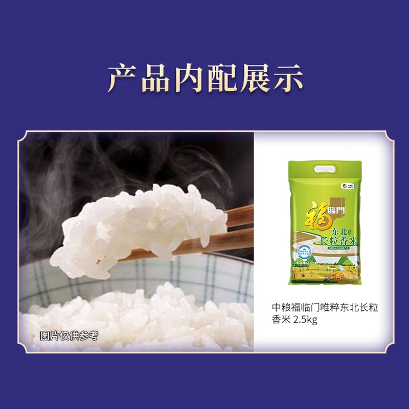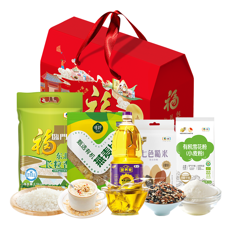 配置清单:净含量:5220g+1.45L 内配: 中粮福临门唯粹东北长粒香米2.5kg 中粮福临门有机雪花小麦粉1kg 中粮福临门营养家小黑葵葵花仁油 1.45L 唯粹甄选有机燕麦片720g 中粮福临门七色糙米1kg
