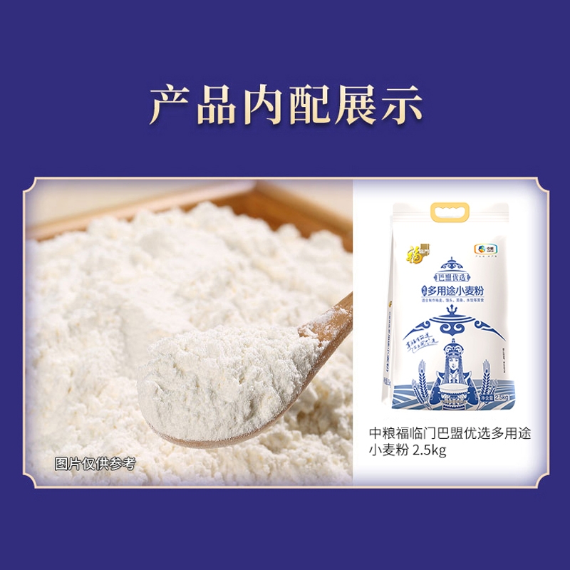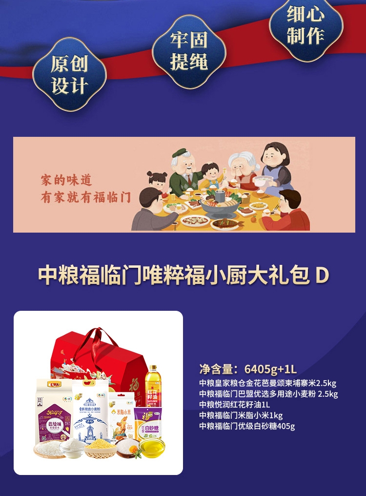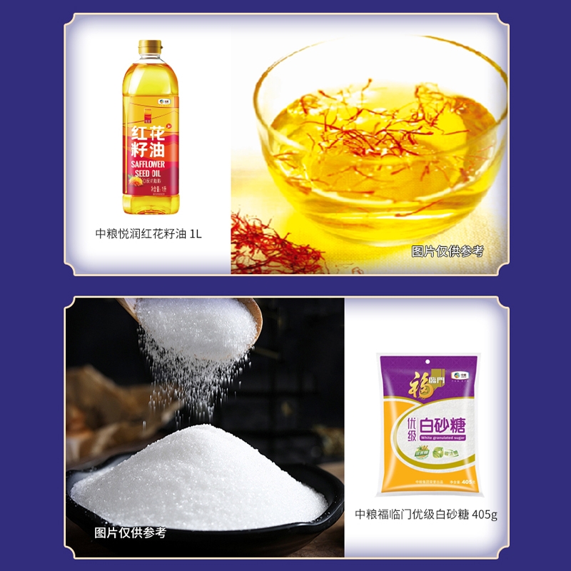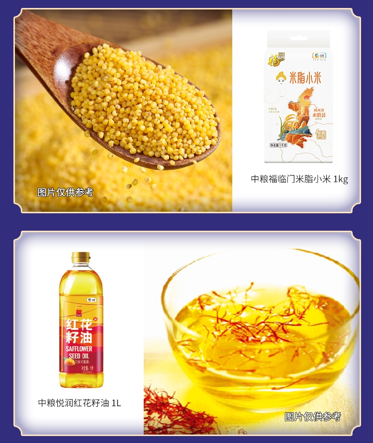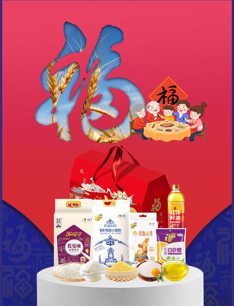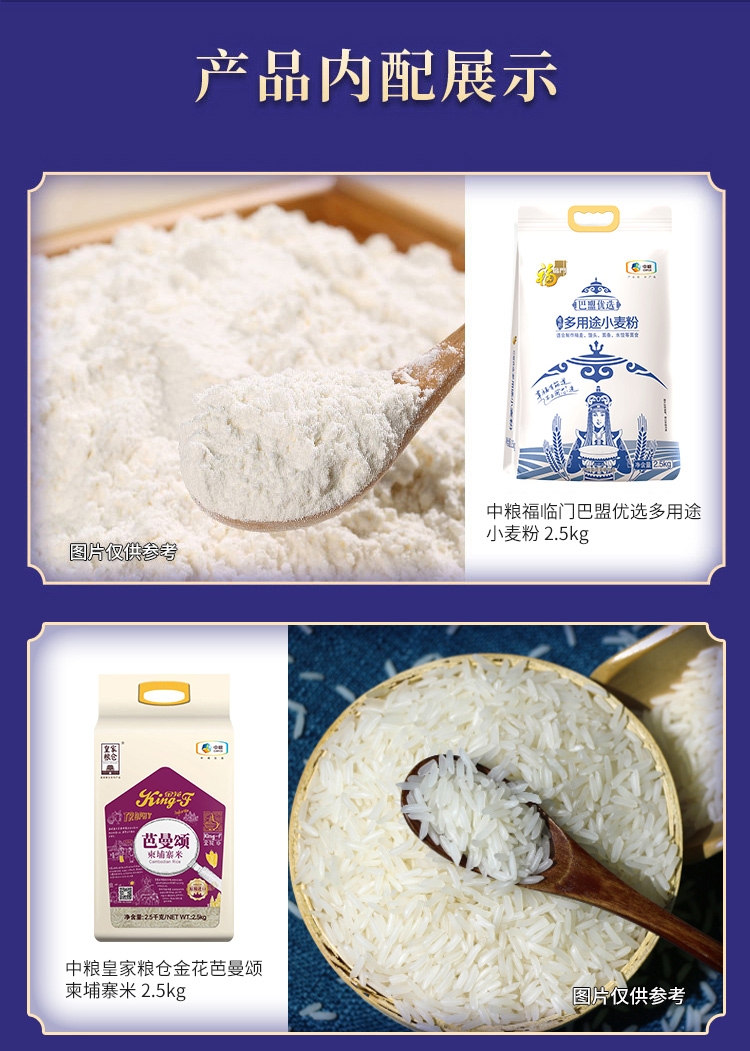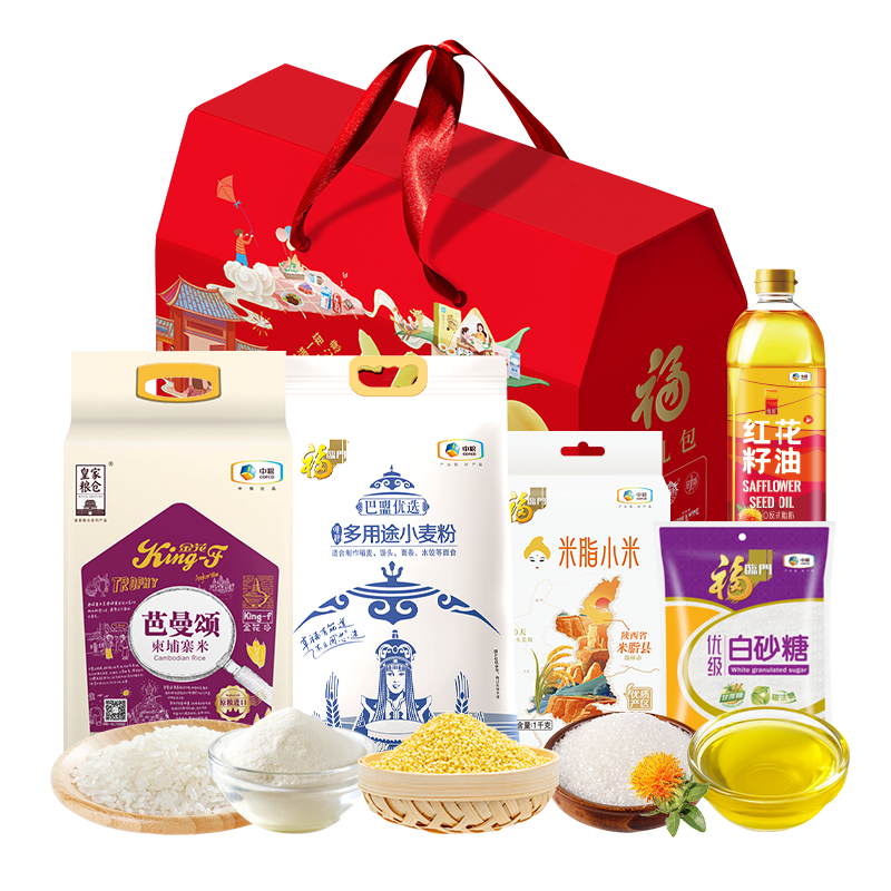 配置清单:净含量:6405g+1L 内配: 中粮皇家粮仓金花芭曼颂柬埔寨米2.5kg 中粮福临门巴盟优选多用途小麦粉 2.5kg 中粮悦润红花籽油1L 中粮福临门米脂小米1kg 中粮福临门优级白砂糖405g