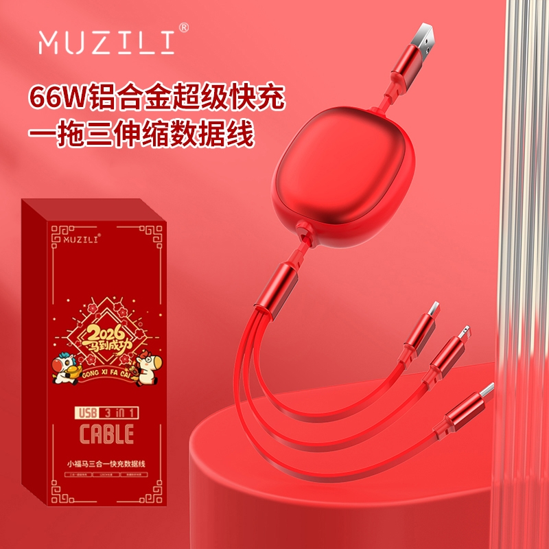 一拖三伸缩设计,兼容苹果15系列;66W超级快充,充电更快;三种接口满足各种手机;1.2米长度设计,使用方便;TPE材质耐用,不易折断,五档伸缩调节