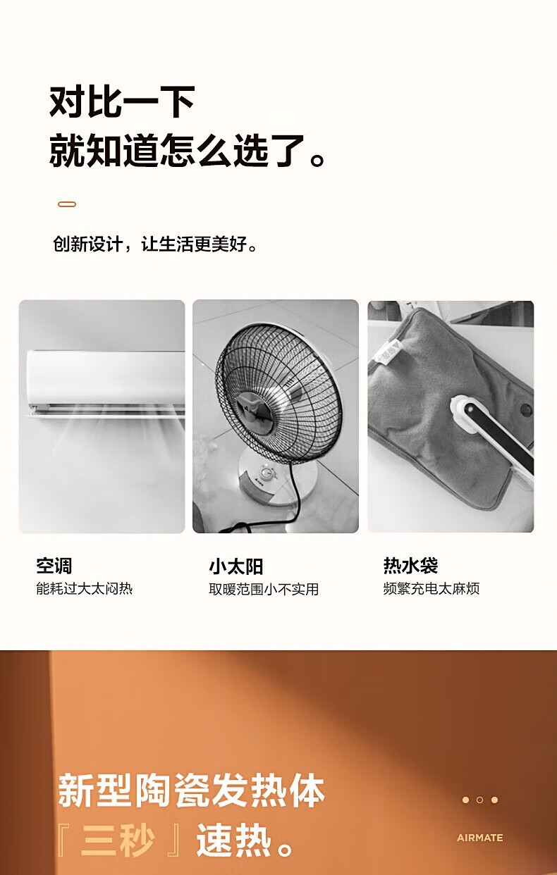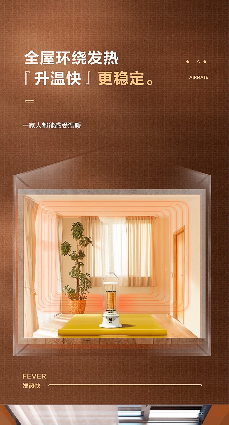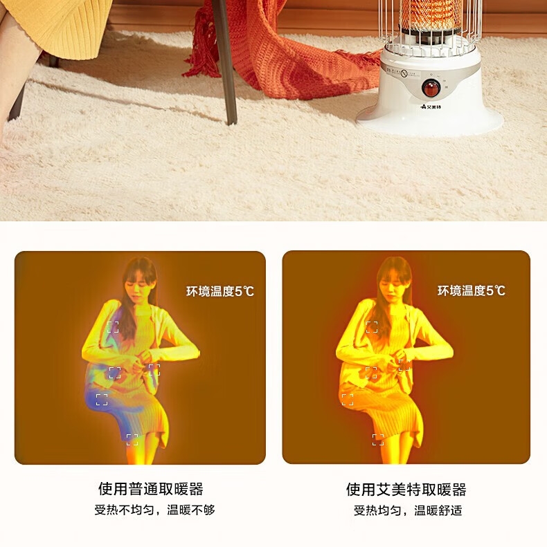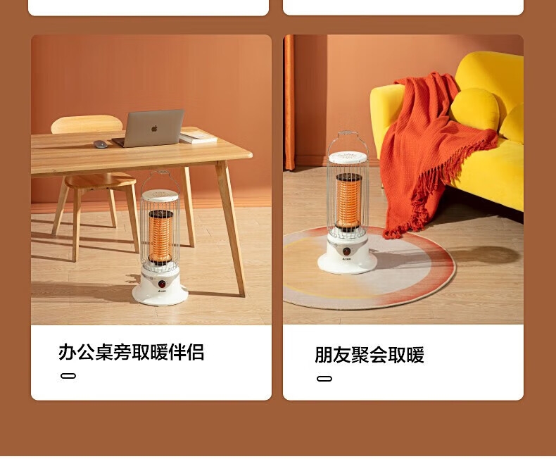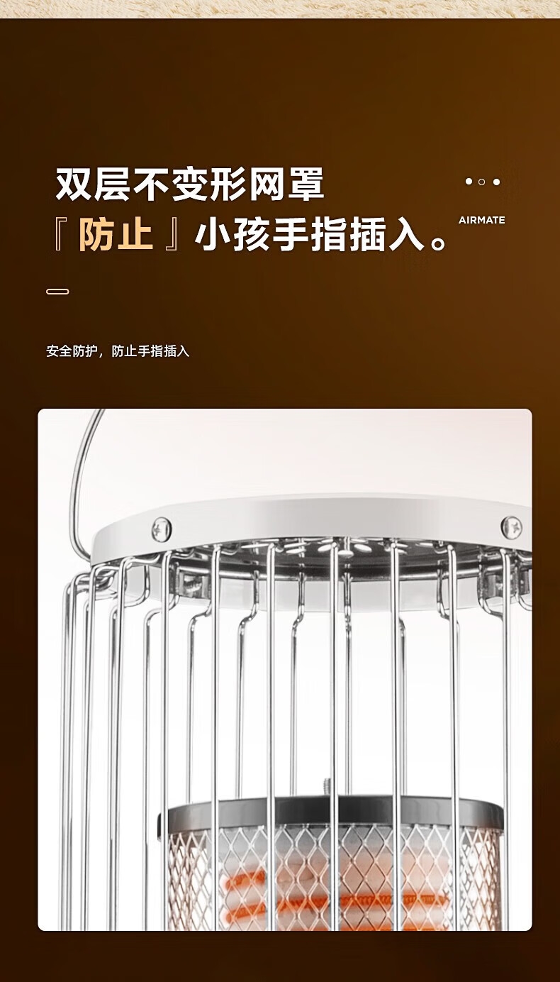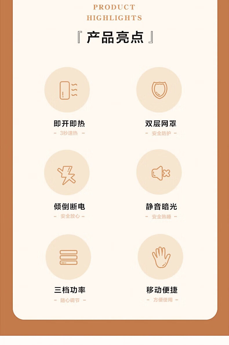 全广角送暖,360°无死角;双层不变形网罩,防止小孩手指插入;3档旋转调温,操作简单;无噪柔光无氧耗,享受安全睡眠;抬起倾斜断电,避免危险