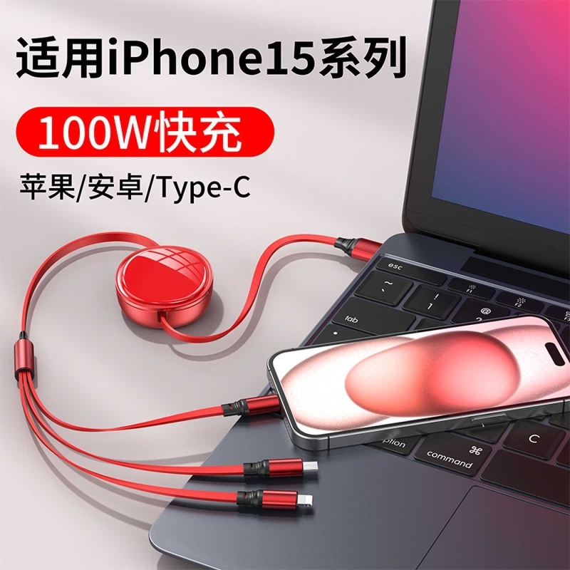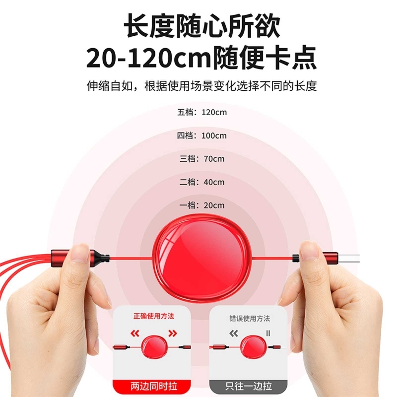 一秒收纳 五档伸缩;更粗铜芯 充电提速;一线三用 兼容所有;支持iphone15系列充电;支持苹果、安卓、Type-c同时充电