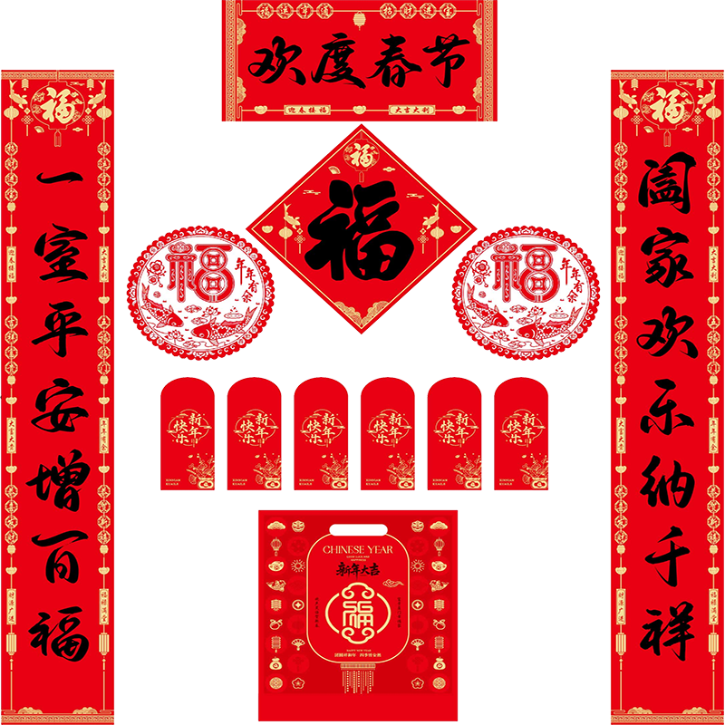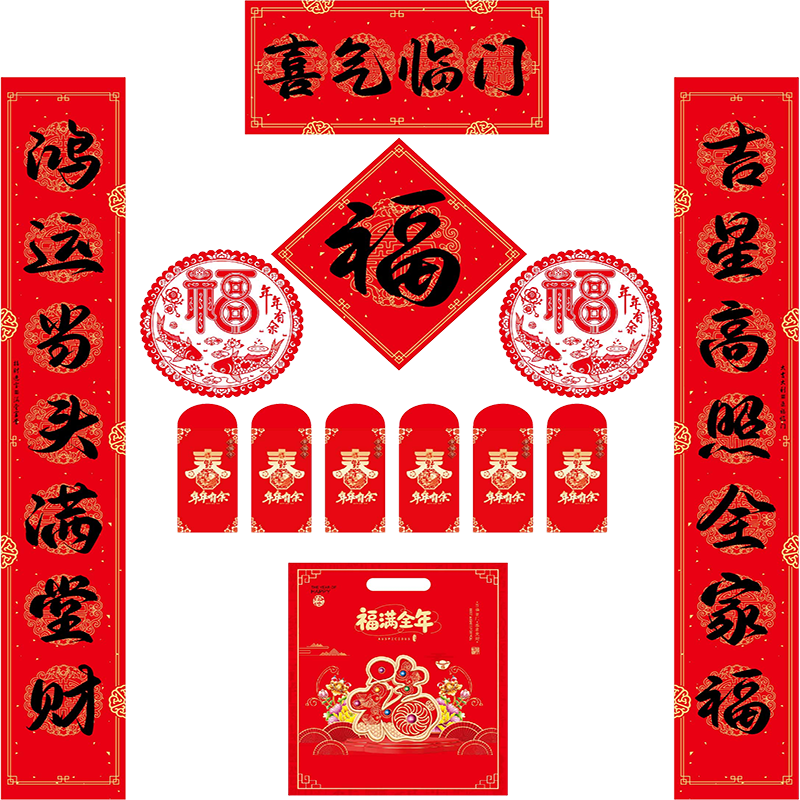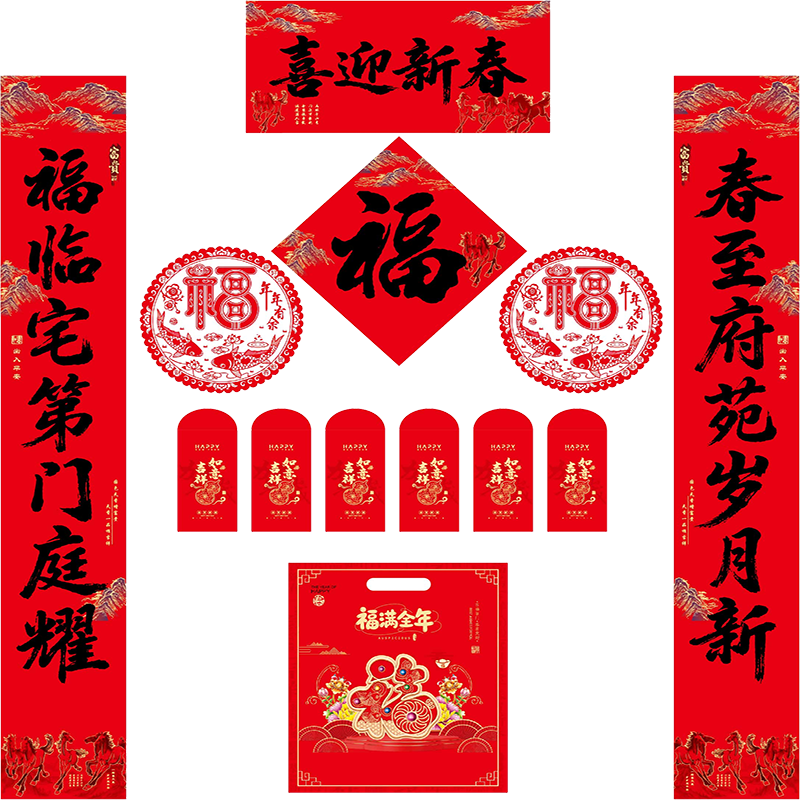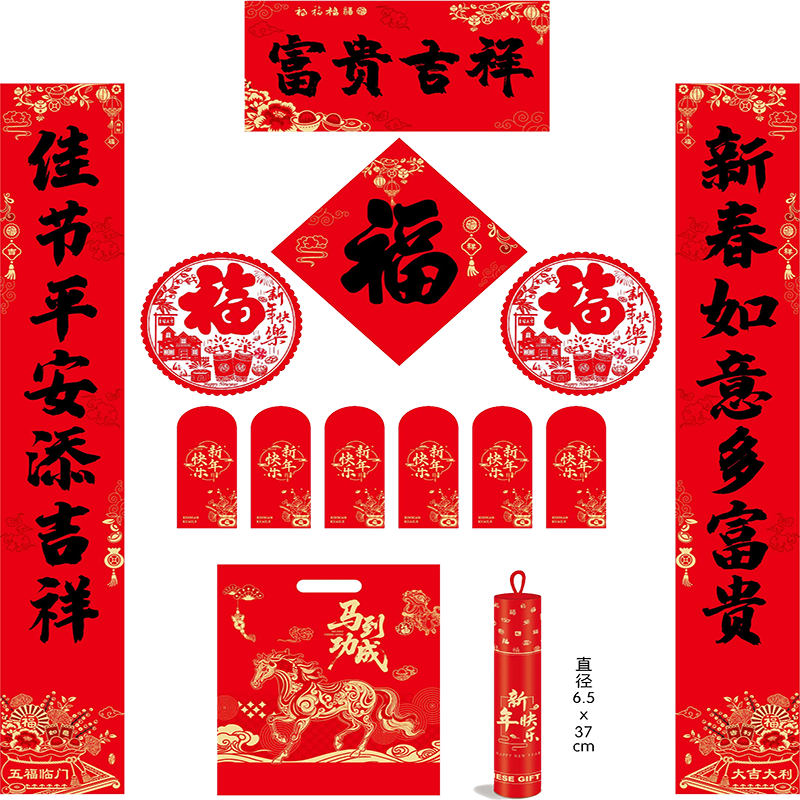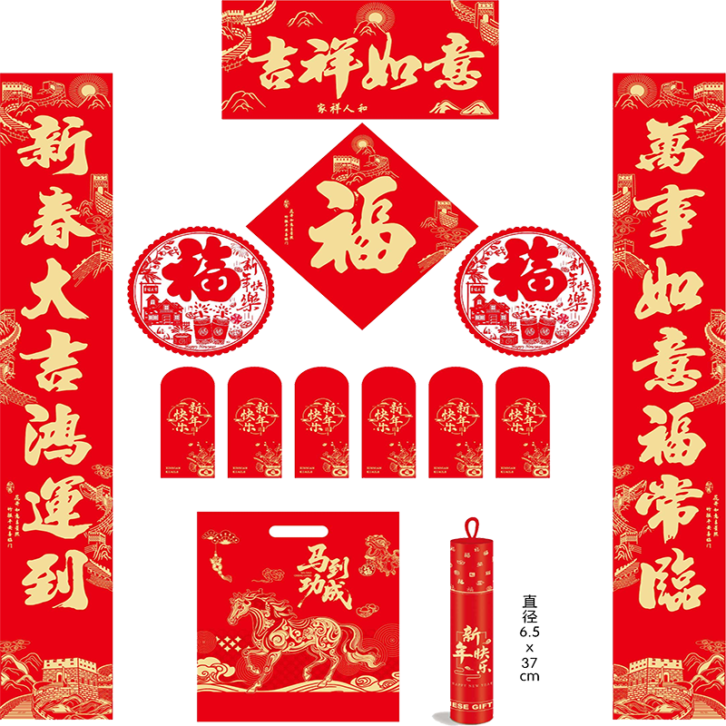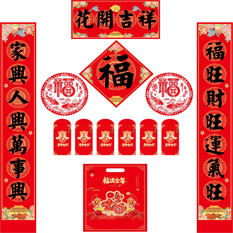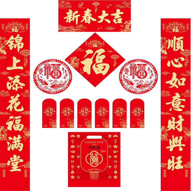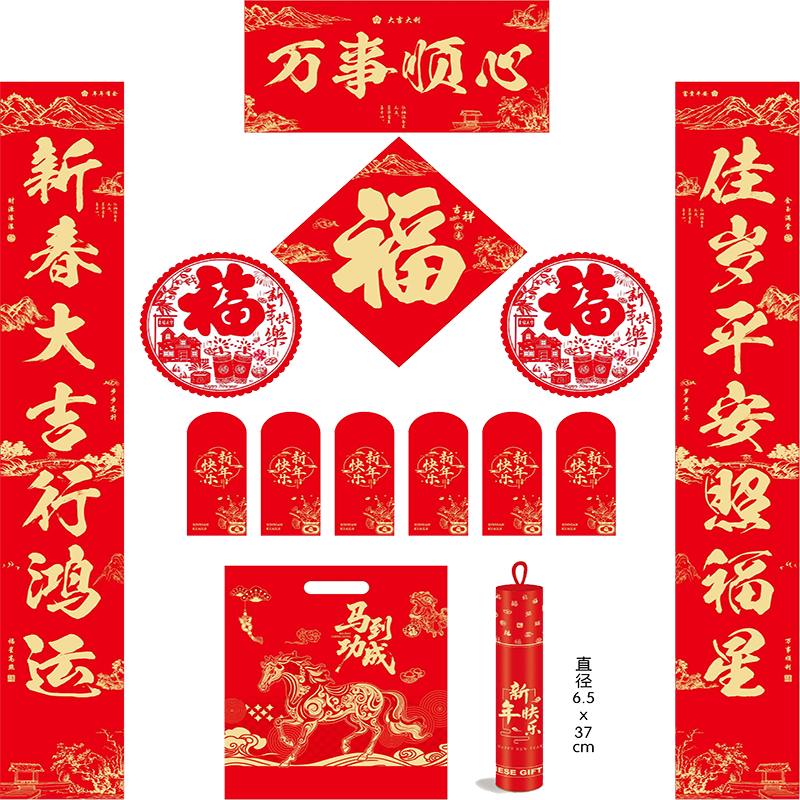 高档植绒烫金对联红包大礼包订制;增添节日气氛或文化氛围;可以作为装饰品挂在室内或室外