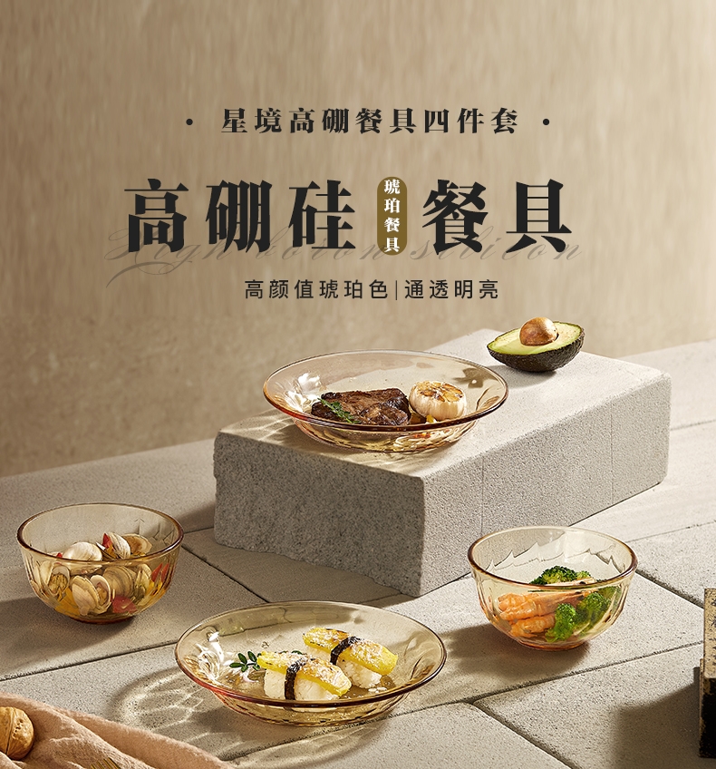 产品采用高硼色料玻璃材质,颜色与生俱来,永不退色;用线条勾勒几何切面,以面为境折射时光、徜徉星空。;烤箱、微波炉、冰箱冷冻放心使用