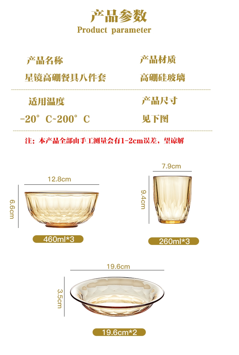 产品参数:小碗460ml*3、 杯260ml*3、盘196mm*2