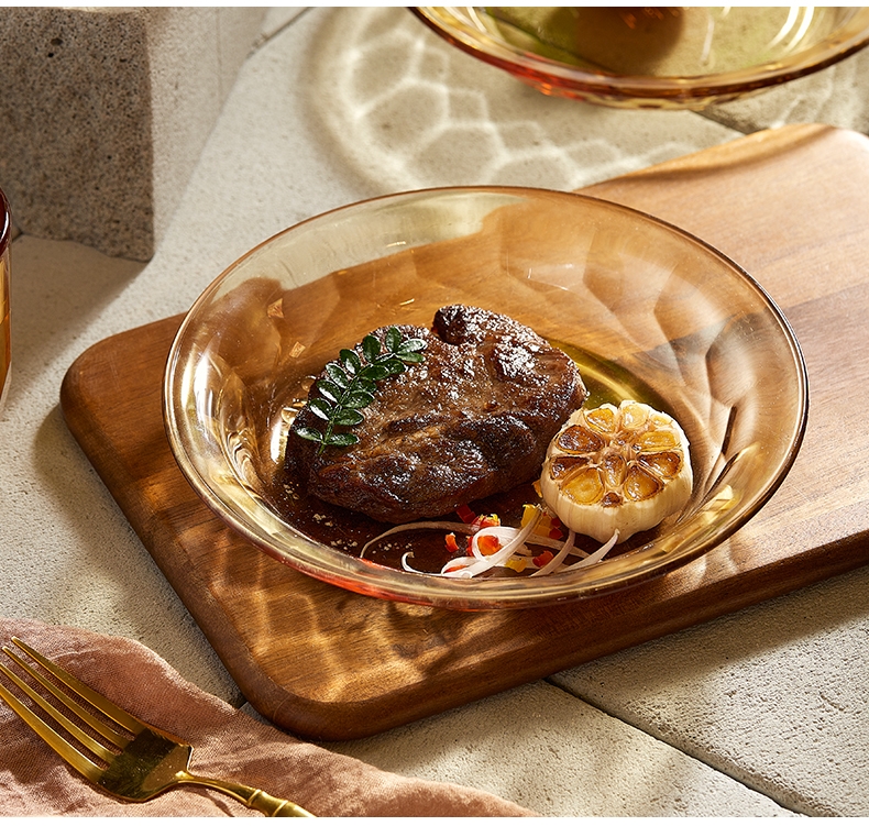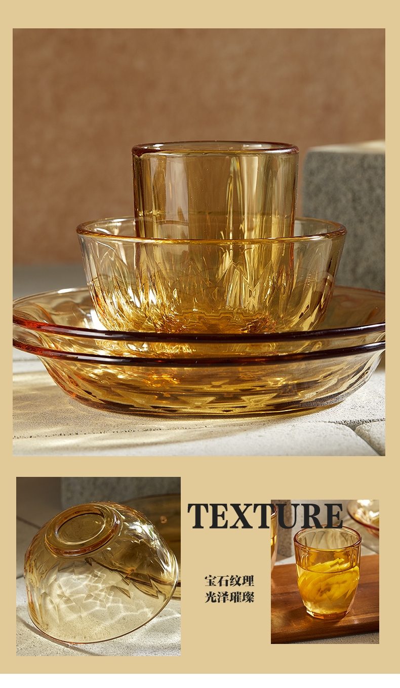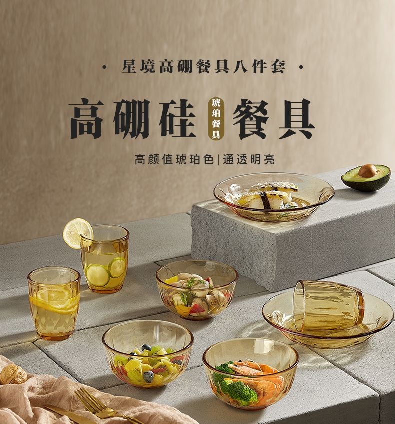用线条勾勒几何切面,以面为境折射时光、徜徉星空;产品采用高硼色料玻璃材质,颜色与生俱来,永不退色;烤箱、微波炉、冰箱冷冻放心使用