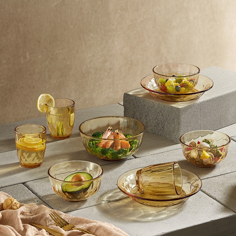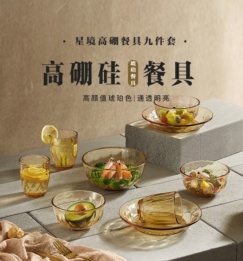 产品采用高硼色料玻璃材质,颜色与生俱来,永不退色;烤箱、微波炉、冰箱冷冻放心使用;用线条勾勒几何切面,以面为境折射时光、徜徉星空