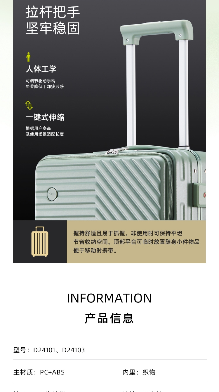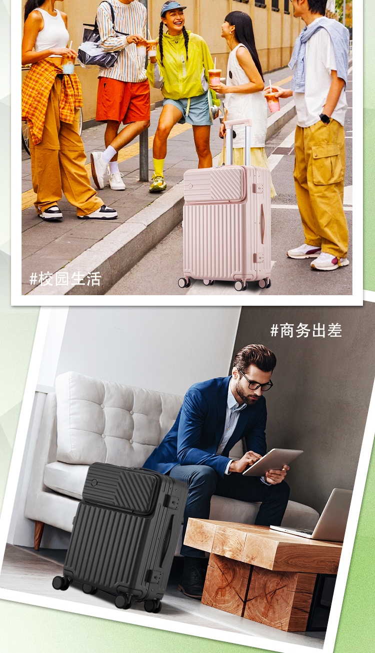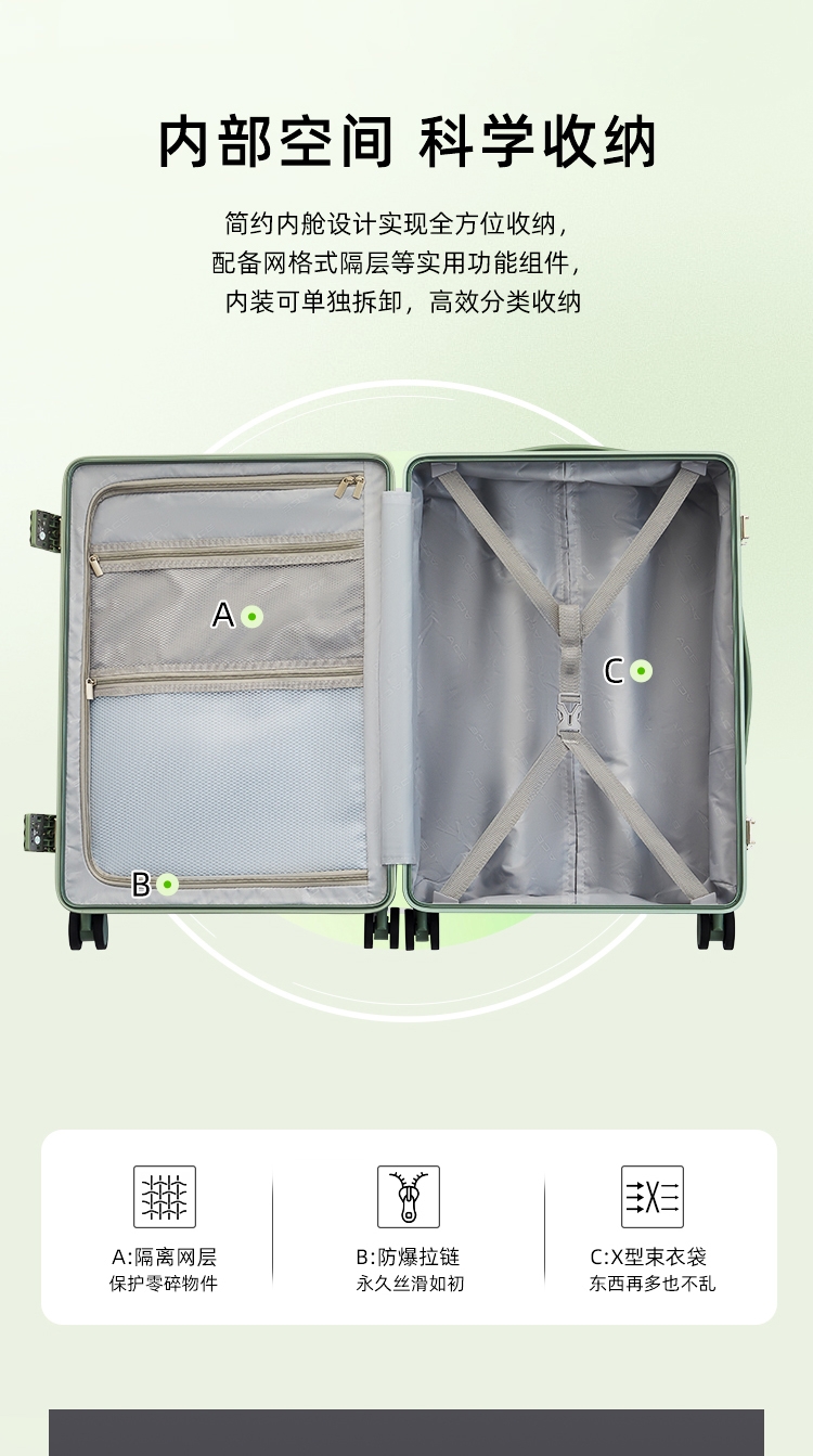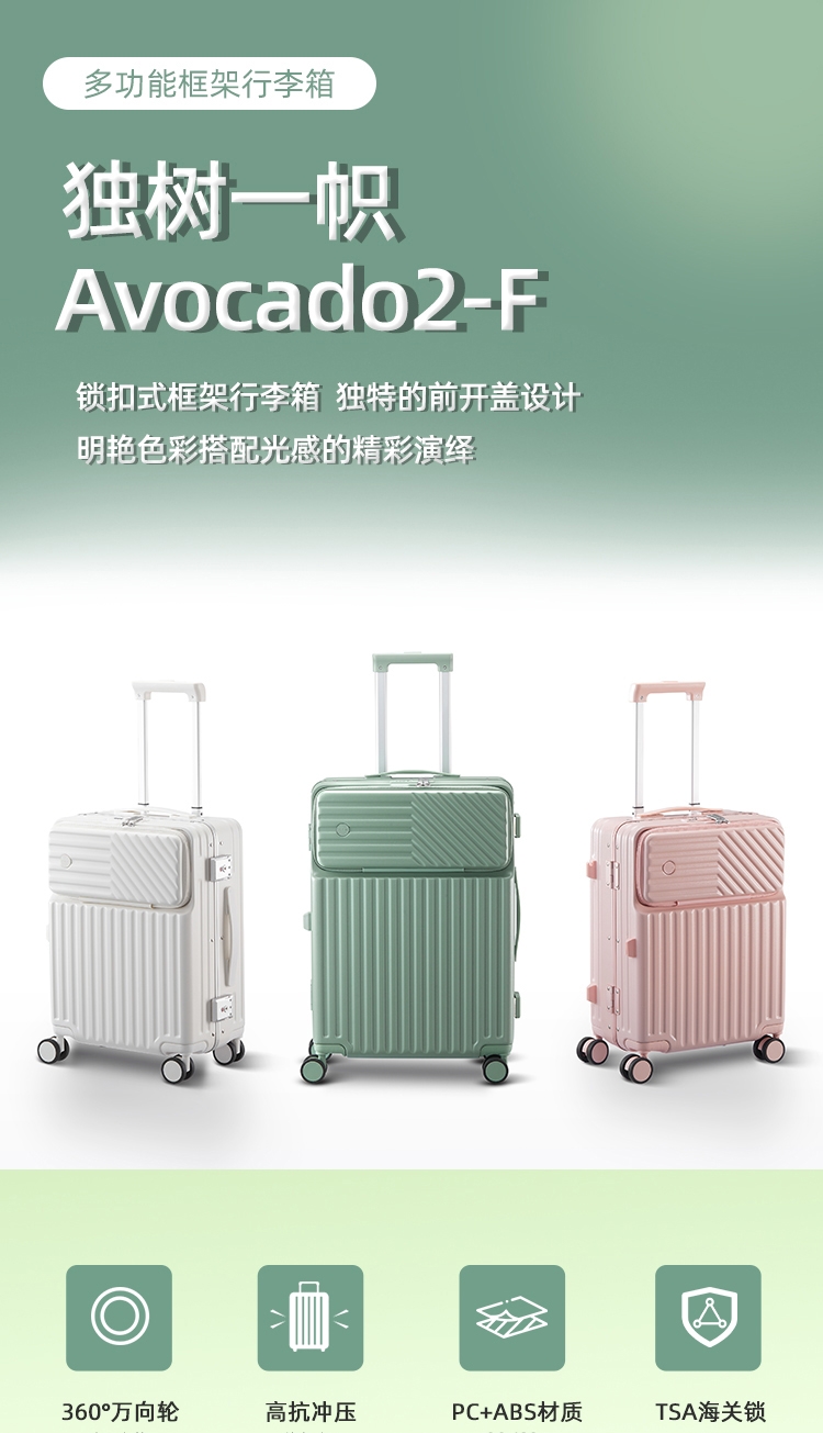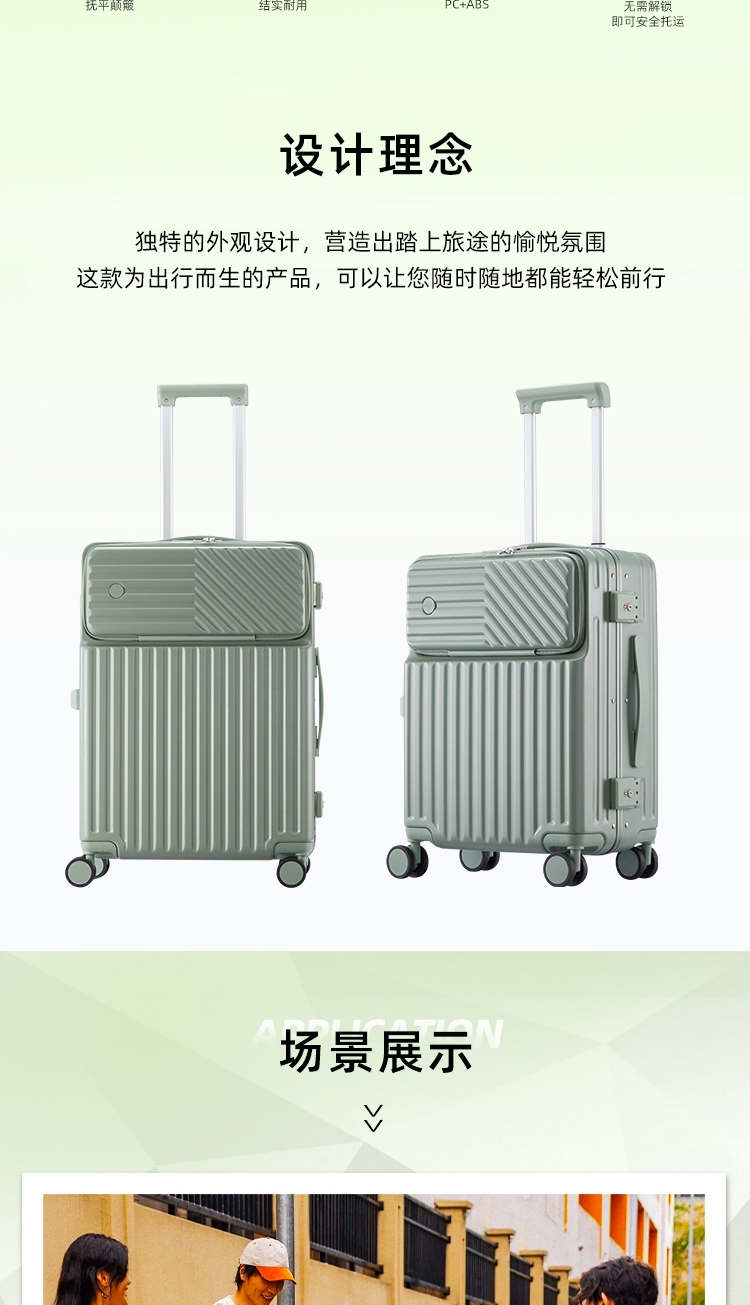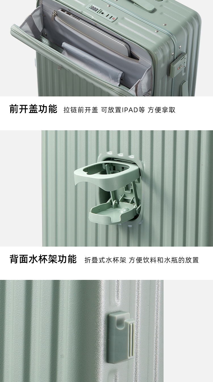 360度随心顺滑轻音减震飞机轮;拉链前开盖,可放置ipad等,方便拿取;侧边加固挂钩,小包小袋不再勒手