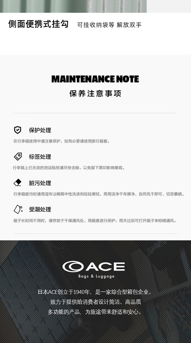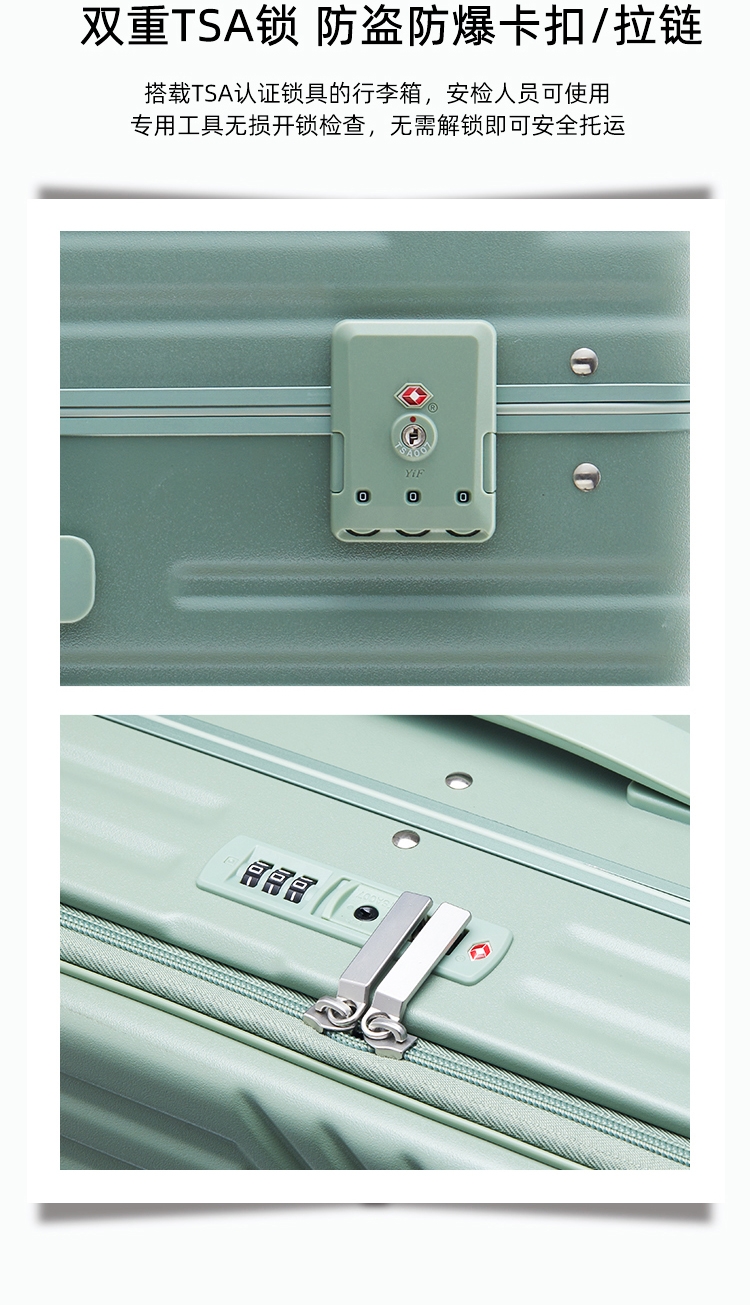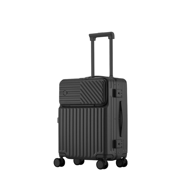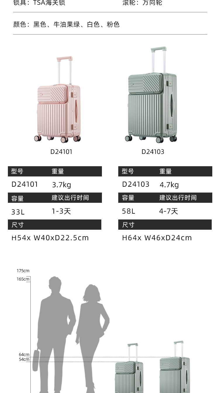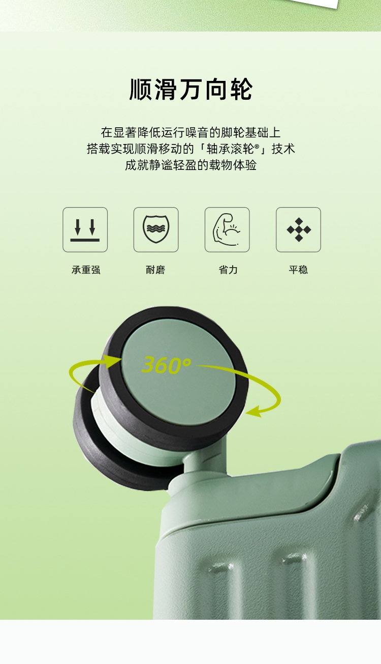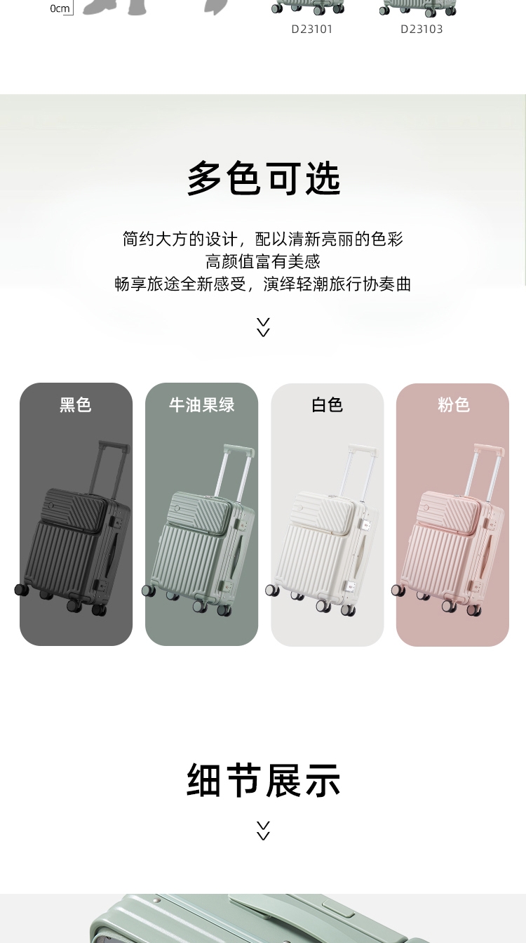 360度随心顺滑轻音减震飞机轮;拉链前开盖,可放置ipad等,方便拿取;侧边加固挂钩,小包小袋不再勒手