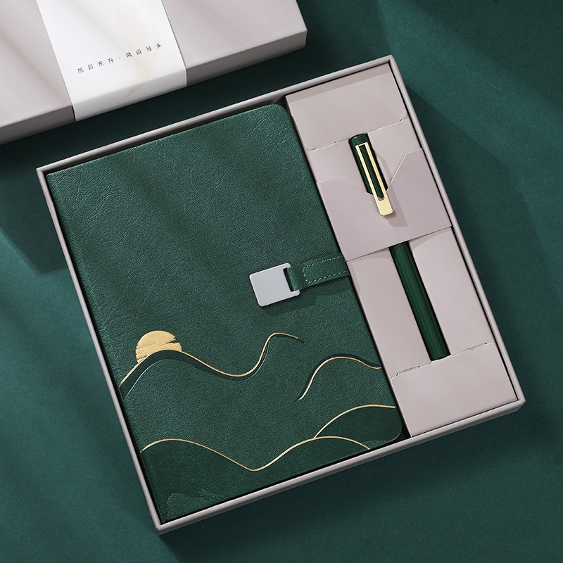 深绿皮革封面配金色线条,优雅设计彰显高端质感;绿色笔身搭配金色笔夹,风格统一提升书写体验;精美礼盒包装精致考究,节日商务馈赠尽显品味