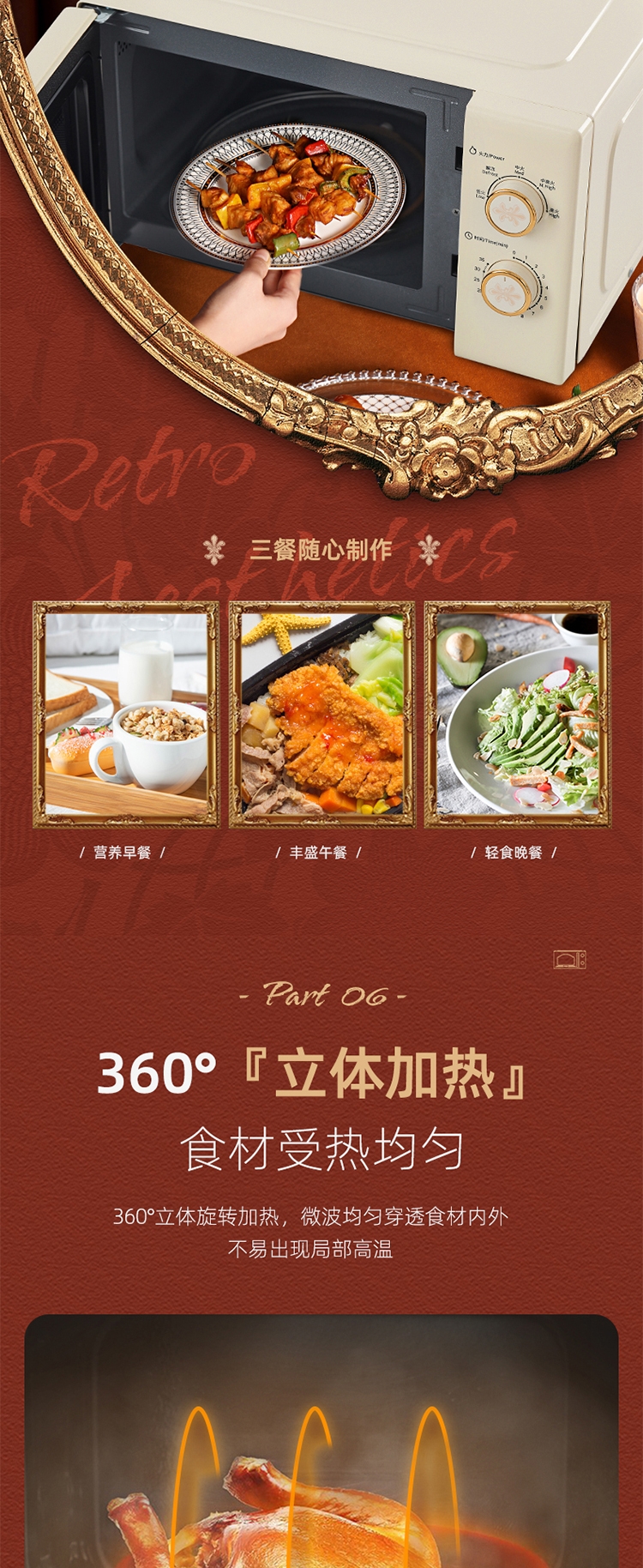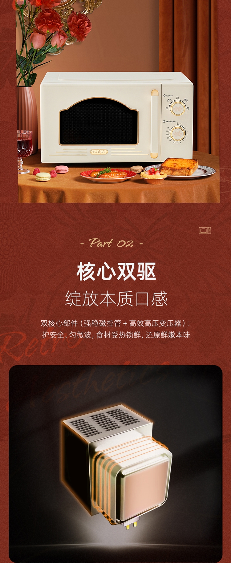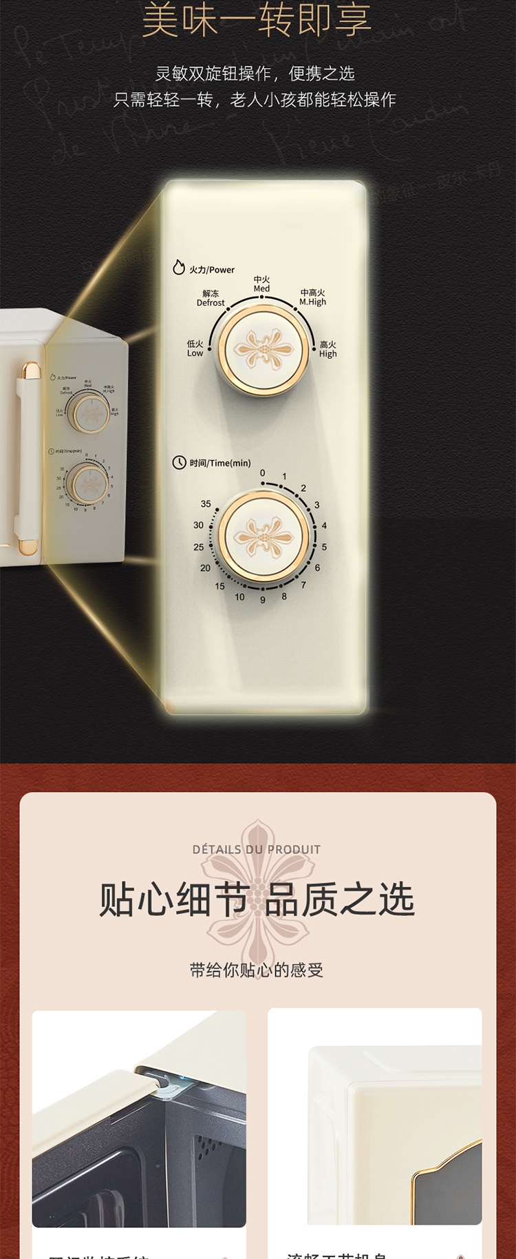 复古玻璃窗,搭配弧形曲面人性化外观,体现复古法式风;可烹饪大份量食材,多人场合也能轻松驾驭。;转盘式加热设计:加热更高效,更均匀;;符合人体工学设计,手感舒适,使用方便。;操作便捷,只需轻松一转,老人小孩都能轻松操作。