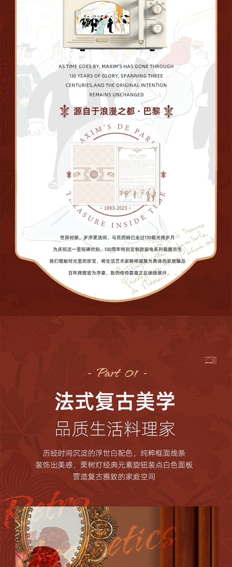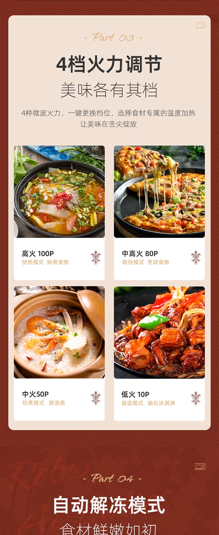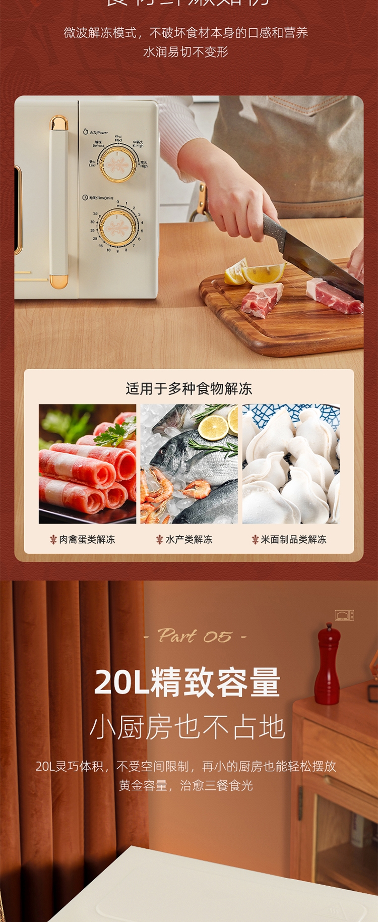 复古玻璃窗,搭配弧形曲面人性化外观,体现复古法式风;可烹饪大份量食材,多人场合也能轻松驾驭。;转盘式加热设计:加热更高效,更均匀;;符合人体工学设计,手感舒适,使用方便。;操作便捷,只需轻松一转,老人小孩都能轻松操作。