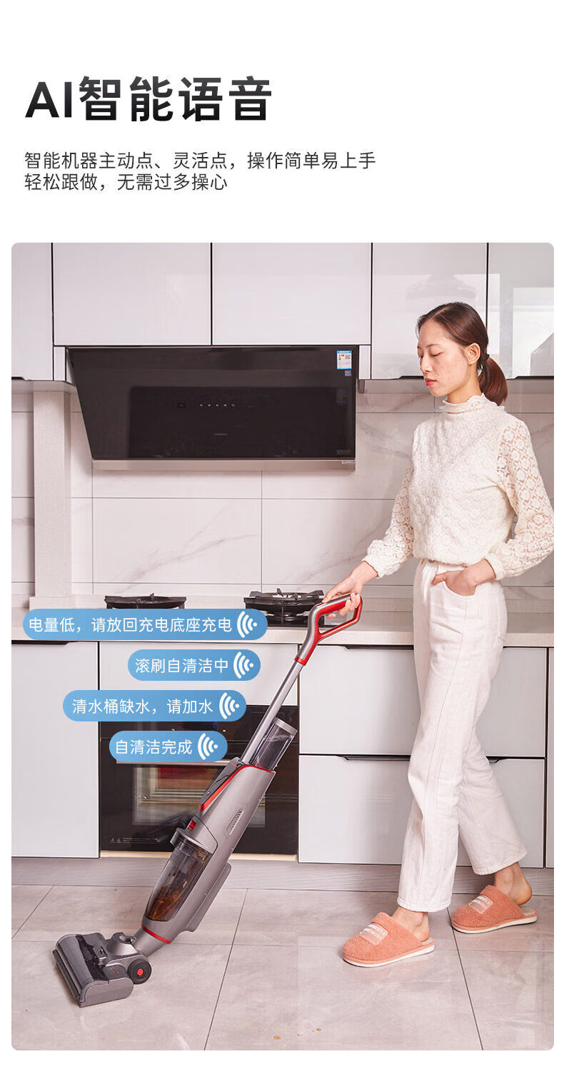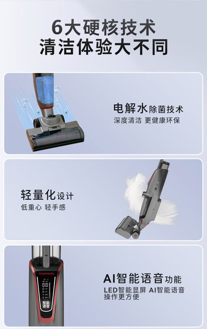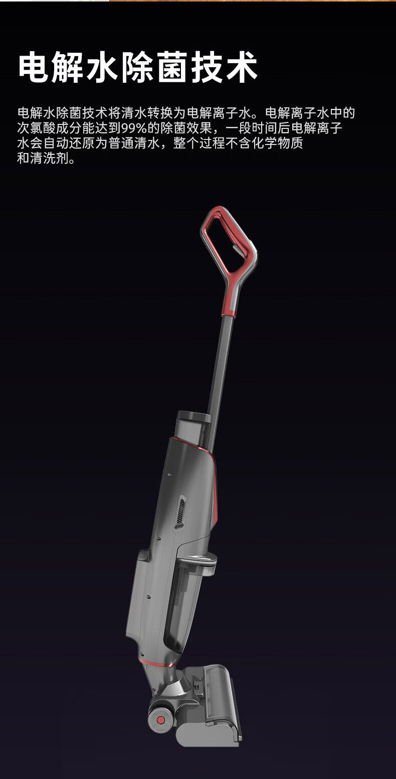 轻量化设计, 轻松更省力。;电解水除菌,洗脱洗一步到位。; AI 智能语音功能,操作更方便。; 智能LED显示屏,实时精准展示整机状态。