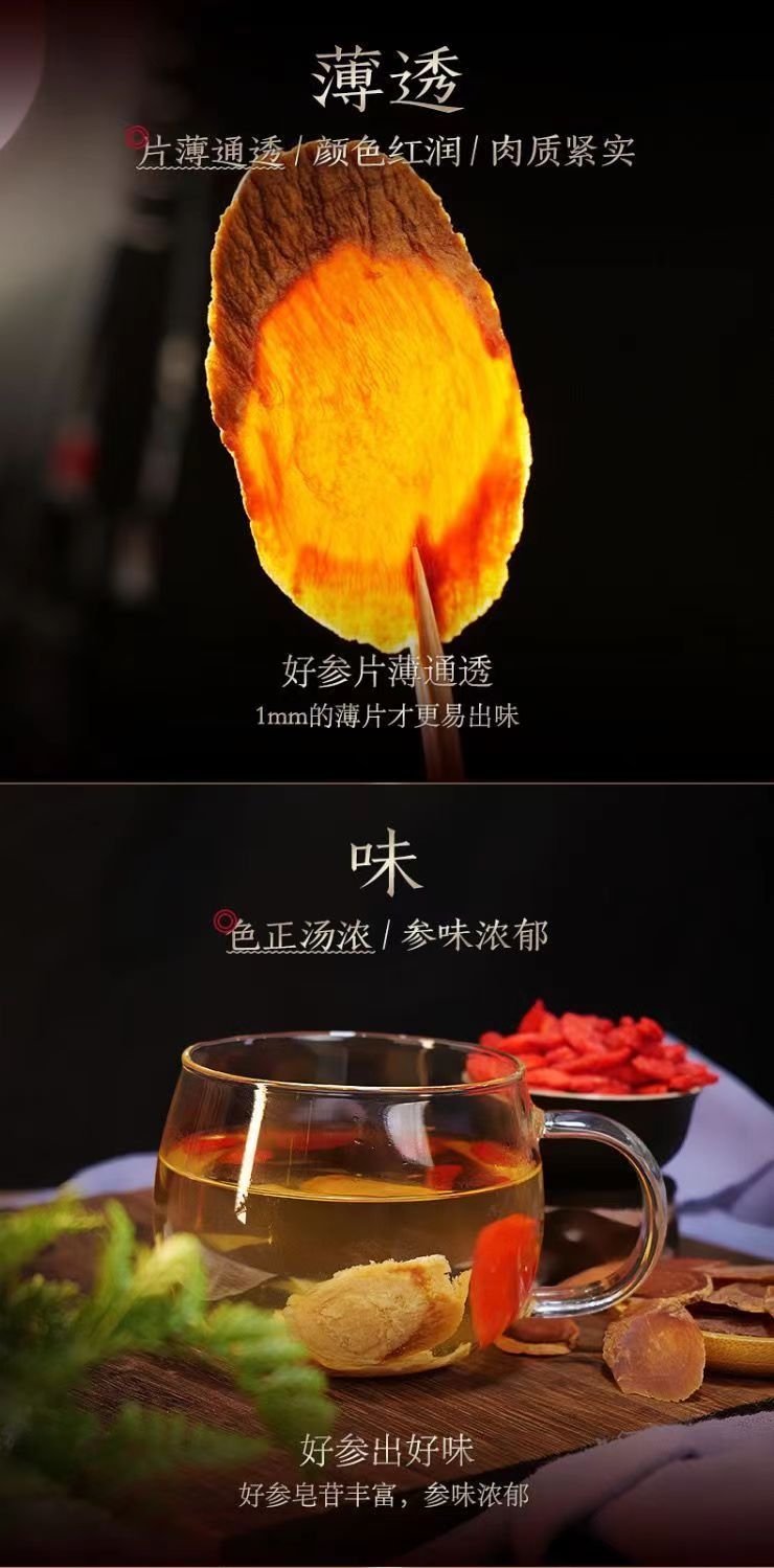 送礼自用两相宜;片薄通透,质实玲珑;皂苷丰富,参味浓郁
