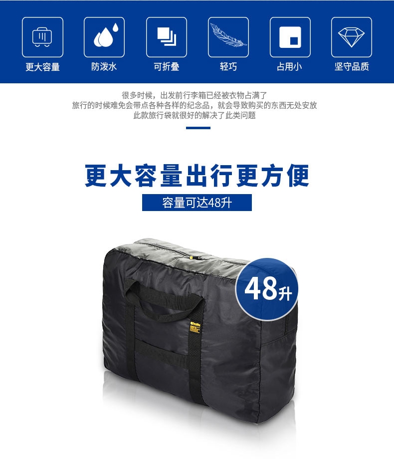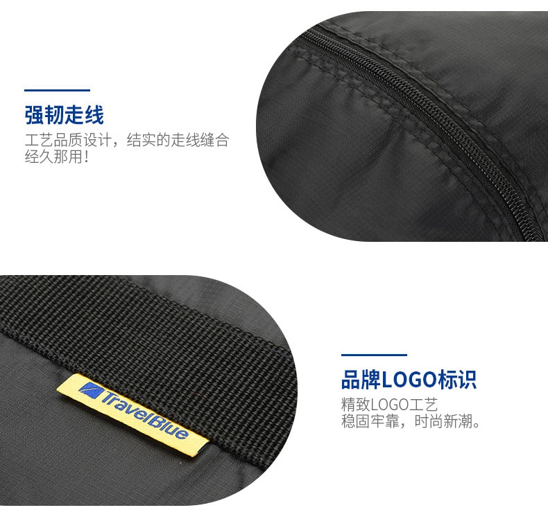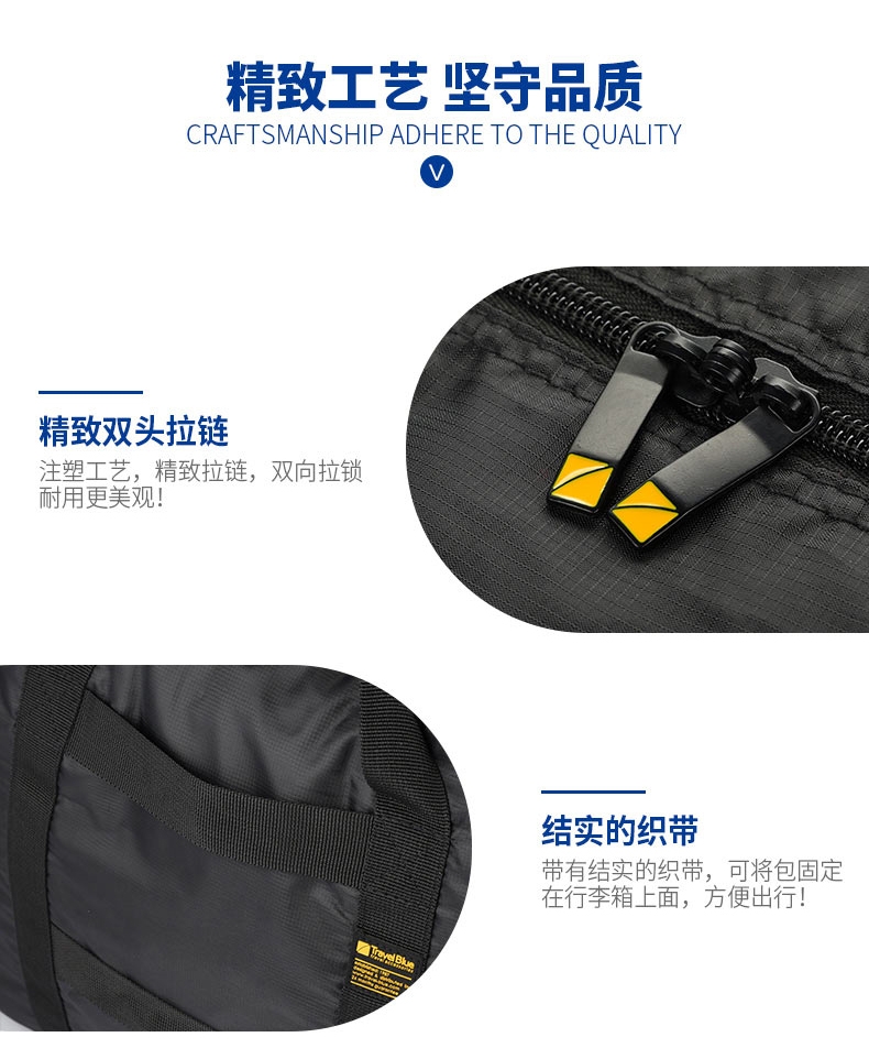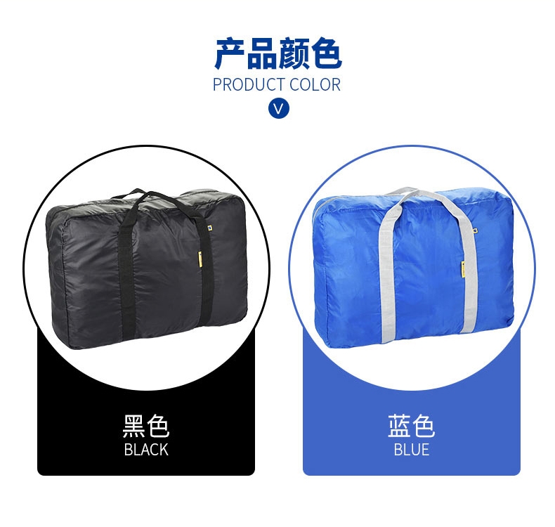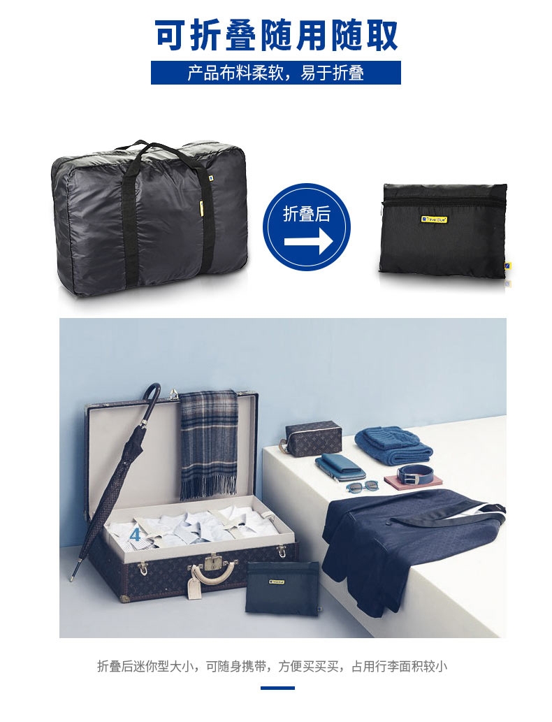 可折叠进自有口袋里便于储存;带有结实的织带可将包固定在行李箱上,方便出行;材质轻便,100%聚酯纤维制成