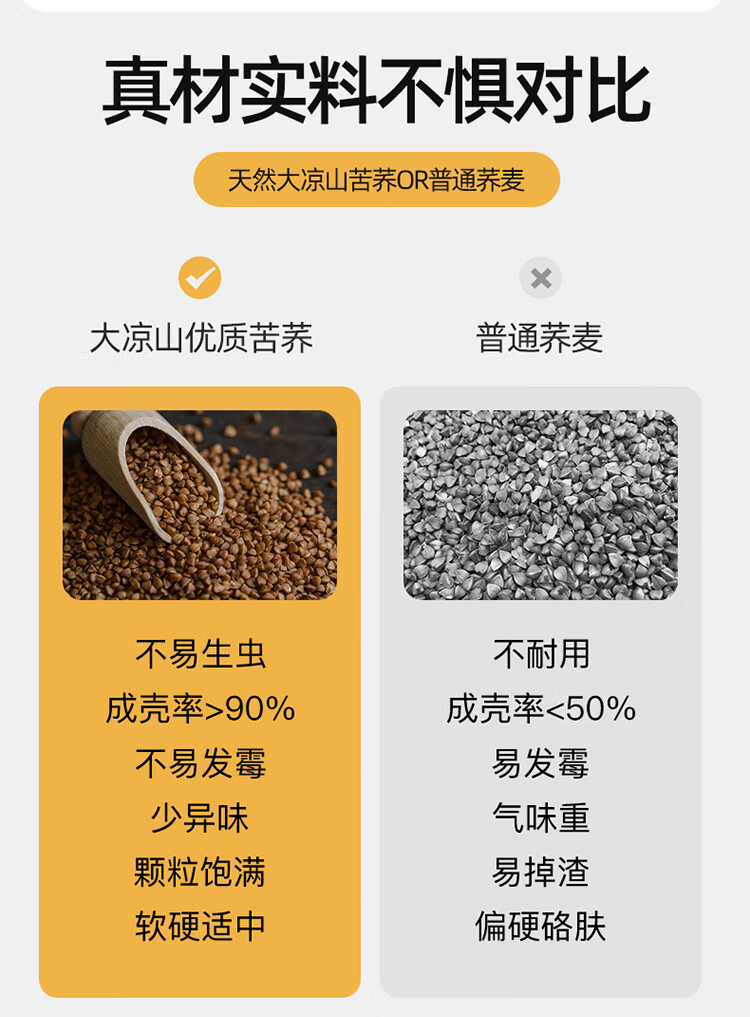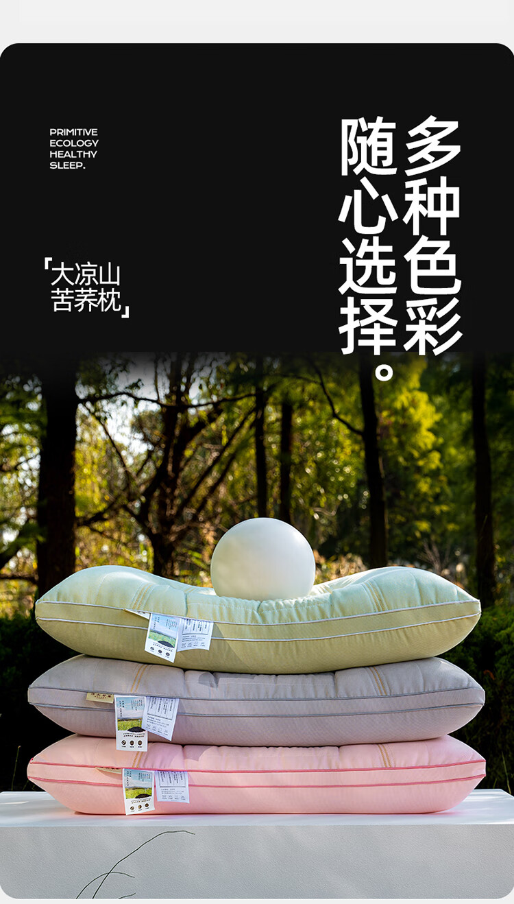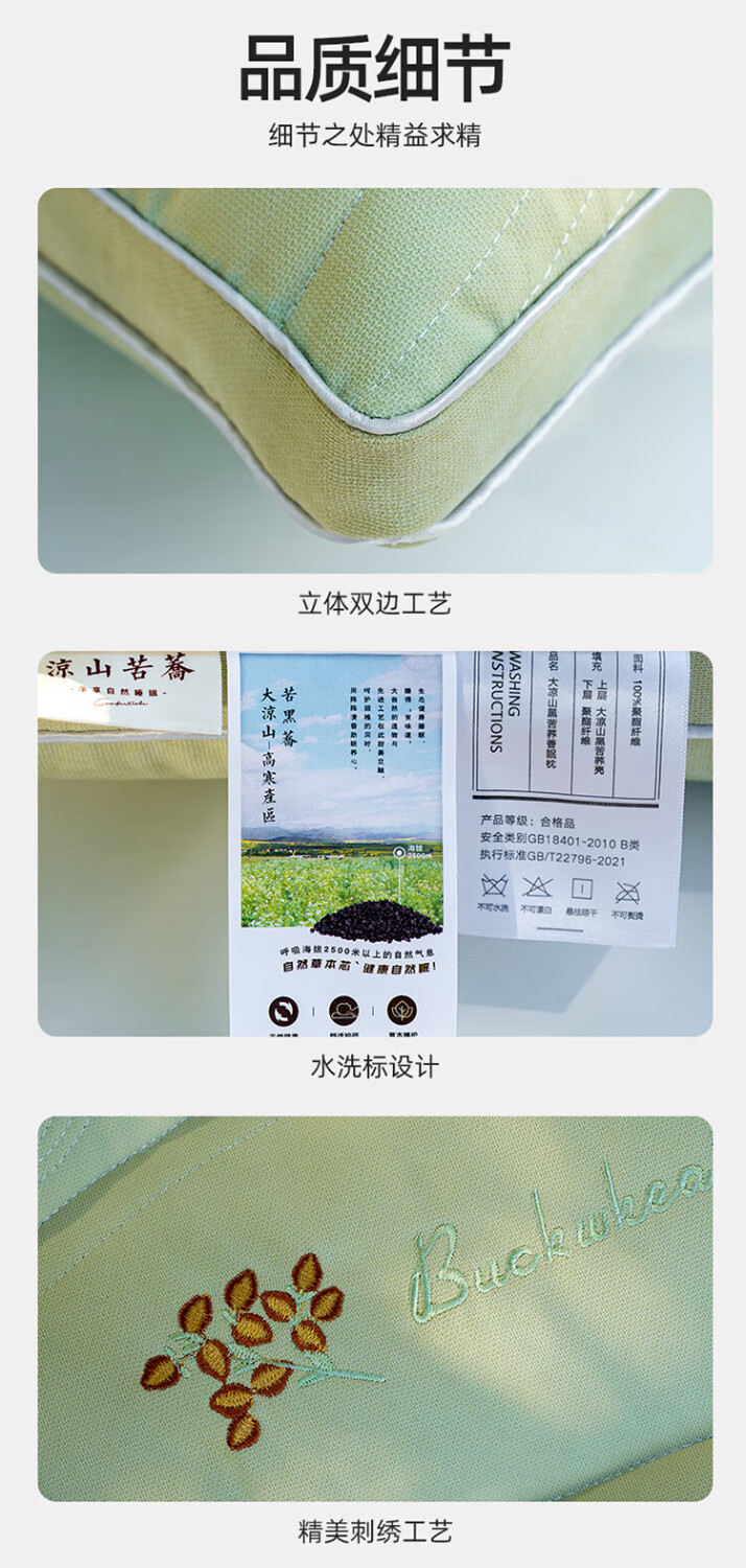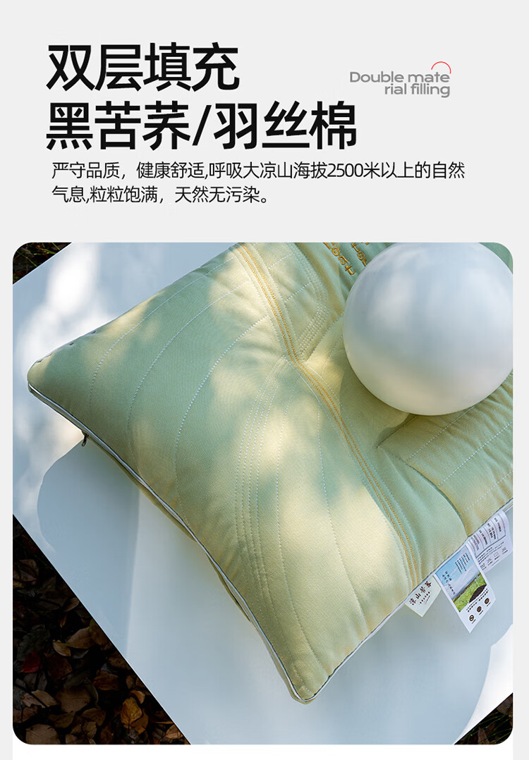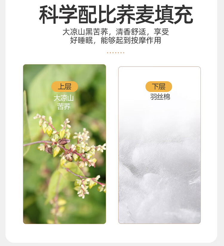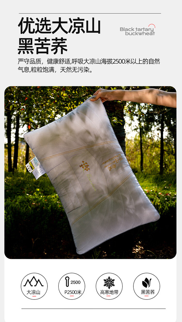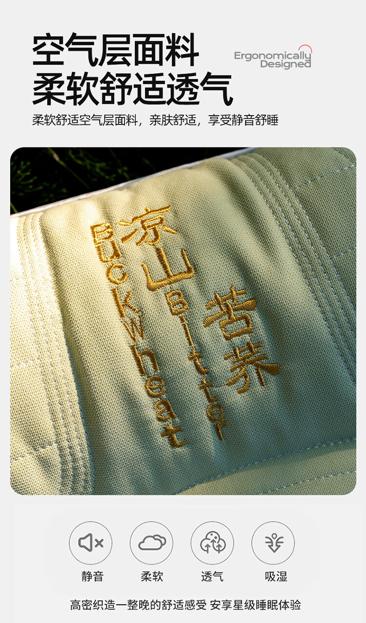 优选大凉山黑苦荞填充物,颗粒饱满,天然无污染;科学配比荞麦填充。清香舒适,享受好睡眠;分区支撑设计,360度贴合符合人体工学;空气层面料,柔软舒适透气