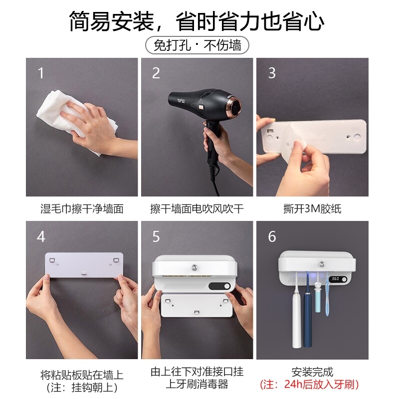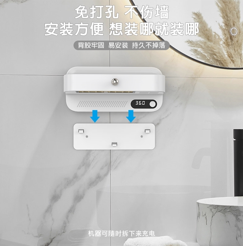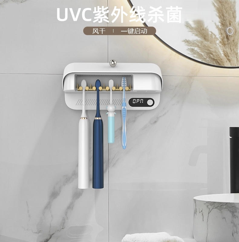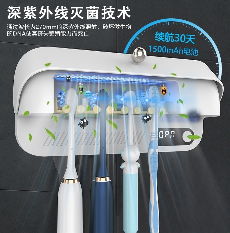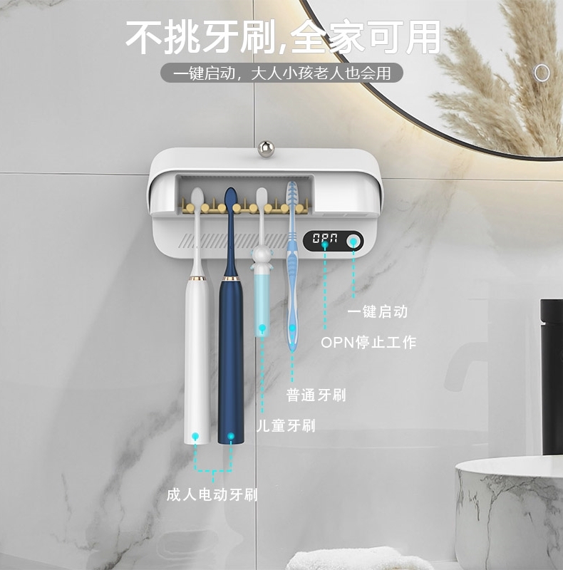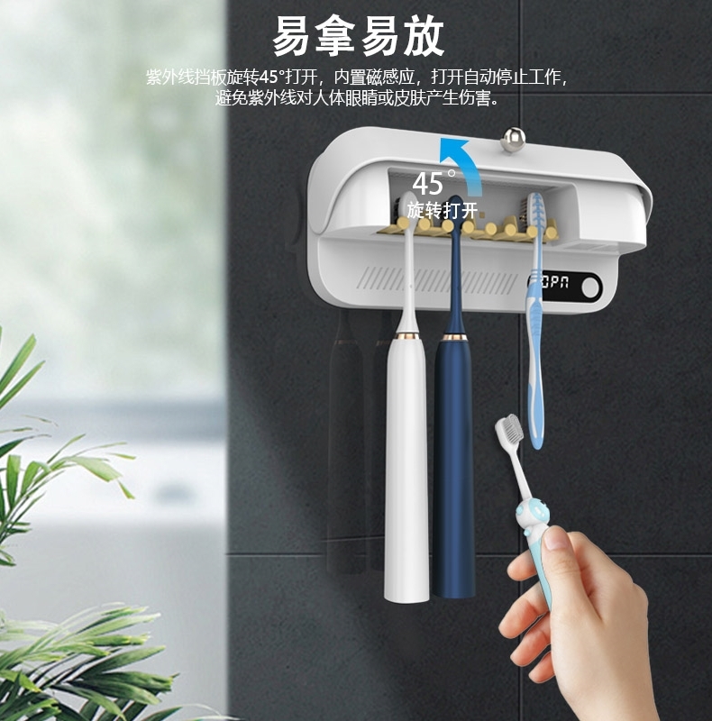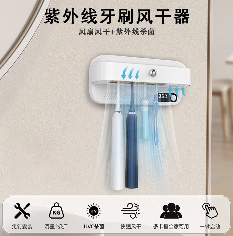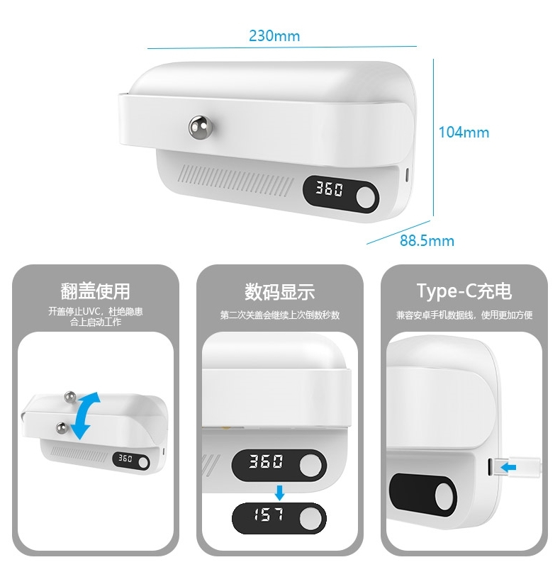 4颗UVC灯珠高效杀菌,一键启动即实现深紫外线杀菌;智能风干杀菌二合一,6分钟同步运行,结束后自动关机;涡轮强风快速风干,迅速带走水分,保持物品干爽状态;免打孔+多方式充电,内置大容量电池,安装灵活;挡板开启即自动停止,防止紫外线泄露,安全可靠