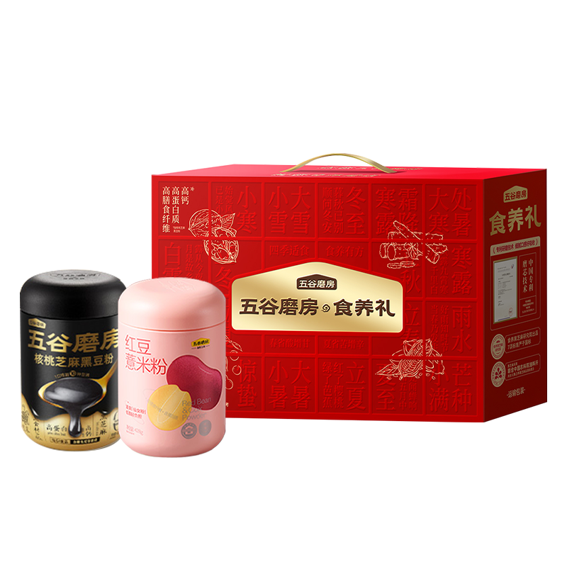 配置清单:1、核桃芝麻黑豆粉428gx1罐 2、红豆薏米粉428gx1罐 注:五谷磨房-食养礼礼盒856g(核桃芝麻黑豆粉+红豆薏米粉)