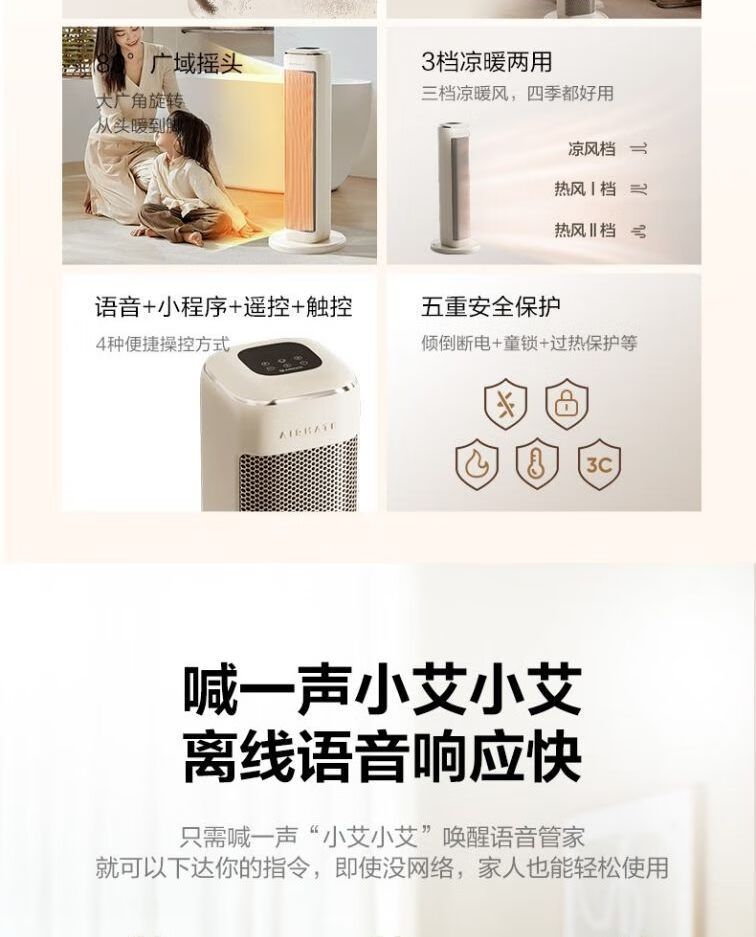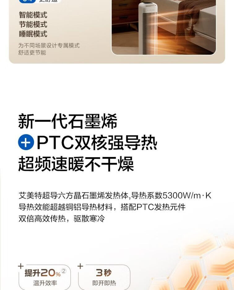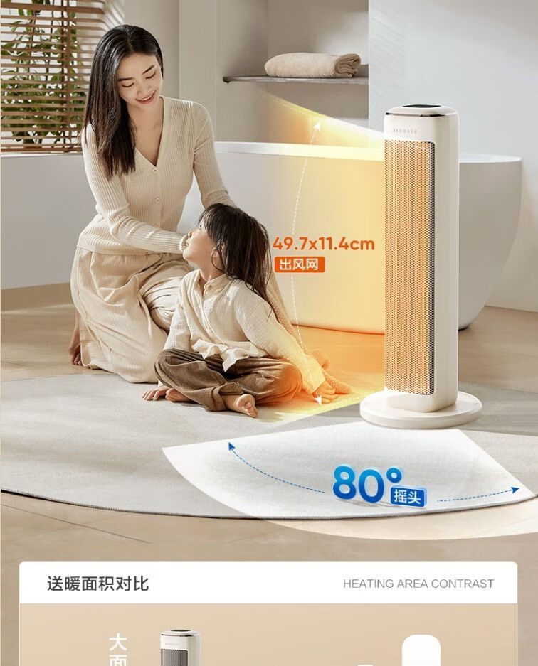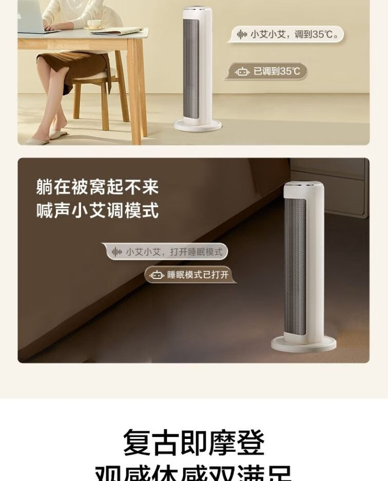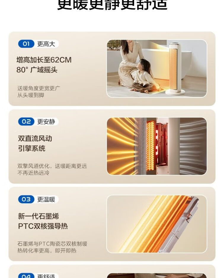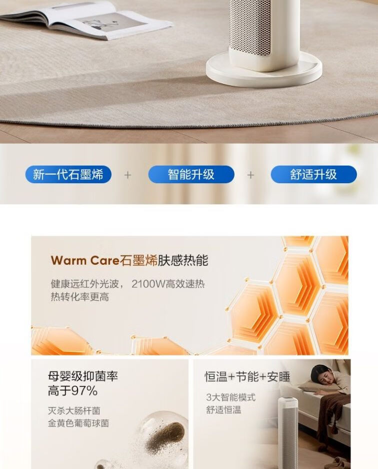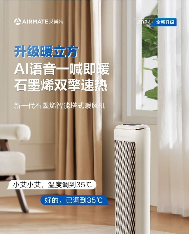 2024款全新升级,石墨烯涂层;80度广域摇头,智能+节能+睡眠三大模 式;遥控、触屏、语音、蓝牙多种操控模式