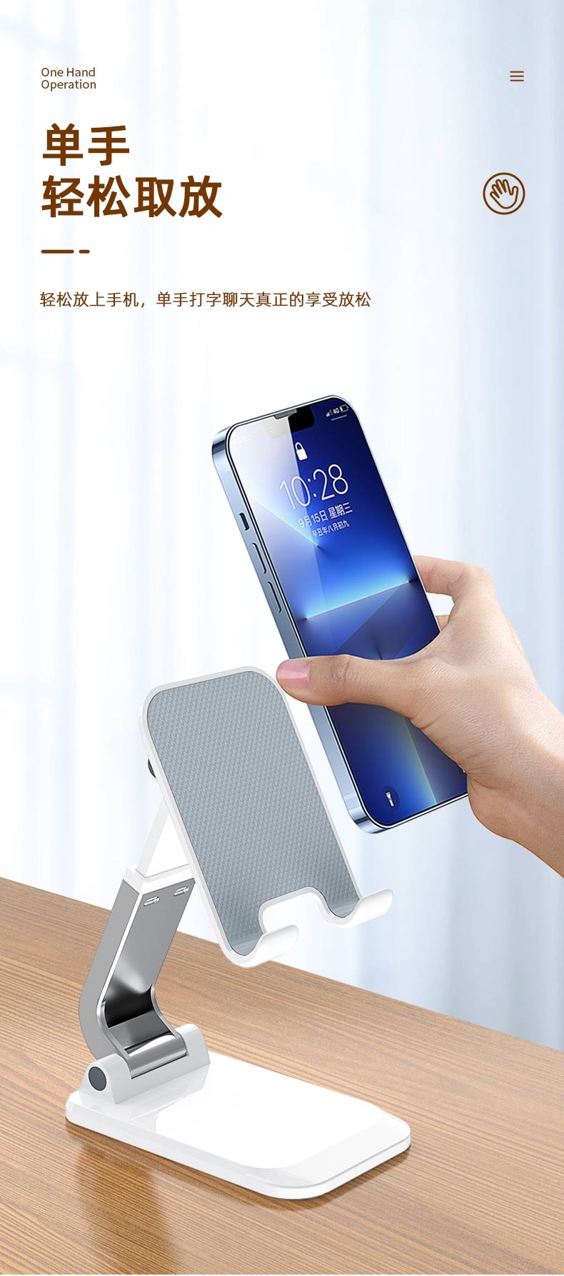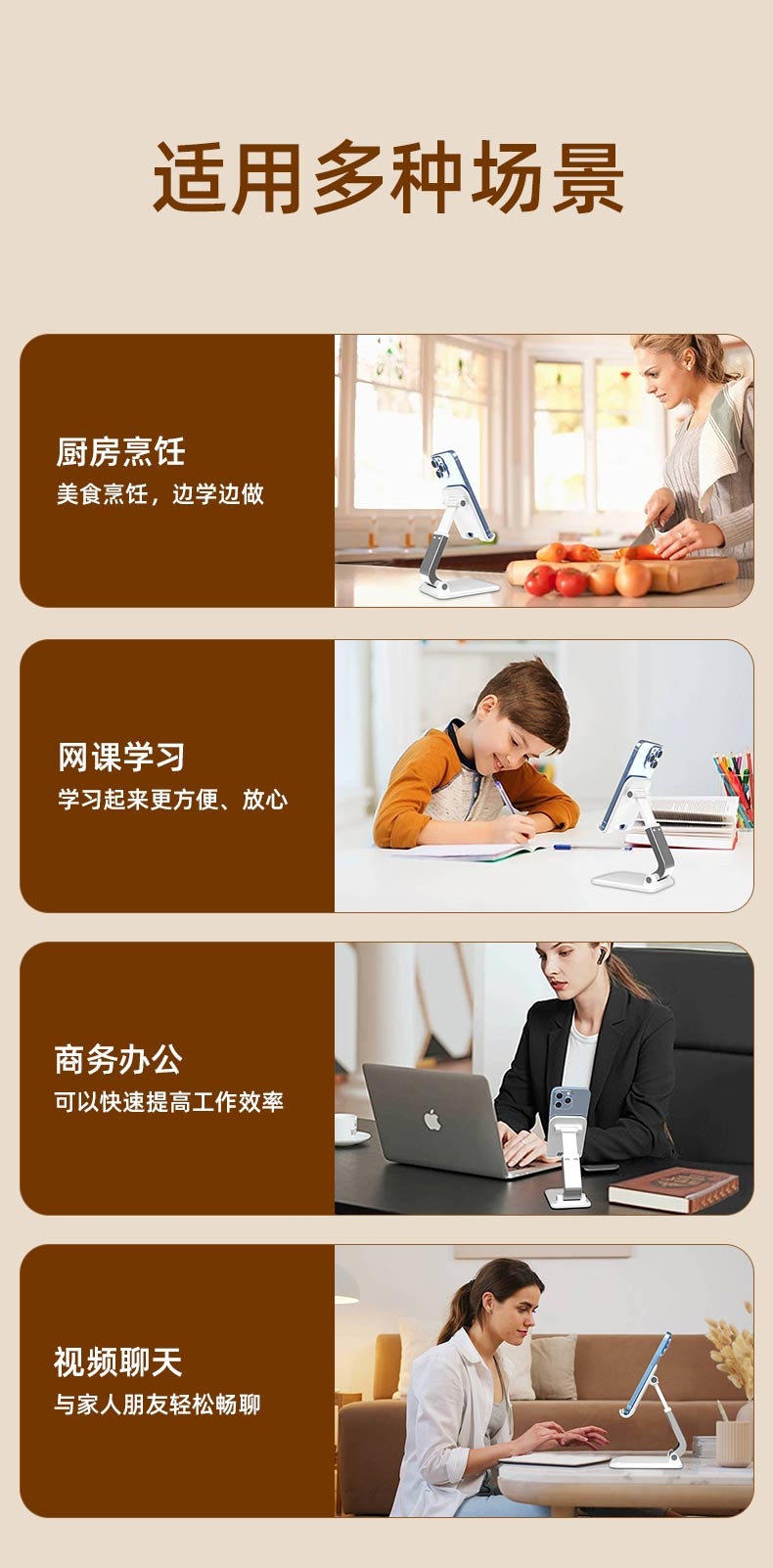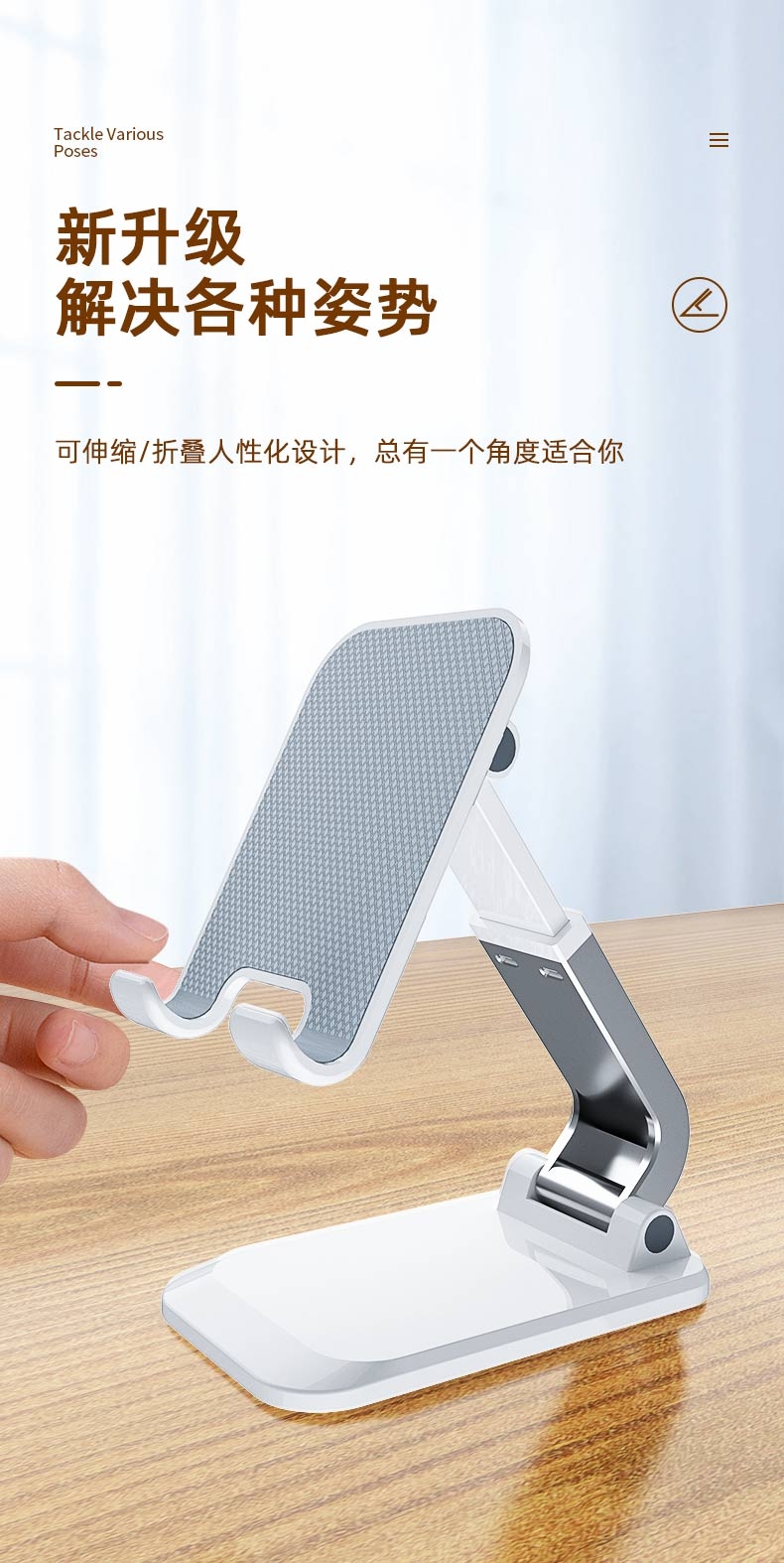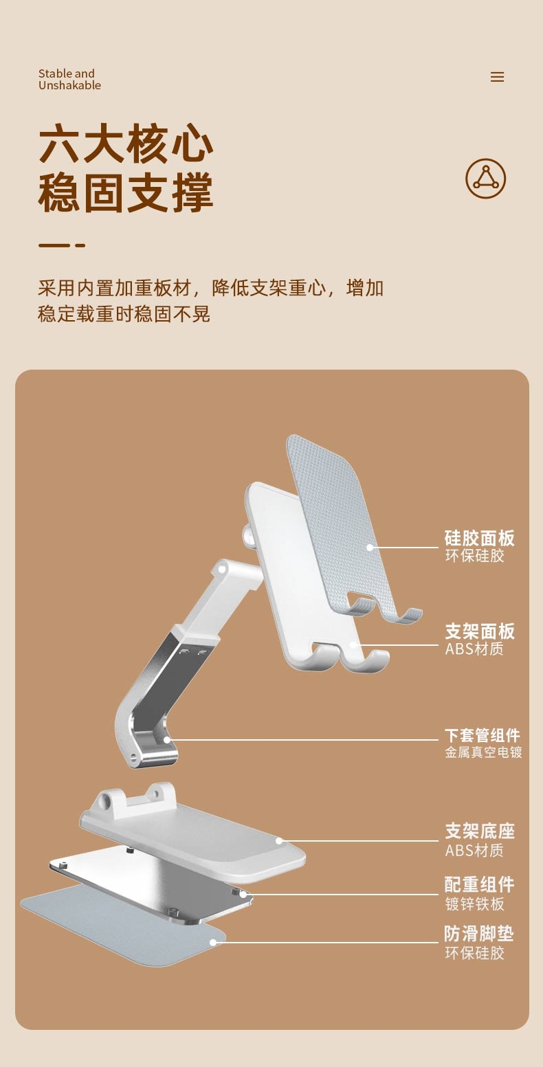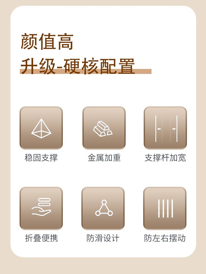稳固防滑 不易晃动;一体式折叠 出门更便捷;高度可升降 多角度调节固定
