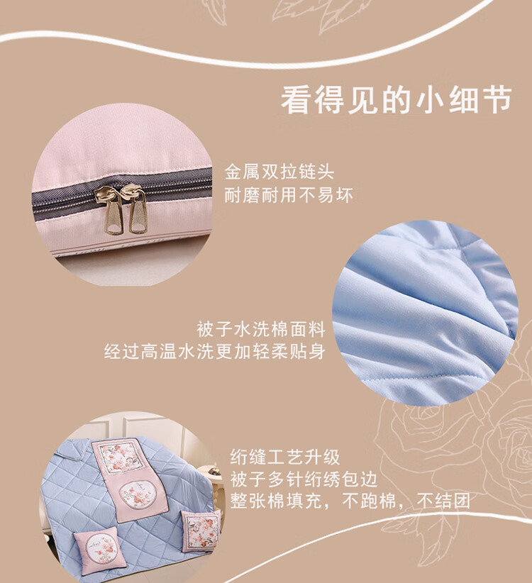 换一种拥抱的方式,看得见的小细节, 金属双拉链头;耐磨耐用不易坏, 数码印花高温热转印;颜色鲜艳不易褪色 ,绗缝工艺升级;被子多针绗绣包边,整张pp棉填充,不跑棉不结团