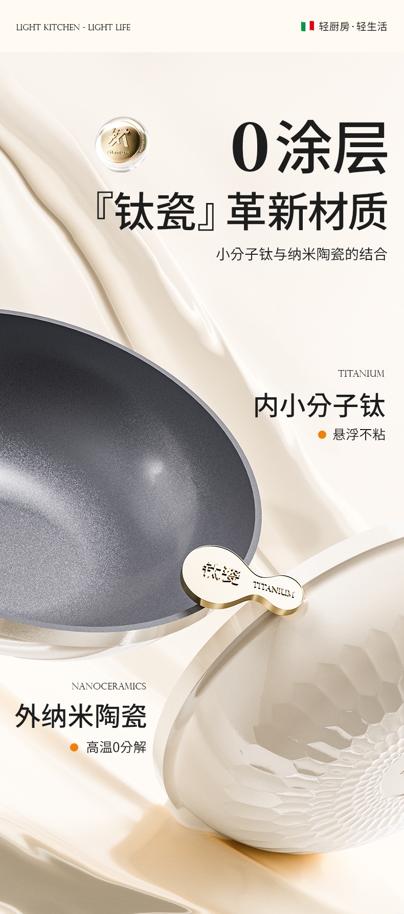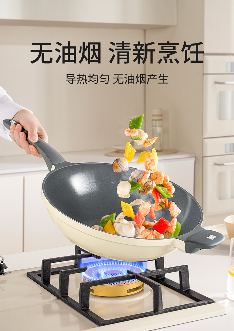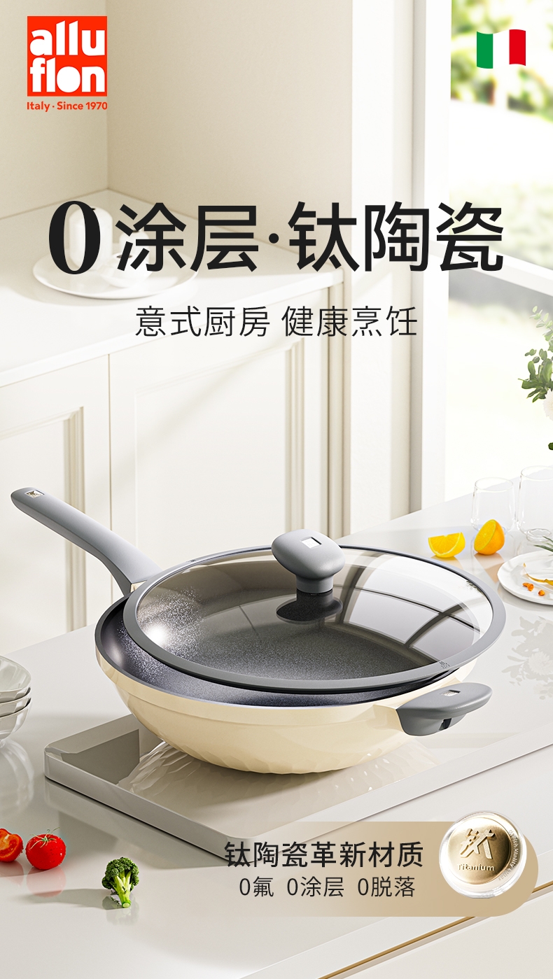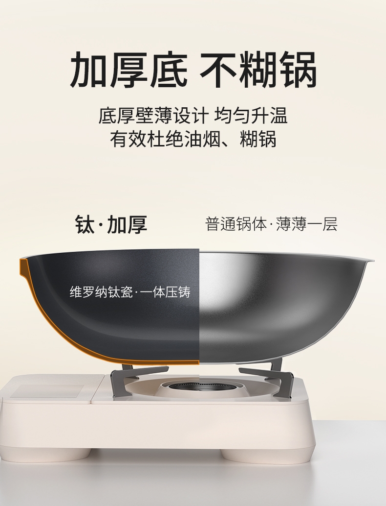 外壁奶黄色陶瓷,免手洗,一擦净,不易烧黑;钛瓷内涂健康母婴可用,少油少脂少油烟健康不粘;底部专属意式穹顶花纹设计,美观防滑;锅底运用冷熔射技术,适用于电磁炉等多种热源;无铆钉;优质合金,传热均匀快速,少油清新烹饪,引领健康生活
