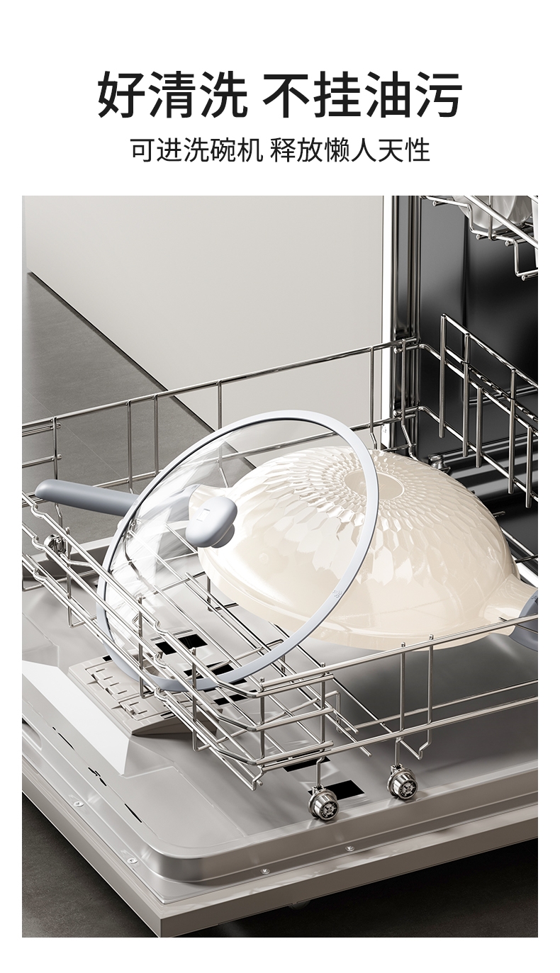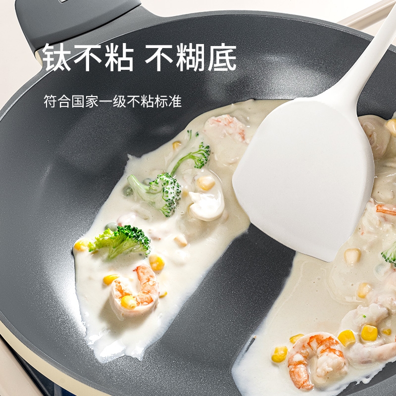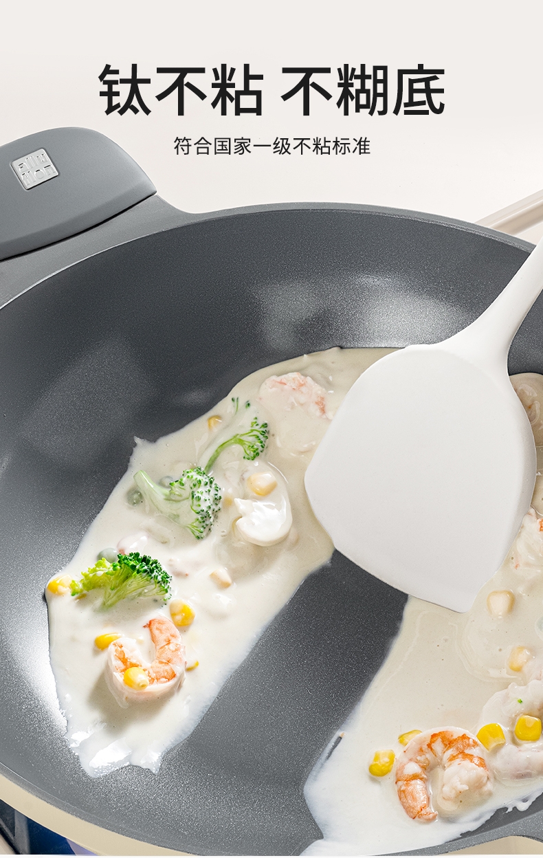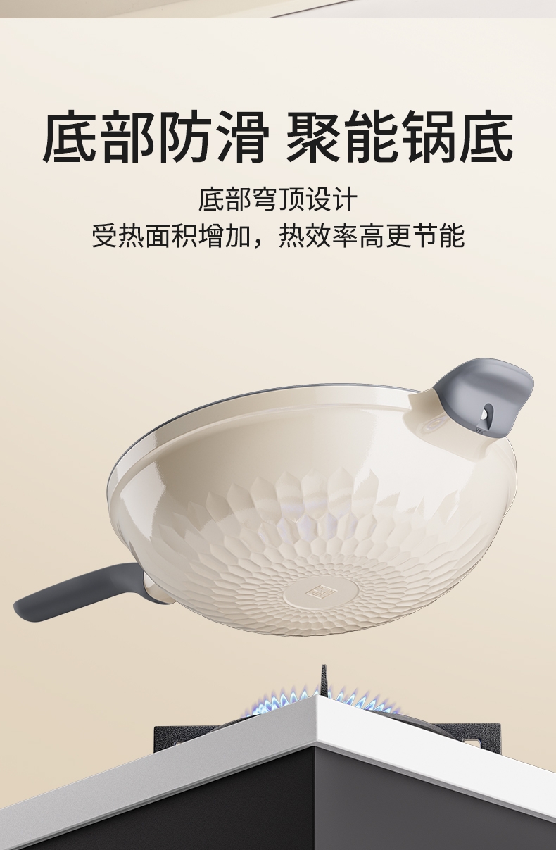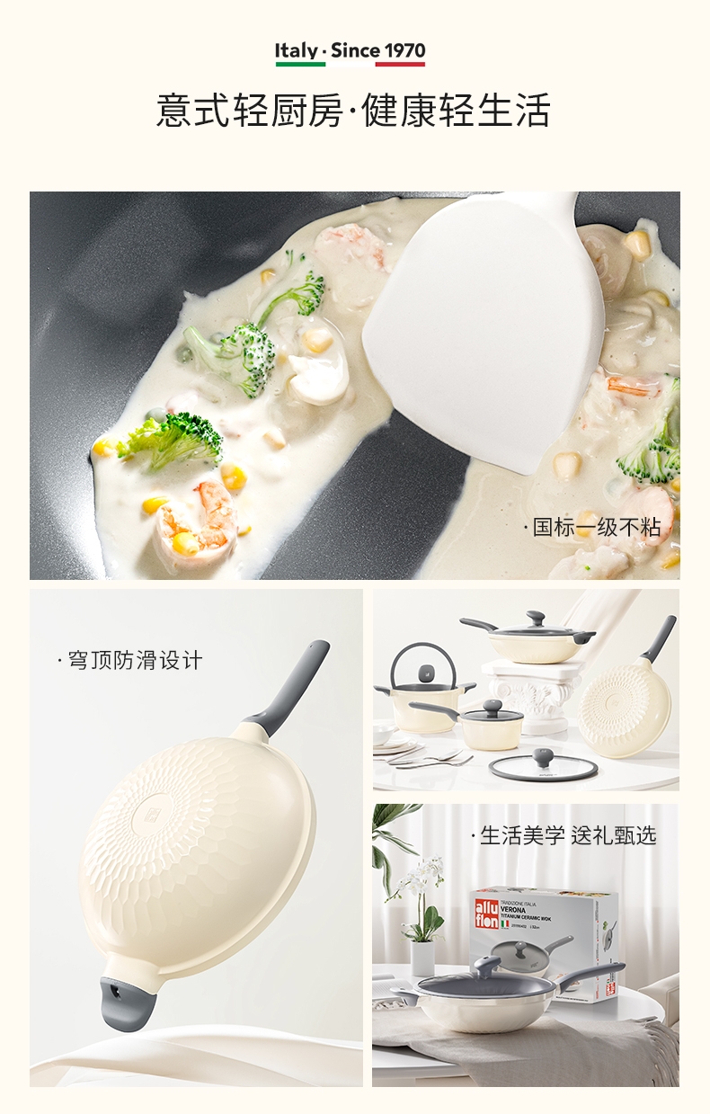 外壁奶黄色陶瓷,免手洗,一擦净,不易烧黑;钛瓷内涂健康母婴可用,少油少脂少油烟健康不粘;底部专属意式穹顶花纹设计,美观防滑;锅底运用冷熔射技术,适用于电磁炉等多种热源;无铆钉;优质合金,传热均匀快速,少油清新烹饪,引领健康生活