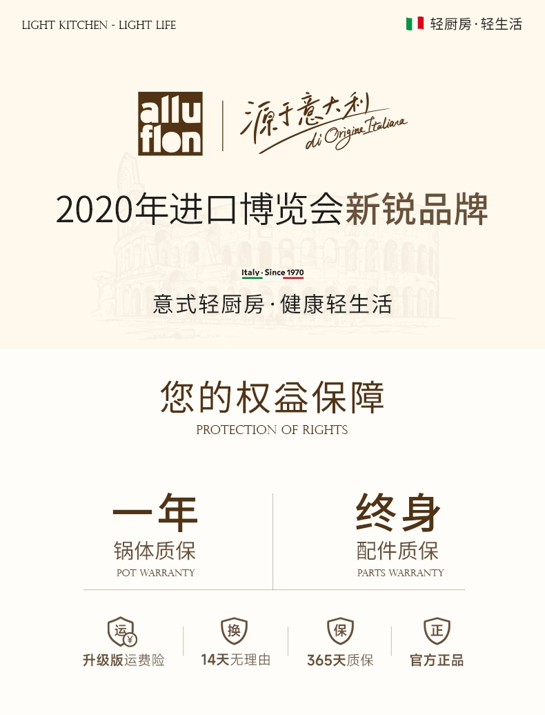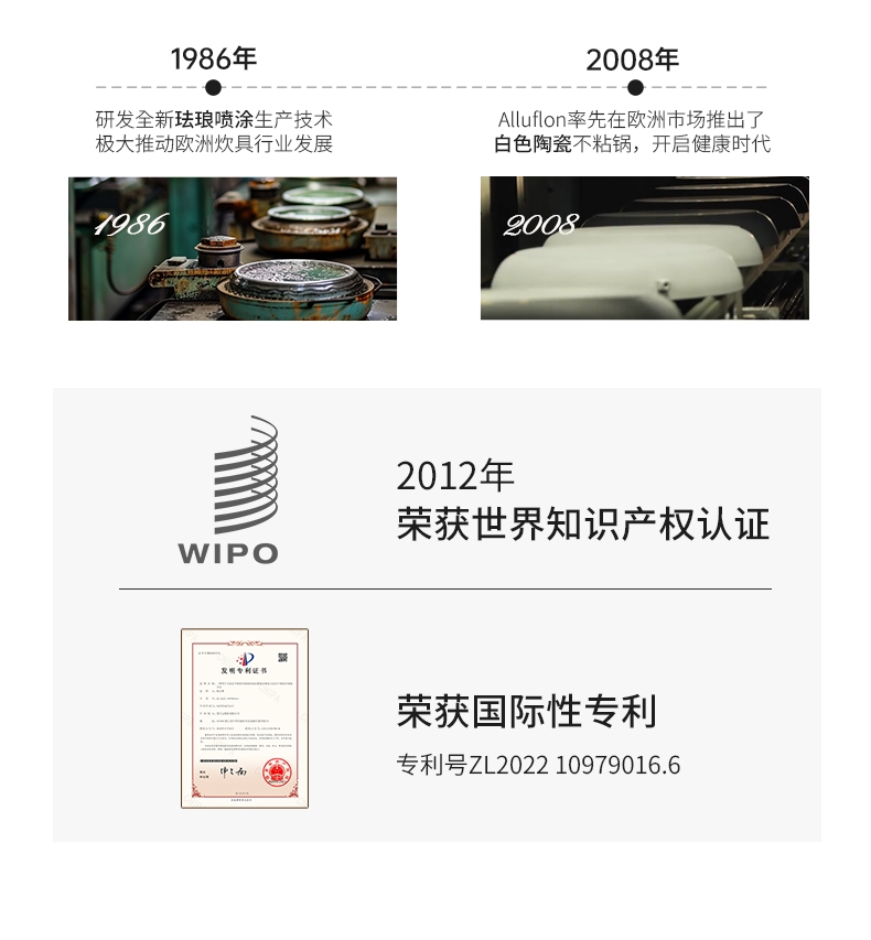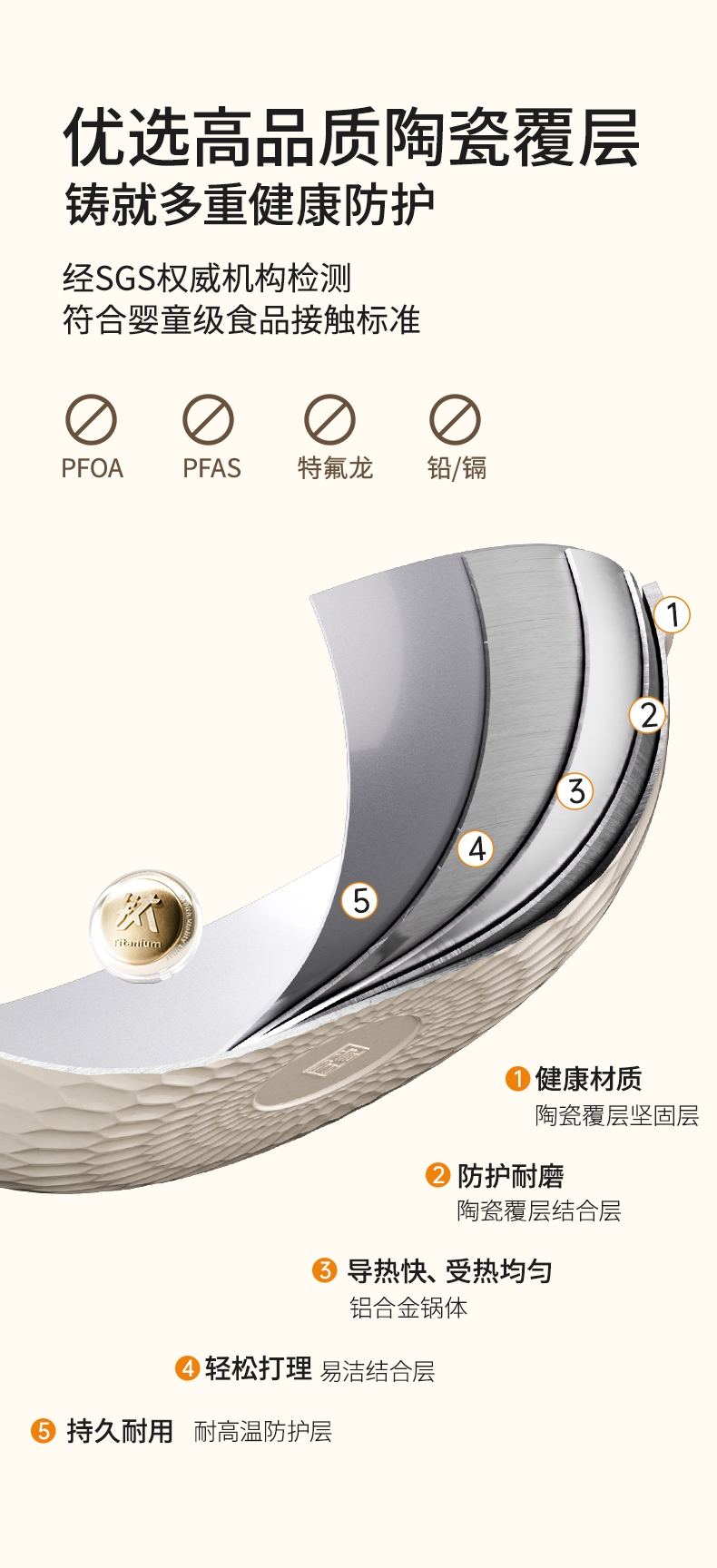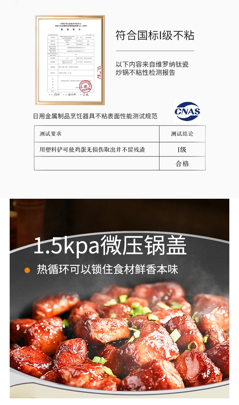 外壁奶黄色陶瓷,免手洗,一擦净,不易烧黑;钛瓷内涂健康母婴可用,少油少脂少油烟健康不粘;底部专属意式穹顶花纹设计,美观防滑;锅底运用冷熔射技术,适用于电磁炉等多种热源;无铆钉;优质合金,传热均匀快速,少油清新烹饪,引领健康生活