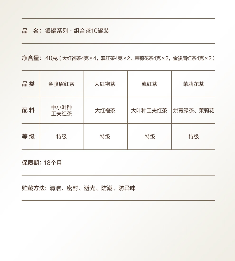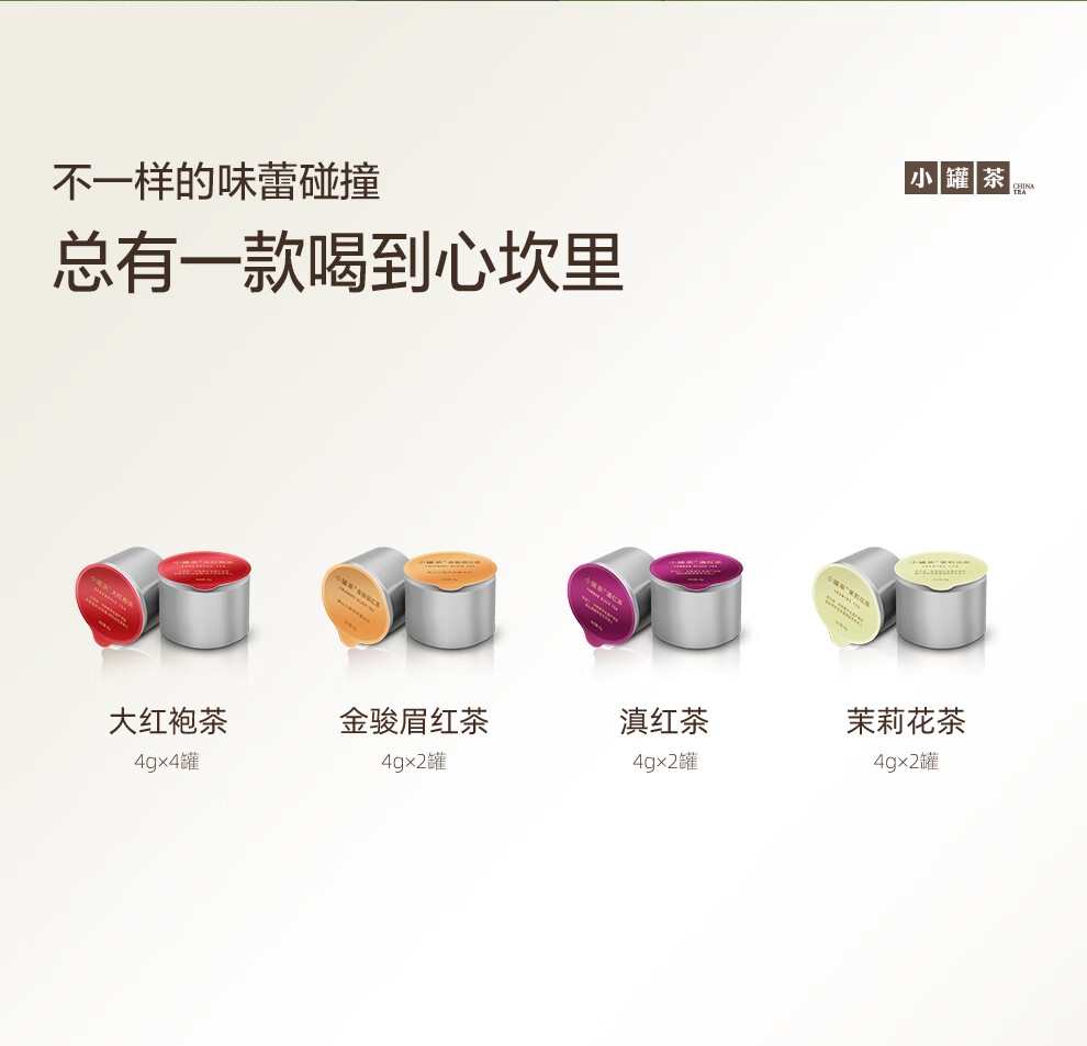 配置清单:大红袍茶4克x4、茉莉花茶4克x2、滇红茶4克x2、金骏眉红茶4克x2