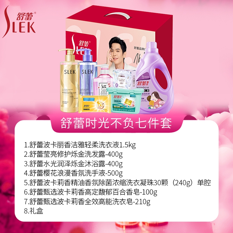 配置清单:1、舒蕾波卡莉香洁雅轻柔洗衣液1.5KG*1 2、舒蕾莹亮修护烁金洗发露-400g*1 3、舒蕾水光润泽烁金沐浴露-400g*1 4、舒蕾樱花浪漫香氛洗手液-500g*1 5、舒蕾波卡莉香精油香氛除菌浓缩洗衣凝珠30颗(240g)*1 6、舒蕾甄选波卡莉香高定馥郁百合香皂-100g*1 7、舒蕾甄选波卡莉香全效高能洗衣皂-210g*1 8、礼盒*1