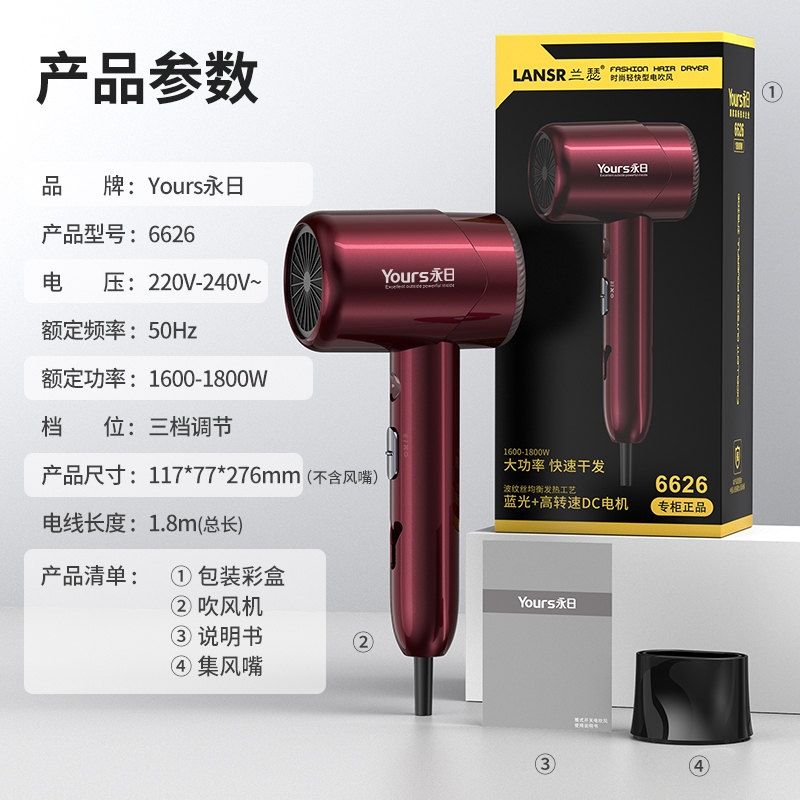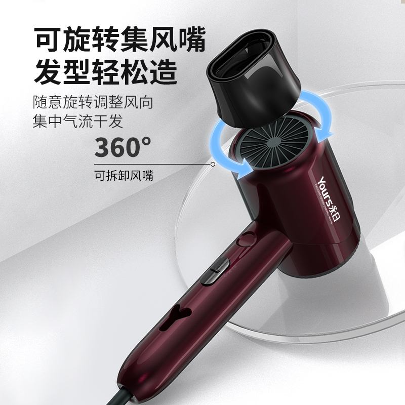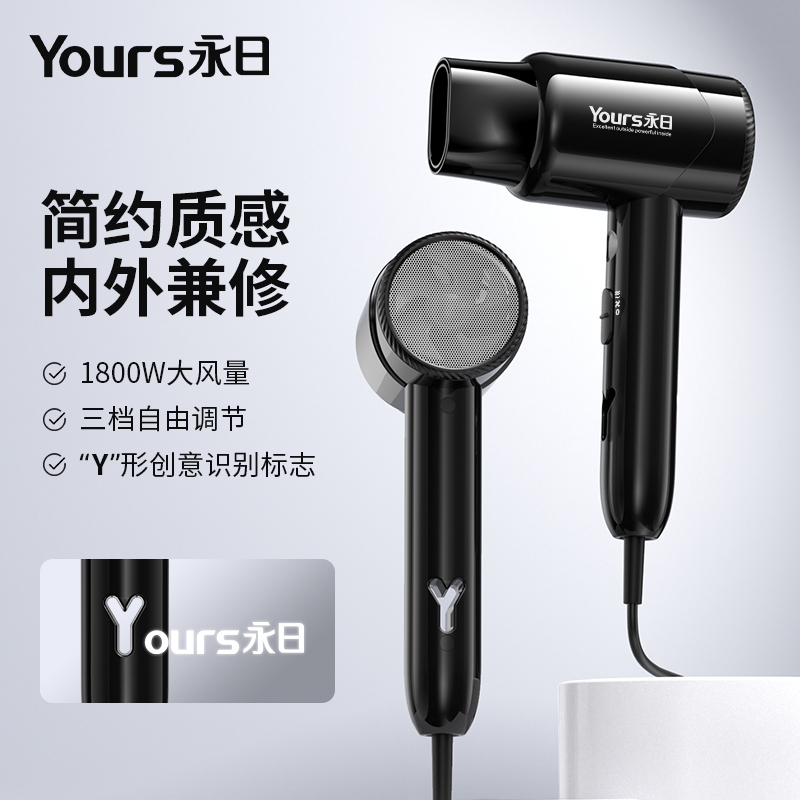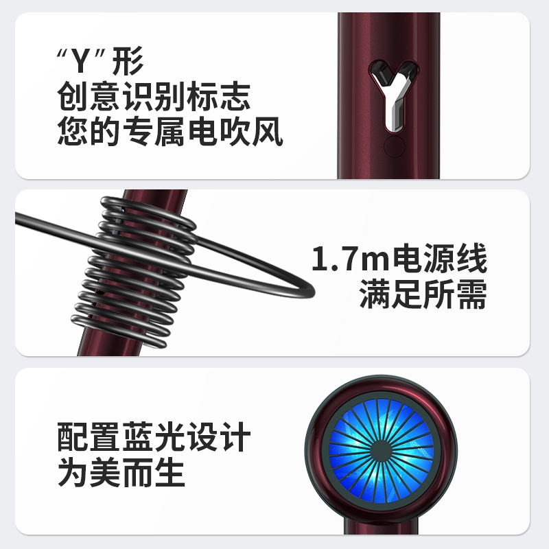 炫酷蓝光设计 + “Y”形创意识别标志;;大功率电机,风力更加强劲;;360°旋转防烫集风嘴+外盒热塑膜保护。