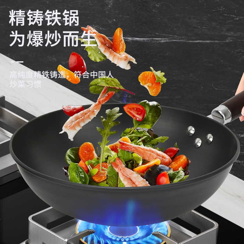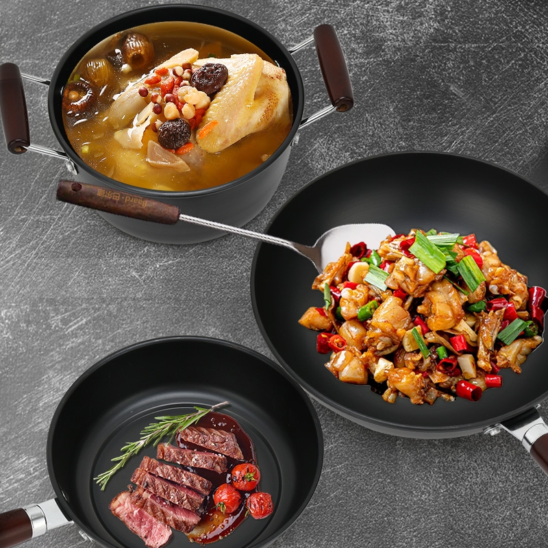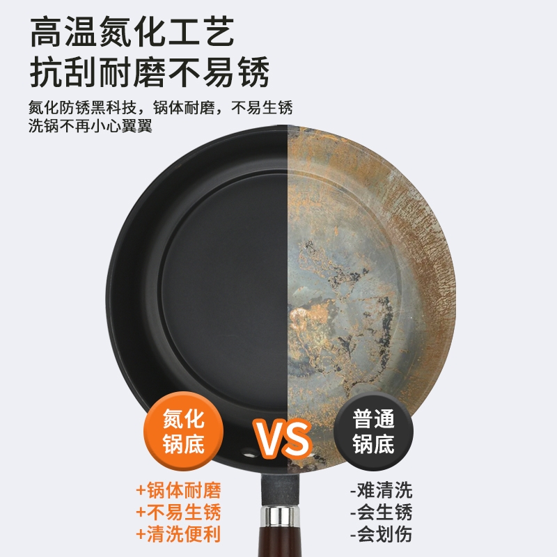 锅体采用优质精密铁离子基材,传热更快,受热均匀;特有的气氮氧化技术,表面微晶处理,不易生锈,不易穿;天然原木隔热防烫手柄,时尚简约